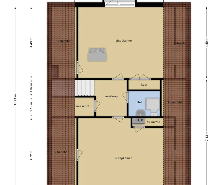 Eerste verdieping: op de eerste verdieping bevinden zich twee royale slaapkamers, waarvan één met een balkon. Beide kamers bieden volop ruimte en zijn voorzien van praktische knieschotten, die zorgen voor extra opbergruimte zonder in te leveren op wooncomfort. Op de overloop vindt je nog een handige kast voor extra opslagmogelijkheden. Daarnaast is er op deze verdieping een apart toilet en een wastafel aanwezig. Deze ruimte kan een met een paar kleine aanpassingen als volwaardig tweede badkamer in gebruik worden genomen.