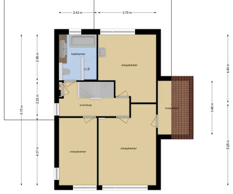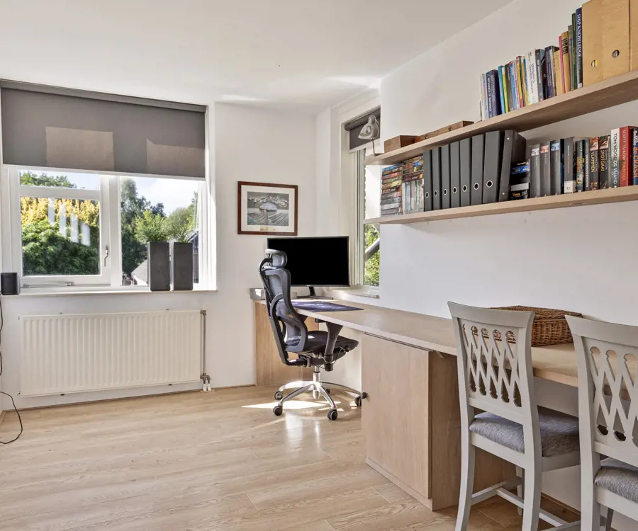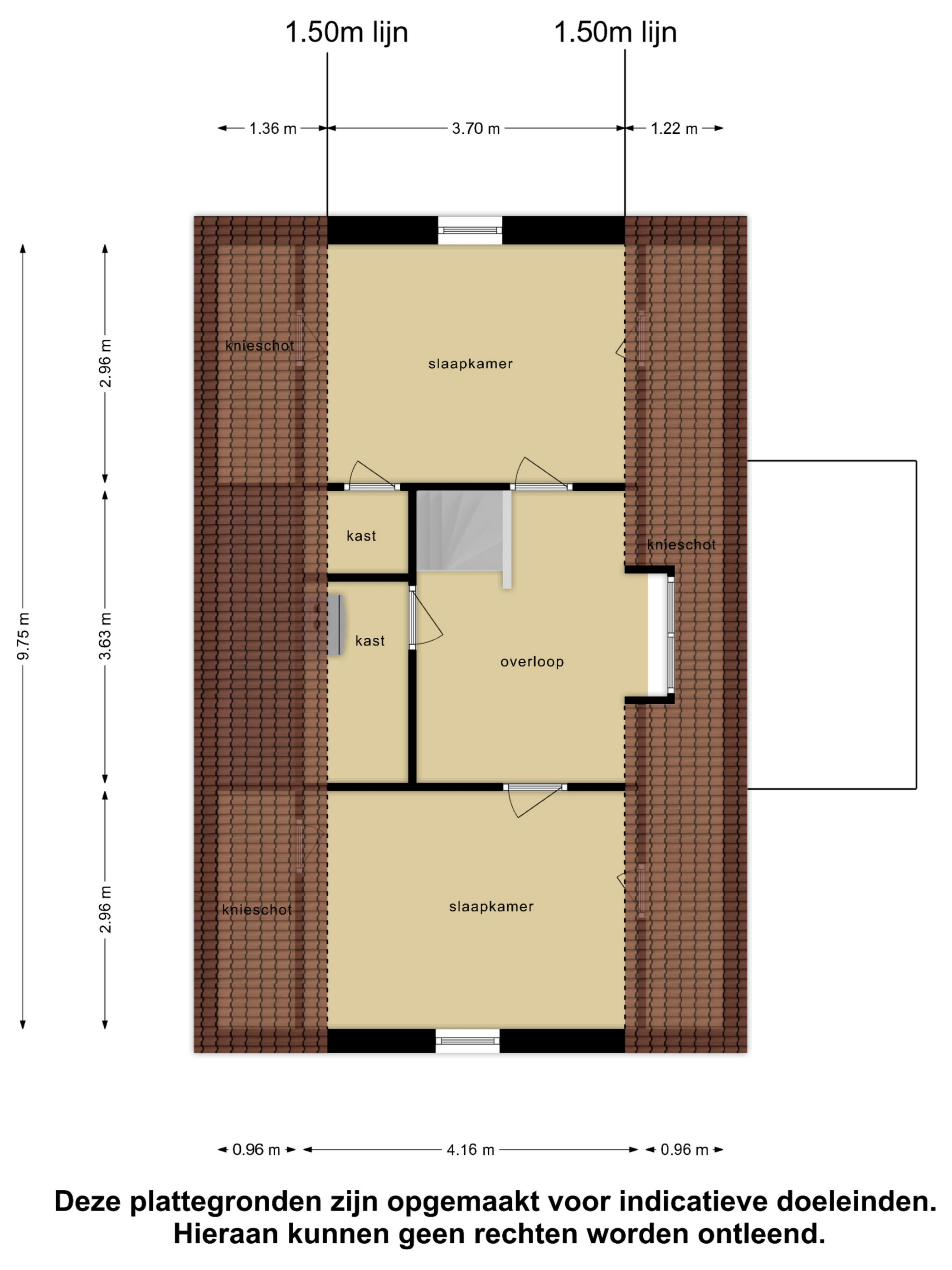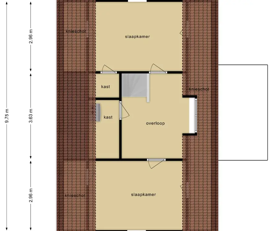 Tweede verdieping: op de tweede verdieping zijn nog eens twee slaapkamers. Onder de schuine kap zijn knieschotten geplaatst voor extra opbergruimte. Daarnaast is er een kastruime aanwezig. Deze verdieping is uitermate geschikt als slaap-, werk- of hobbyruimte.