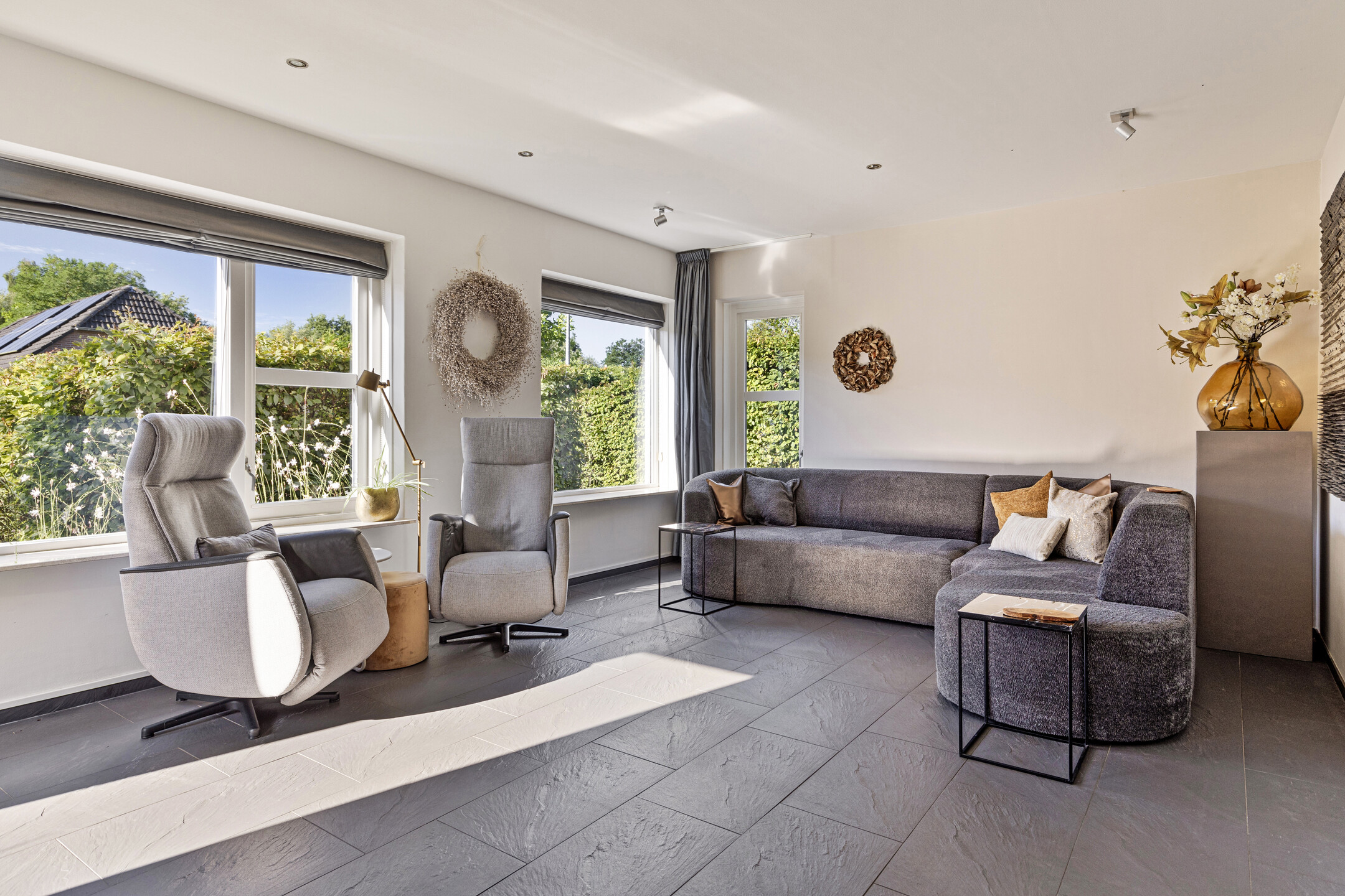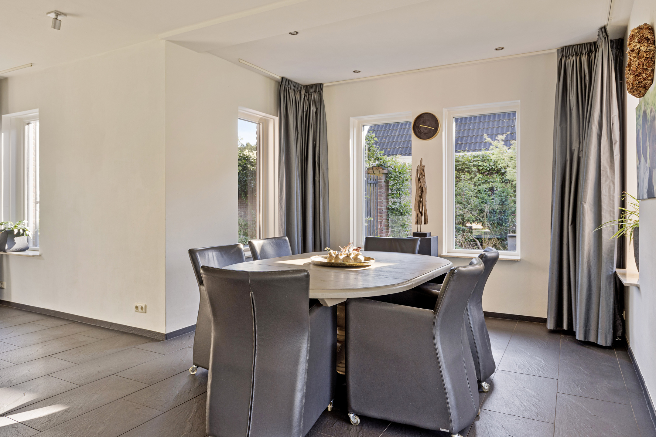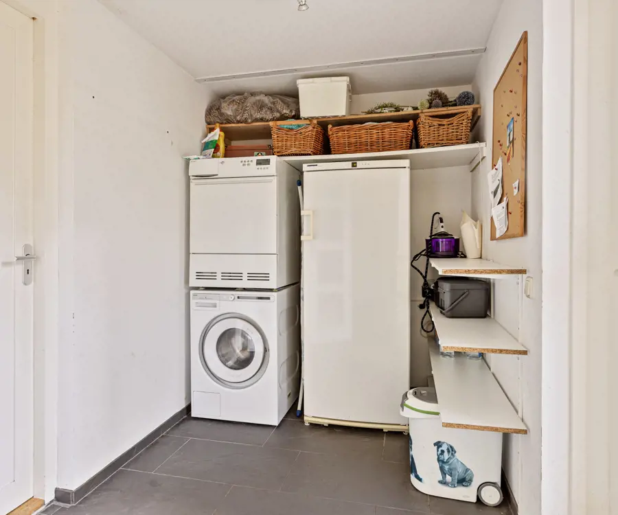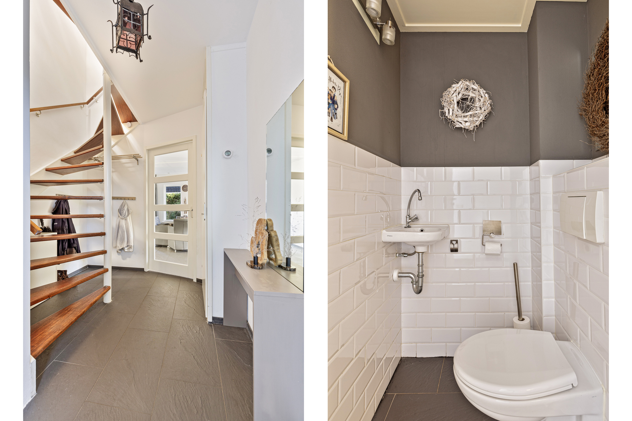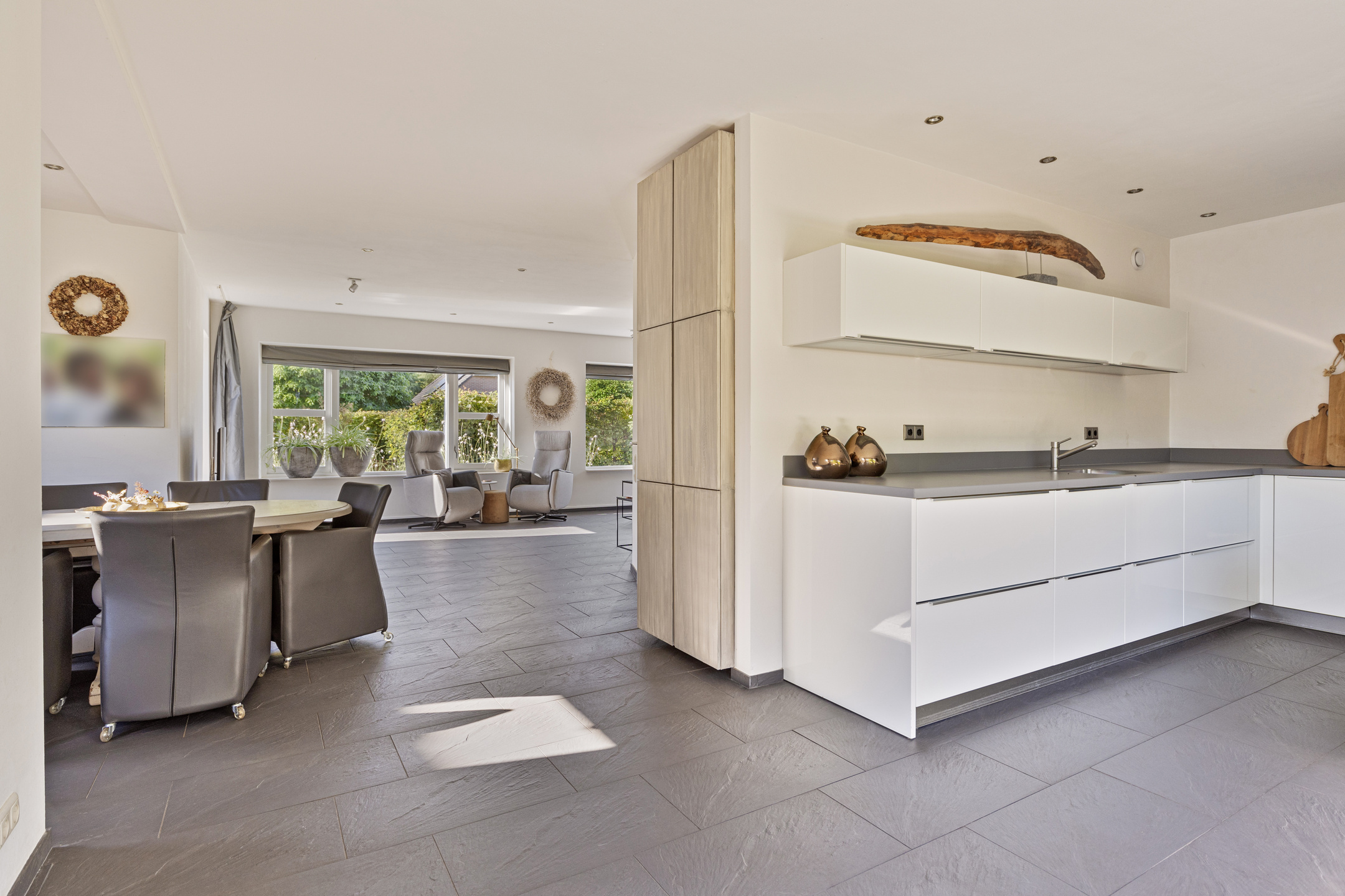 Begane grond: je betreedt de woning via de ruime entree met trapopgang en een modern toilet met fonteintje. Vanuit hier loop je door naar de royale woonkamer, die door de vele raampartijen aan drie zijden uitzonderlijk licht en ruim aanvoelt. De woonkamer staat in directe verbinding met de open keuken, die is ingericht met nieuwe inbouwapparatuur, veel werkblad en voldoende kastruimte. Aansluitend aan de keuken vind je een praktische bijkeuken met witgoedaansluiting en toegang tot de aangebouwde garage. Deze is uitermate geschikt voor fietsen, als hobbyruimte of opslag. Zowel de garage als de berging hebben een eigen buitendeur.
