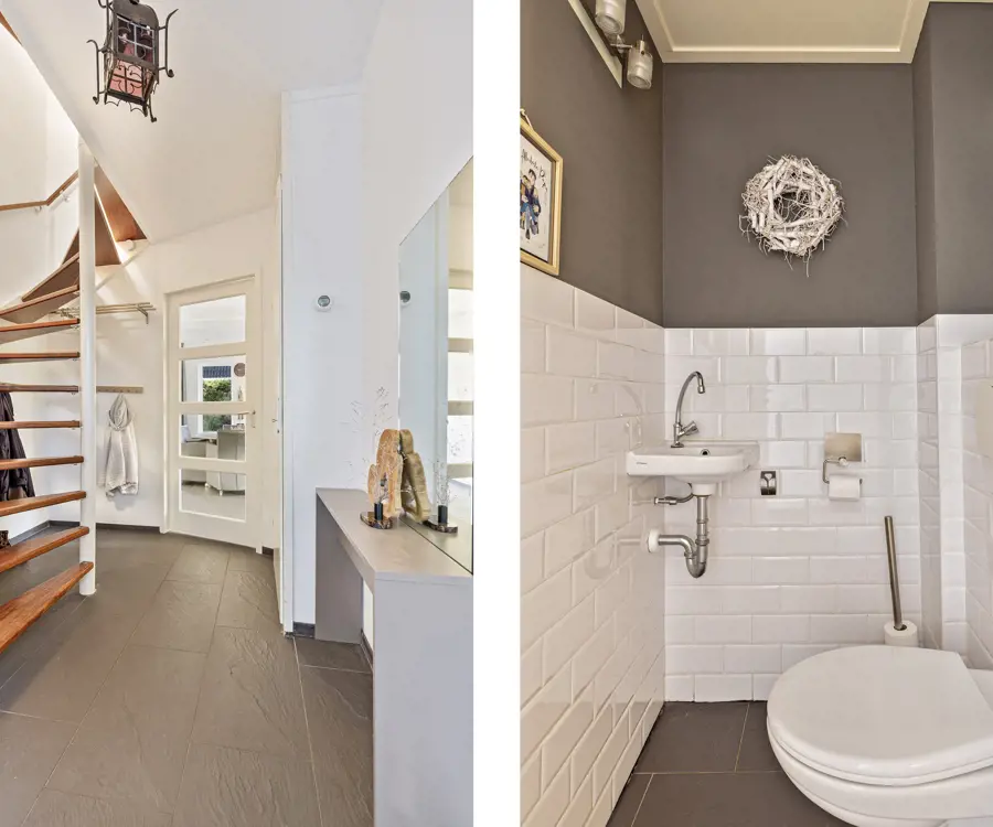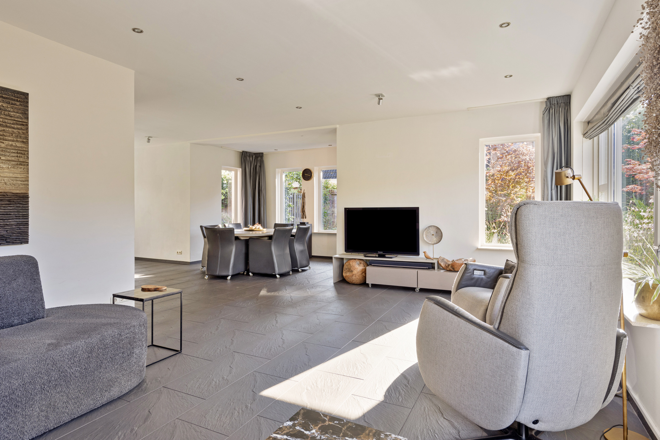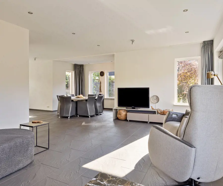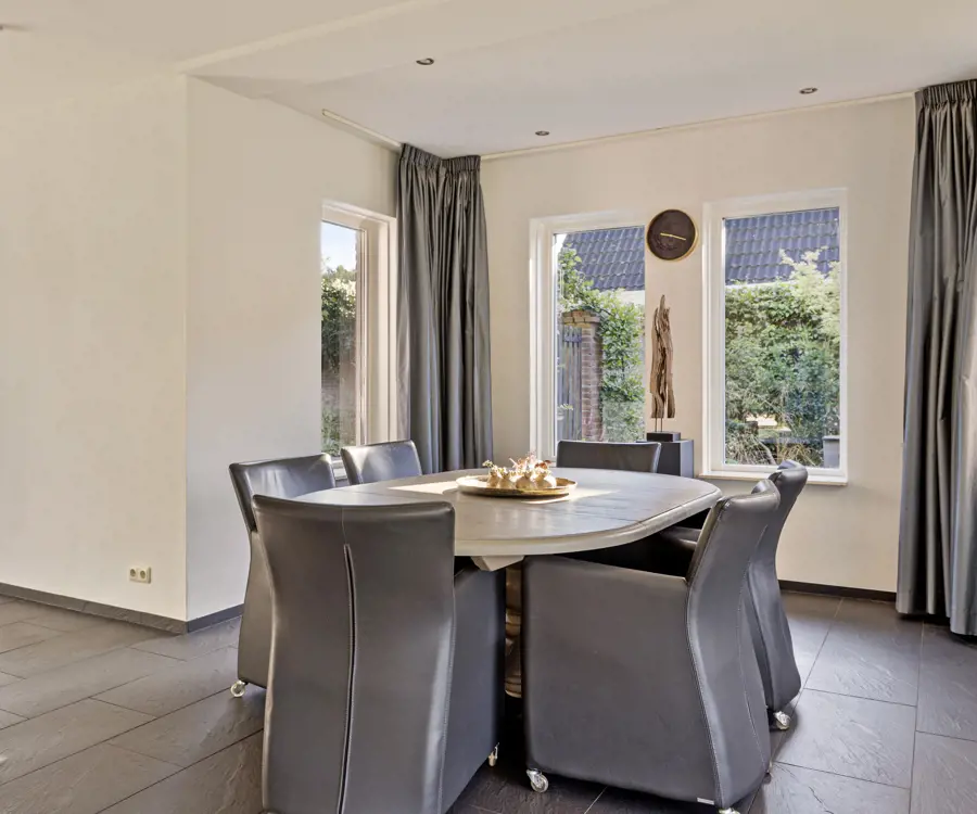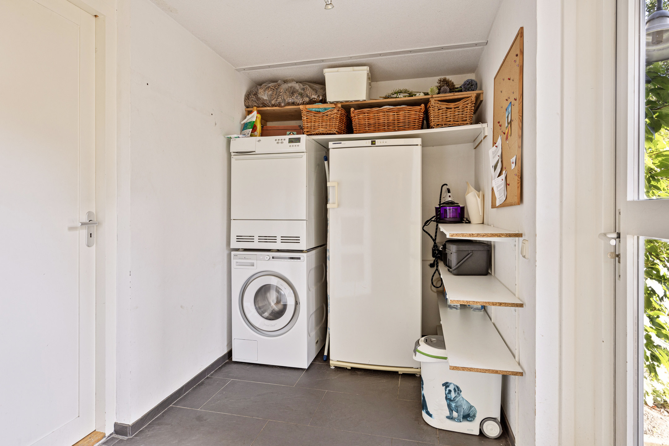 Begane grond: je betreedt de woning via de ruime entree met trapopgang en een modern toilet met fonteintje. Vanuit hier loop je door naar de royale woonkamer, die door de vele raampartijen aan drie zijden uitzonderlijk licht en ruim aanvoelt. De woonkamer staat in directe verbinding met de open keuken, die is ingericht met nieuwe inbouwapparatuur, veel werkblad en voldoende kastruimte. Aansluitend aan de keuken vind je een praktische bijkeuken met witgoedaansluiting en toegang tot de aangebouwde garage. Deze is uitermate geschikt voor fietsen, als hobbyruimte of opslag. Zowel de garage als de berging hebben een eigen buitendeur.