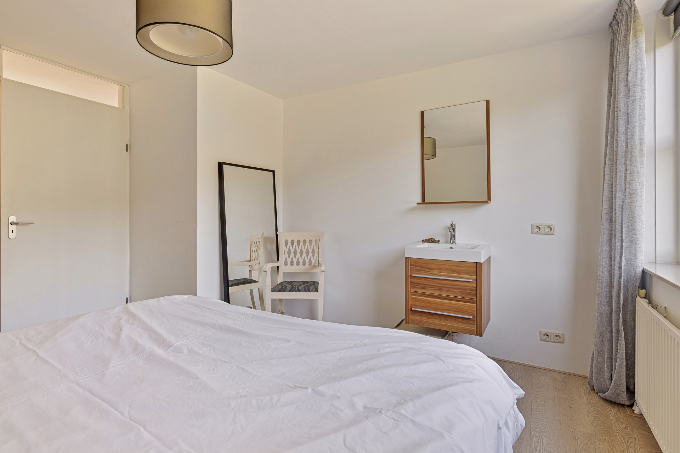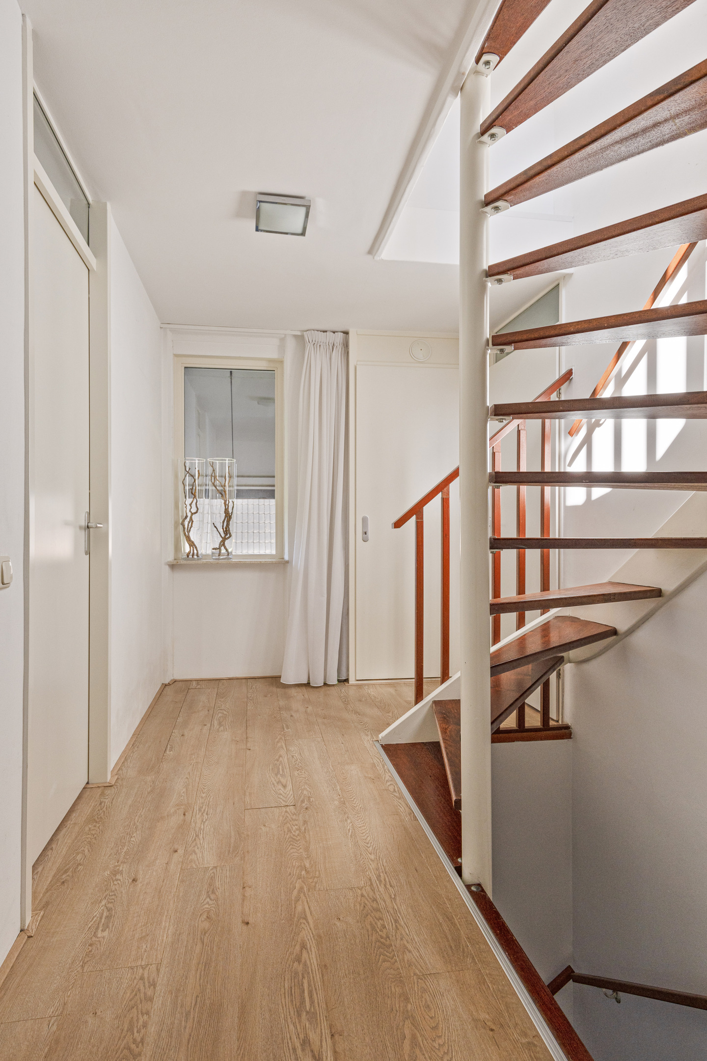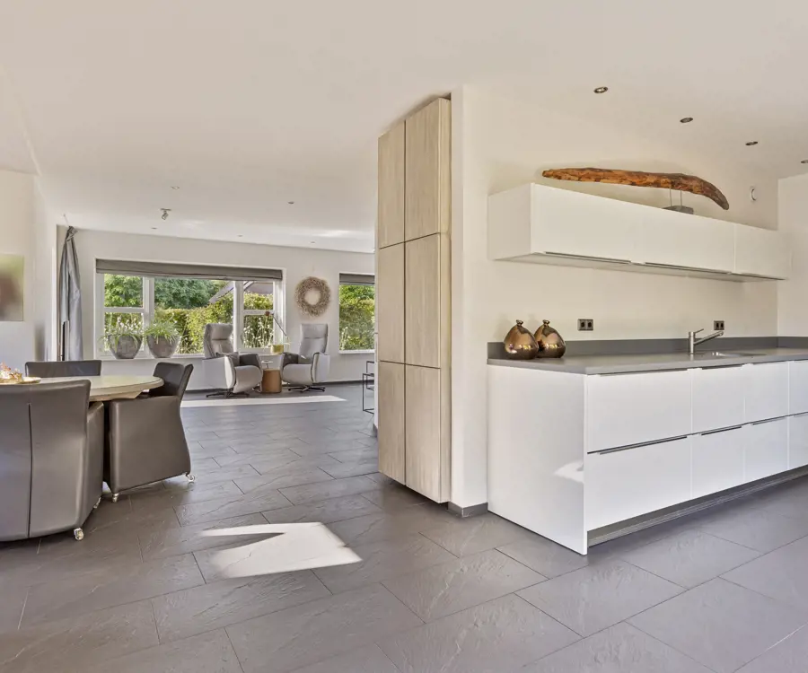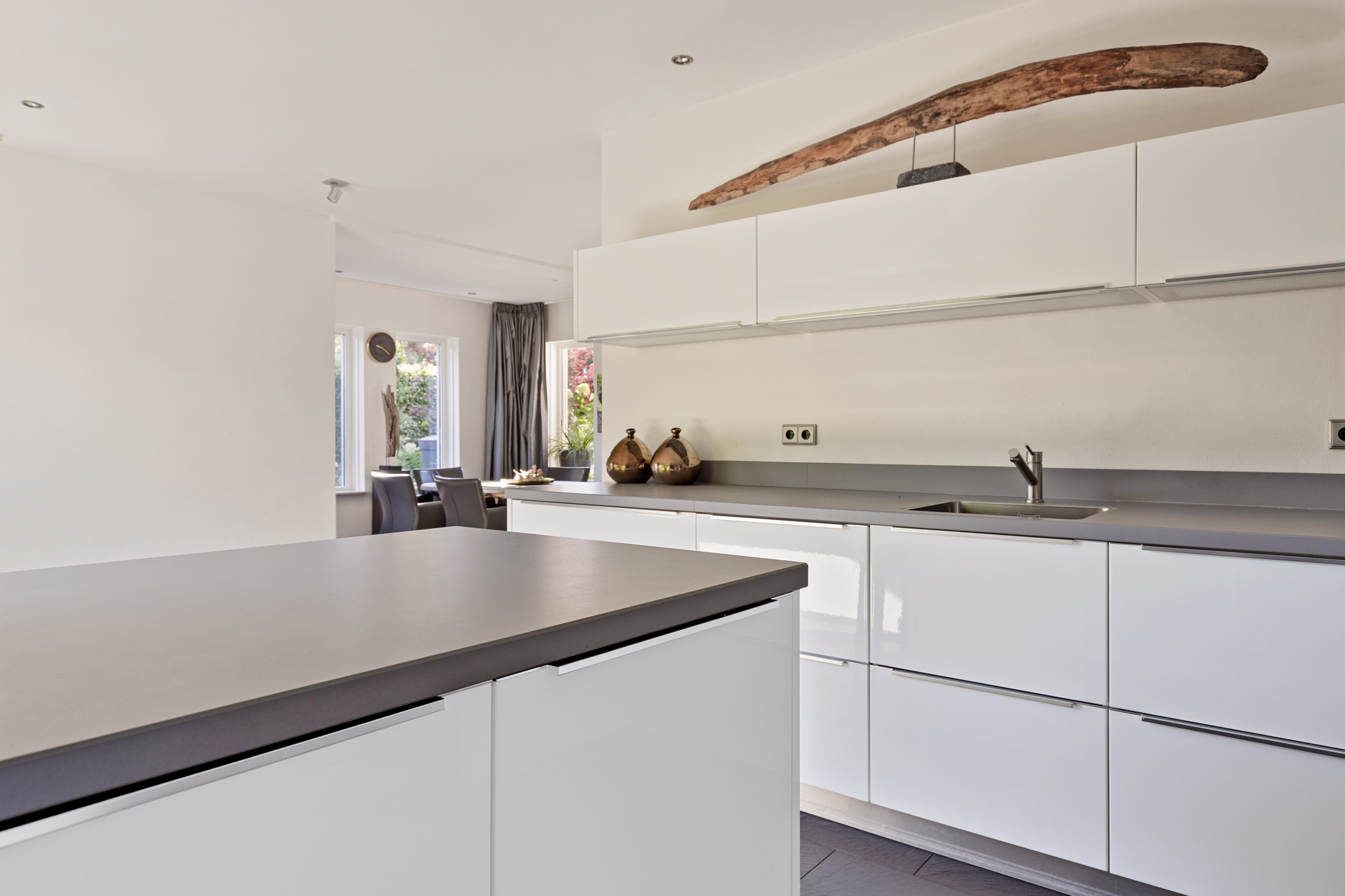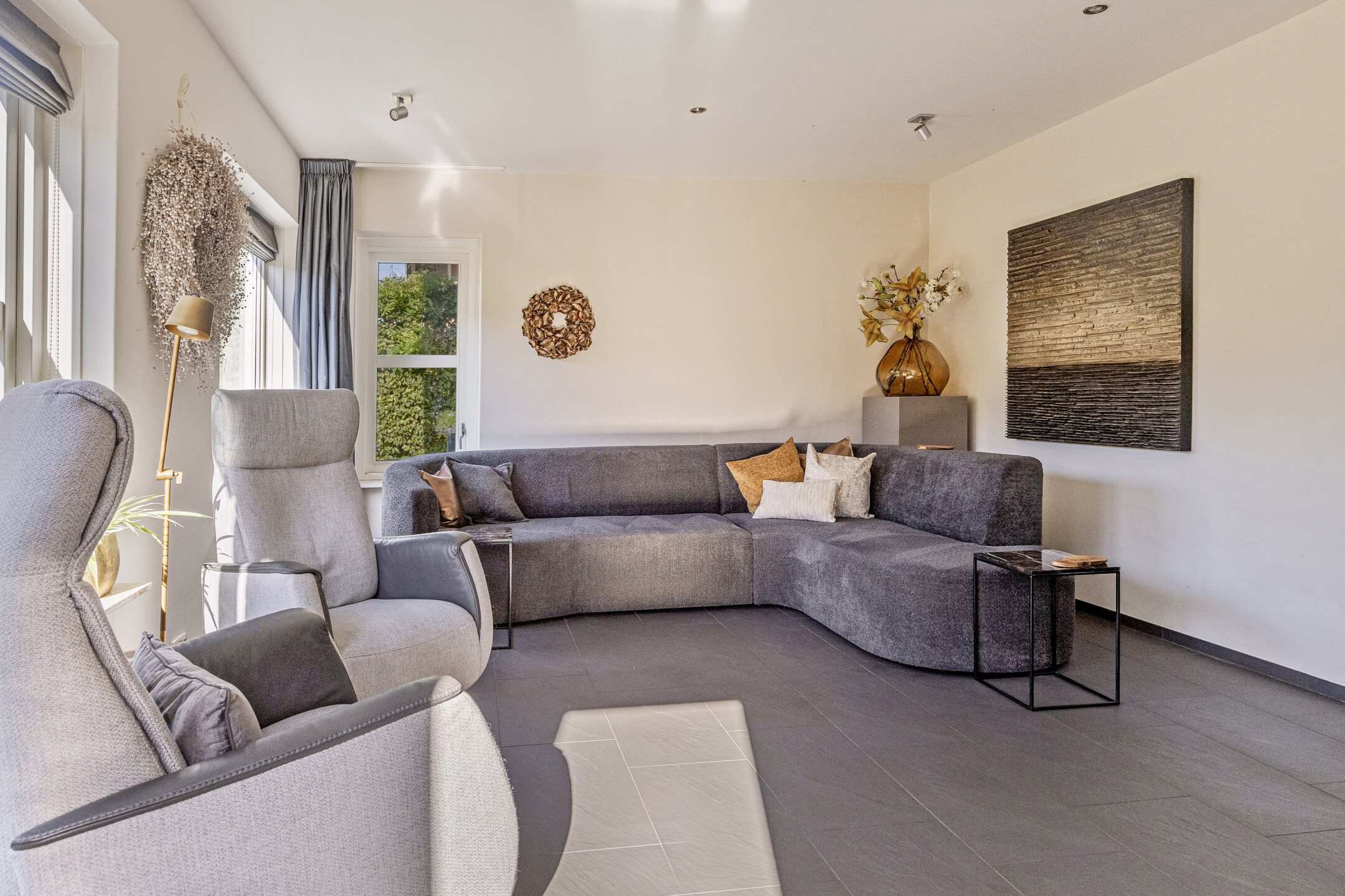 Begane grond: je betreedt de woning via de ruime entree met trapopgang en een modern toilet met fonteintje. Vanuit hier loop je door naar de royale woonkamer, die door de vele raampartijen aan drie zijden uitzonderlijk licht en ruim aanvoelt. De woonkamer staat in directe verbinding met de open keuken, die is ingericht met nieuwe inbouwapparatuur, veel werkblad en voldoende kastruimte. Aansluitend aan de keuken vind je een praktische bijkeuken met witgoedaansluiting en toegang tot de aangebouwde garage. Deze is uitermate geschikt voor fietsen, als hobbyruimte of opslag. Zowel de garage als de berging hebben een eigen buitendeur.