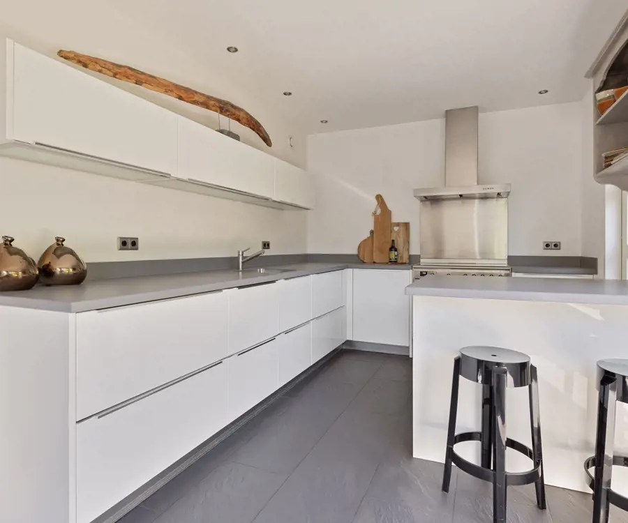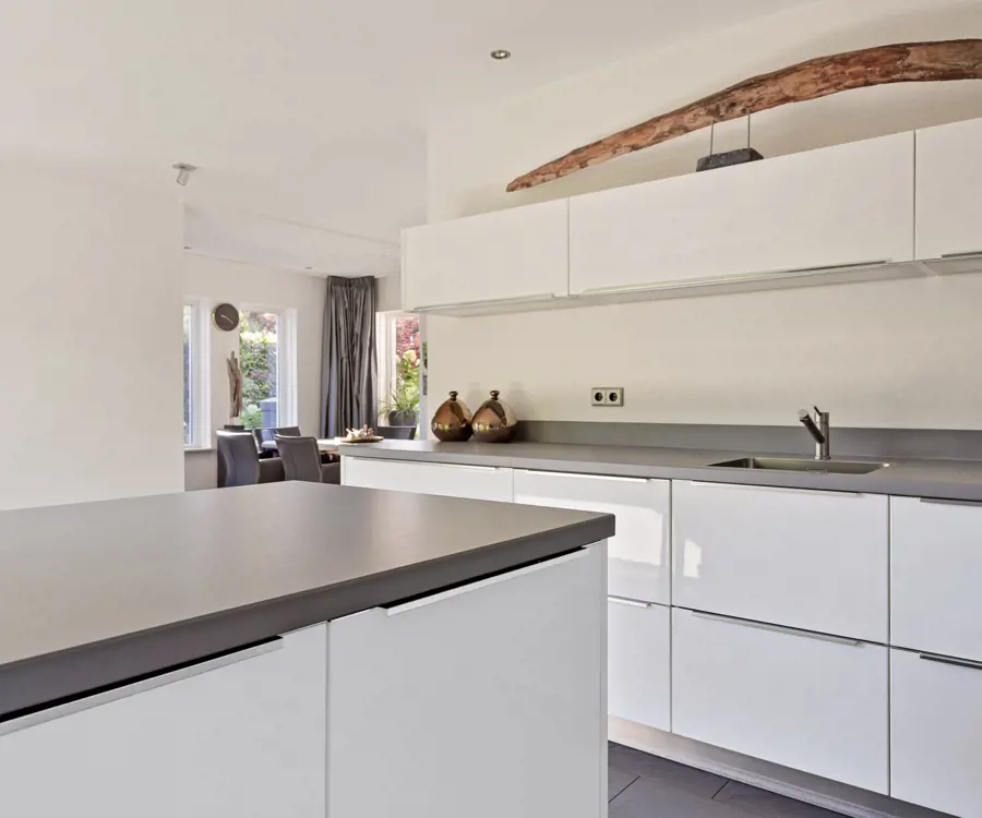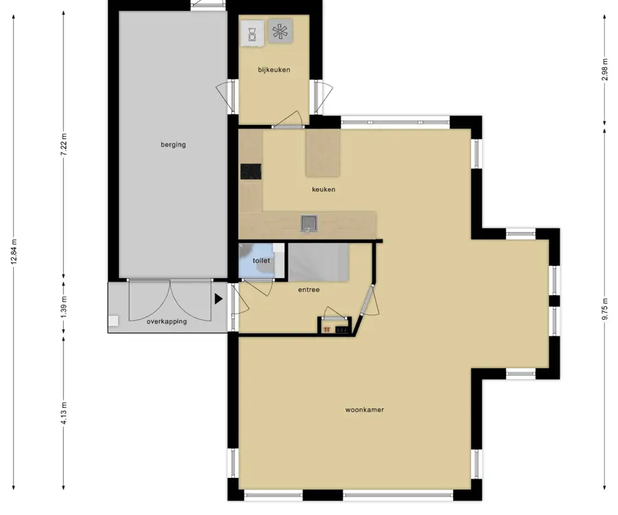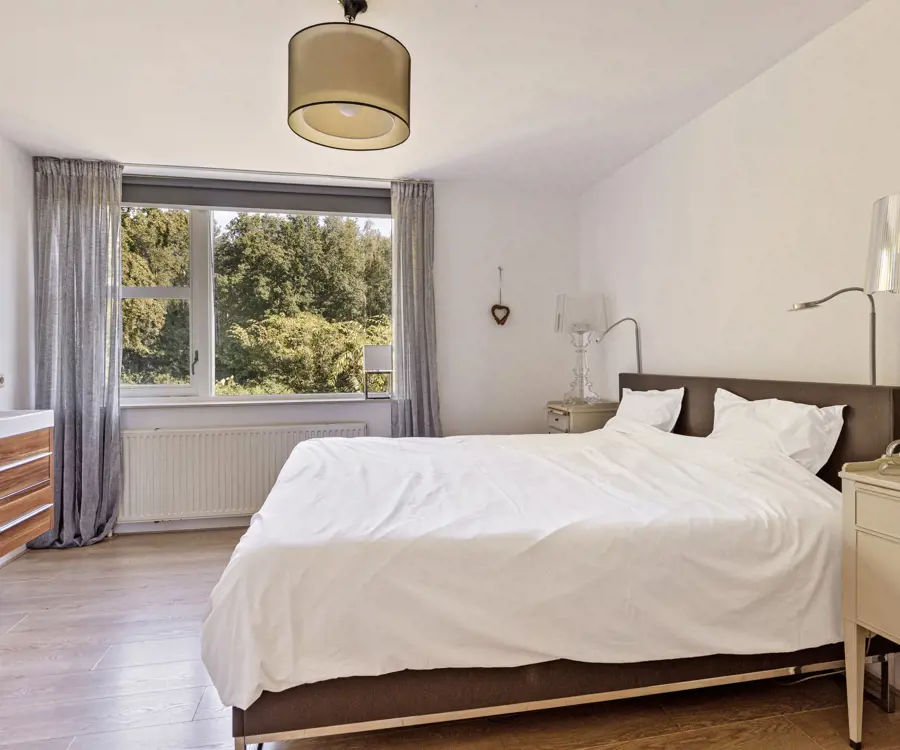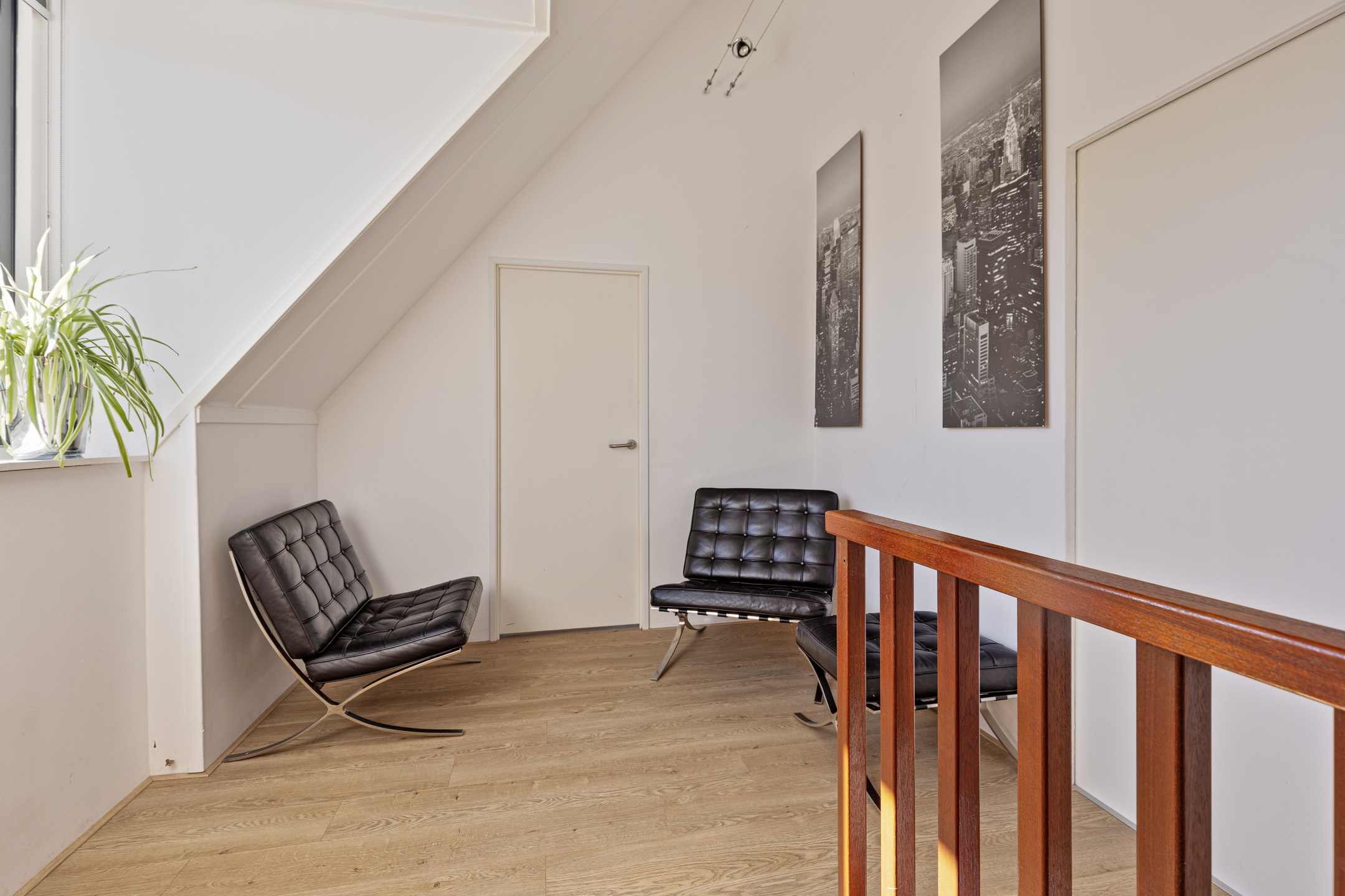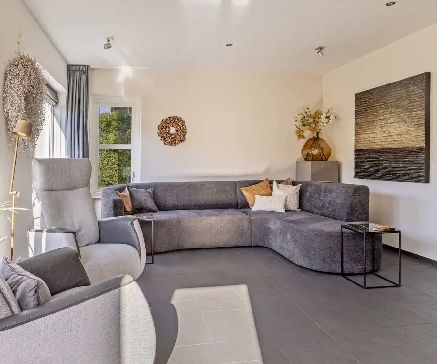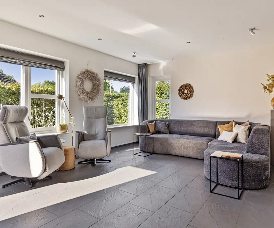 Begane grond: je betreedt de woning via de ruime entree met trapopgang en een modern toilet met fonteintje. Vanuit hier loop je door naar de royale woonkamer, die door de vele raampartijen aan drie zijden uitzonderlijk licht en ruim aanvoelt. De woonkamer staat in directe verbinding met de open keuken, die is ingericht met nieuwe inbouwapparatuur, veel werkblad en voldoende kastruimte. Aansluitend aan de keuken vind je een praktische bijkeuken met witgoedaansluiting en toegang tot de aangebouwde garage. Deze is uitermate geschikt voor fietsen, als hobbyruimte of opslag. Zowel de garage als de berging hebben een eigen buitendeur.