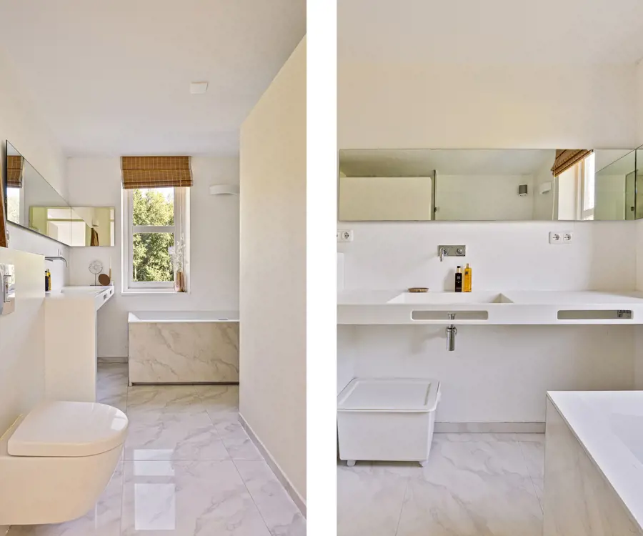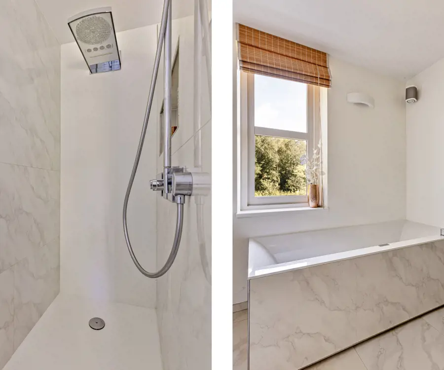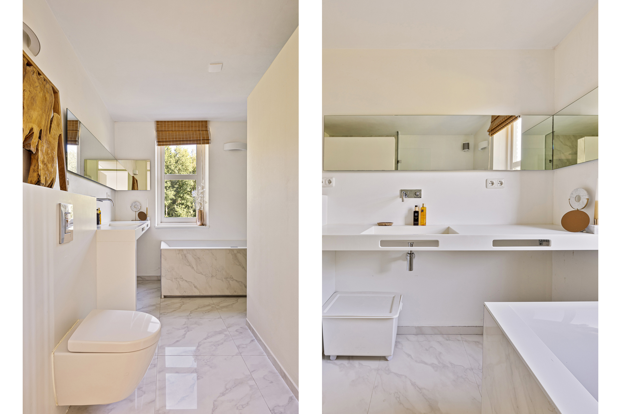 Eerste verdieping: op de eerste verdieping bevinden zich drie ruime slaapkamers en een ruime badkamer. De badkamer is modern afgewerkt en van alle gemakken voorzien: een ligbad, inloopdouche, tweede toilet, wastafelmeubel en als extra luxe elektrische vloerverwarming.