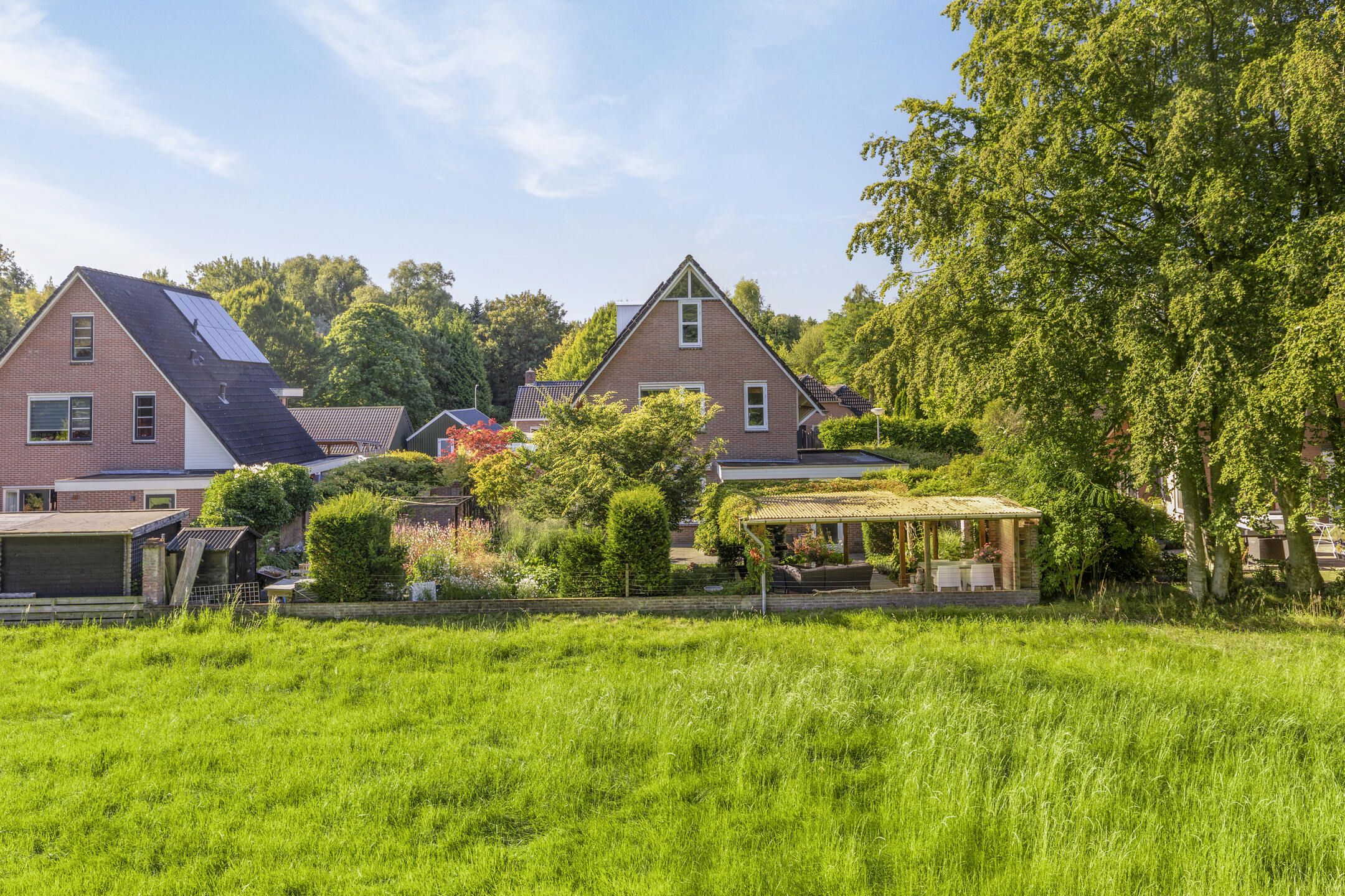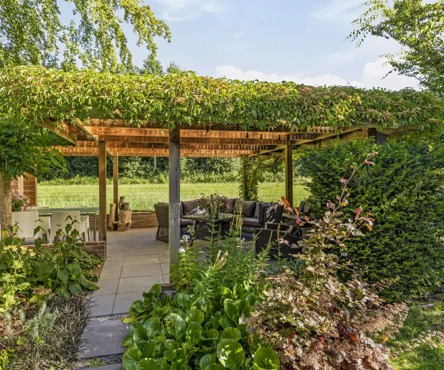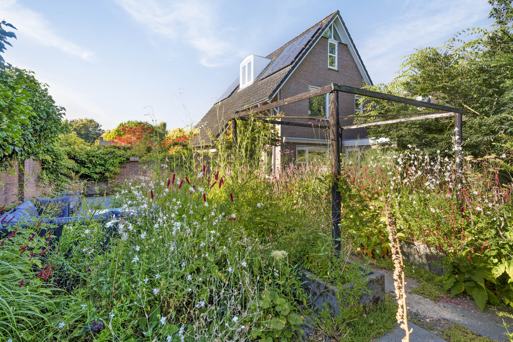 Buiten: de tuin is groen en ruim opgezet en grenst direct aan een uitgestrekt weiland, wat zorgt voor een vrij uitzicht en veel privacy. Er is een overdekte zithoek onder een pergola met begroeiing, perfect om beschut buiten te zitten. Verder zijn er meerdere terrassen en borders met vaste planten. Een fijne plek om in alle rust van het buitenleven te genieten.