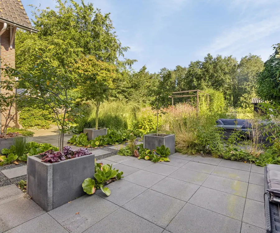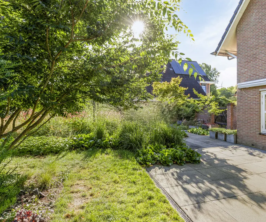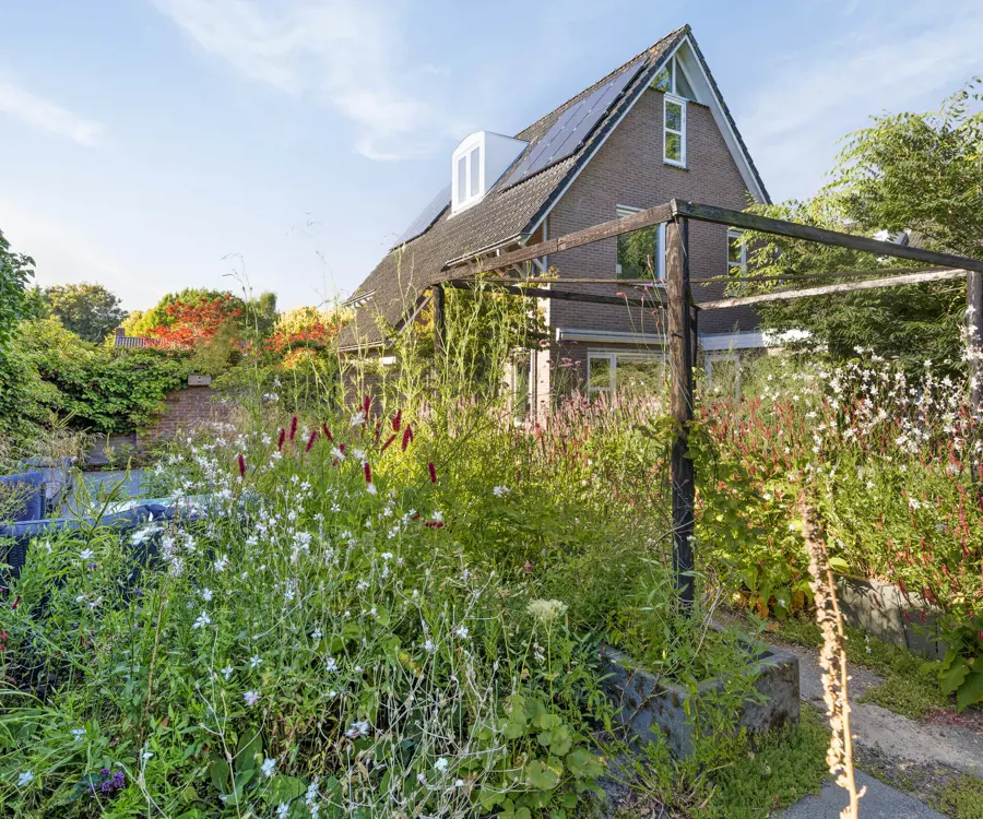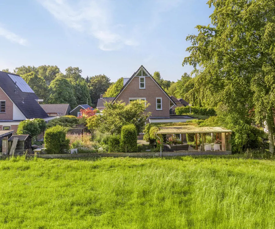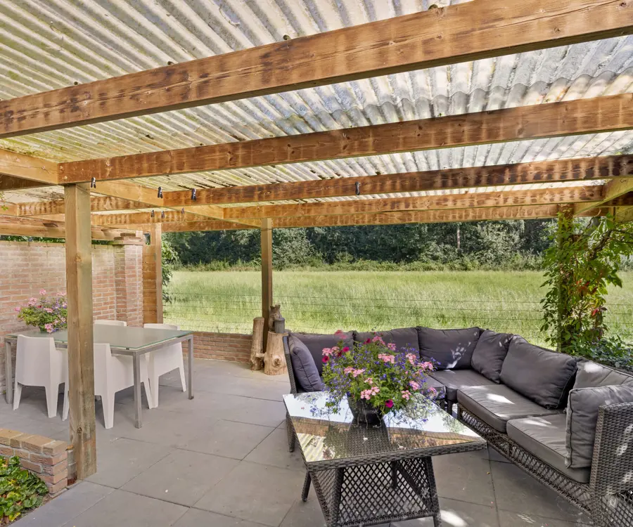 Buiten: de tuin is groen en ruim opgezet en grenst direct aan een uitgestrekt weiland, wat zorgt voor een vrij uitzicht en veel privacy. Er is een overdekte zithoek onder een pergola met begroeiing, perfect om beschut buiten te zitten. Verder zijn er meerdere terrassen en borders met vaste planten. Een fijne plek om in alle rust van het buitenleven te genieten.