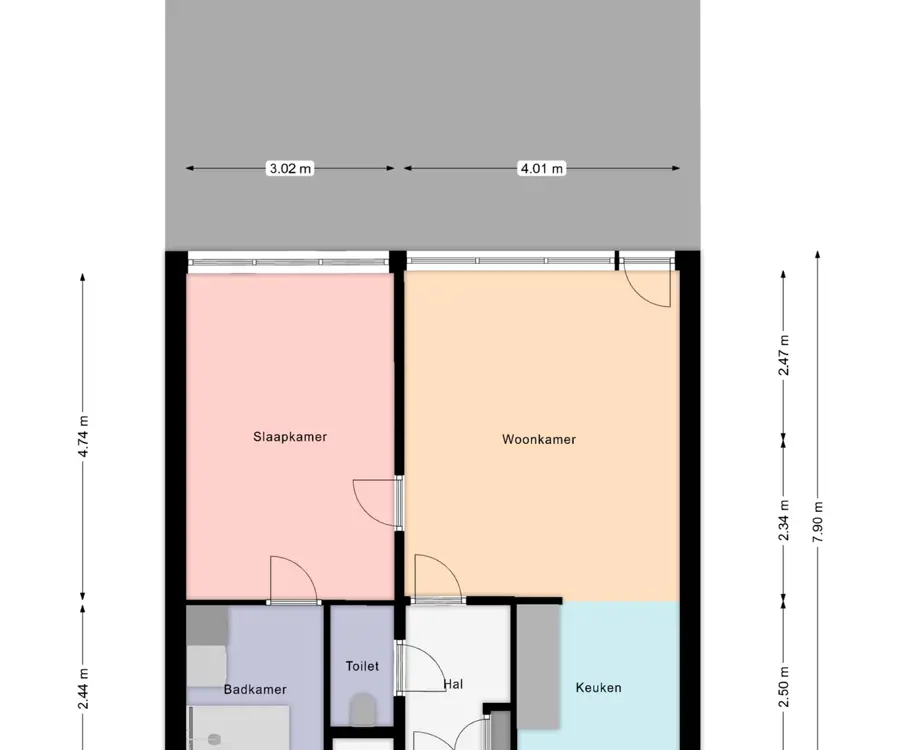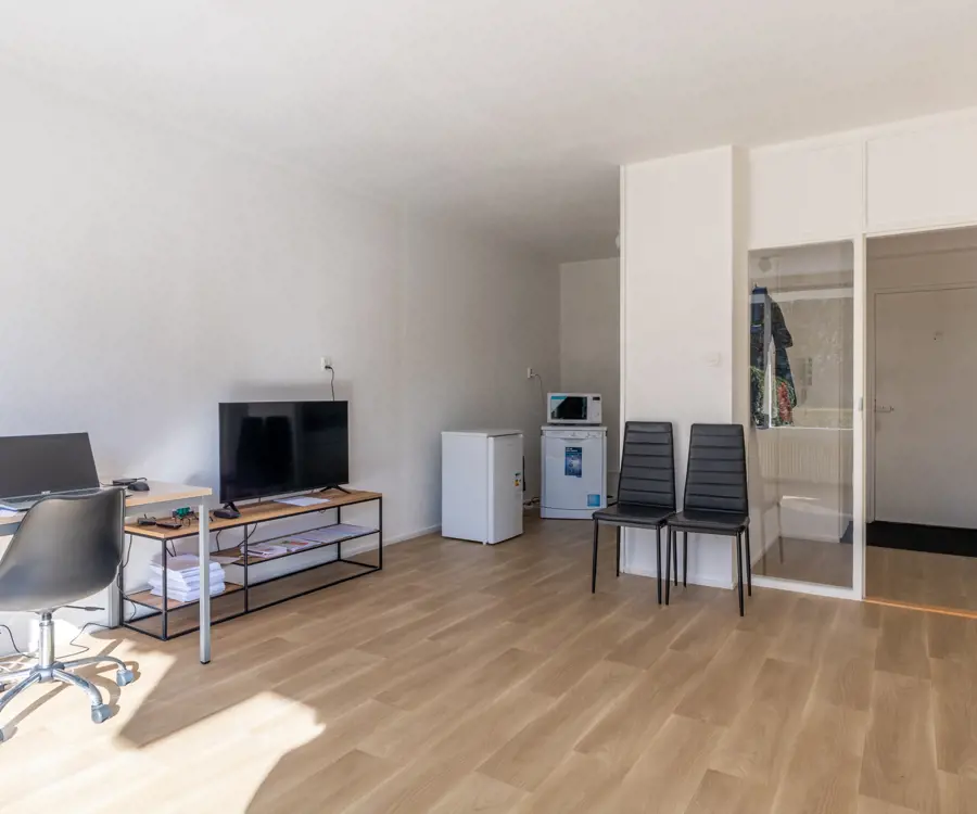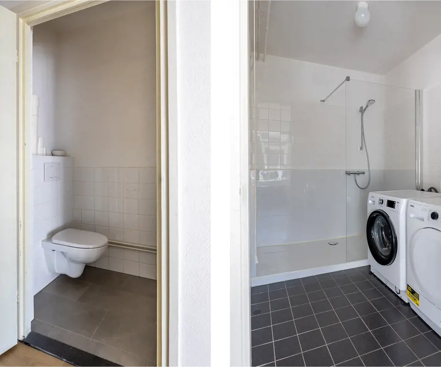 Bij binnenkomst via de hal heb je direct toegang tot de verschillende ruimtes in de woning, onder meer de toilet. De lichte woonkamer, gelegen aan de achterzijde, heeft een prettige indeling en biedt directe toegang tot de tuin. Dankzij de grote ramen geniet je hier van veel lichtinval. De woonkamer is ruim genoeg voor een gezellige zithoek en een eettafel. De keuken is gelegen aan de rechterzijde van de woning en biedt voldoende werk- en opbergruimte. De ruime slaapkamer bevindt zich naast de woonkamer en biedt genoeg ruimte voor een tweepersoonsbed en een kledingkast. Ook hier zorgen de grote ramen voor veel lichtinval. De badkamer is compact maar functioneel, voorzien van een douche en ruimte voor een wasmachine en droger.