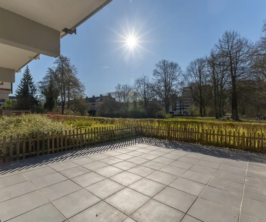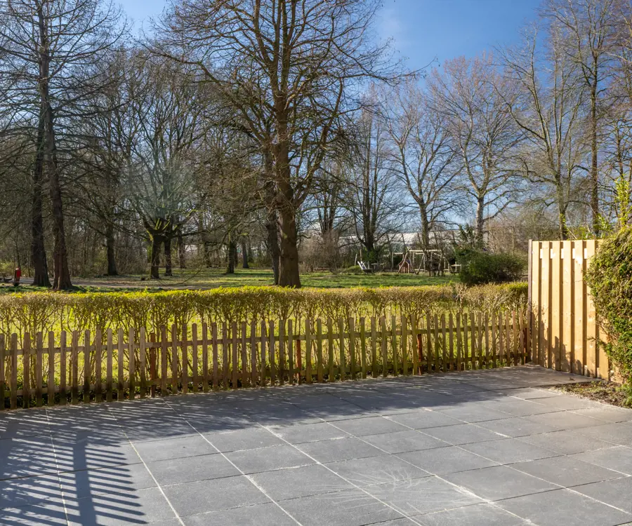 Eén van de grote pluspunten van deze woning is de heerlijke tuin, gelegen op het zuiden. Hier kun je lekker buiten zitten en genieten van de zon, met een vrij uitzicht op het groen.