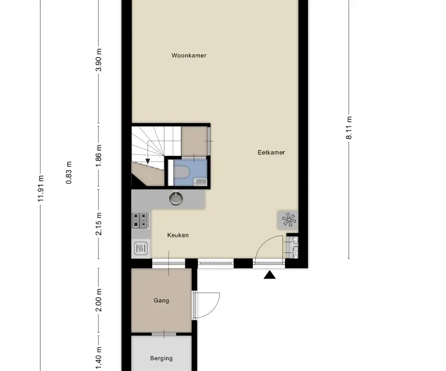 Begane grond: je komt binnen via de entree/hal, waar zich een praktische berging bevindt. Vanuit de hal bereik je de open keuken die is voorzien van diverse inbouwapparatuur. De woonkamer zit aan de achterkant van de woning direct gericht op de tuin. De ochtendzon schijnt hier heerlijk naar binnen. Verder is er op deze verdieping een tussenhal met een toilet en de trapopgang naar de eerste verdieping.