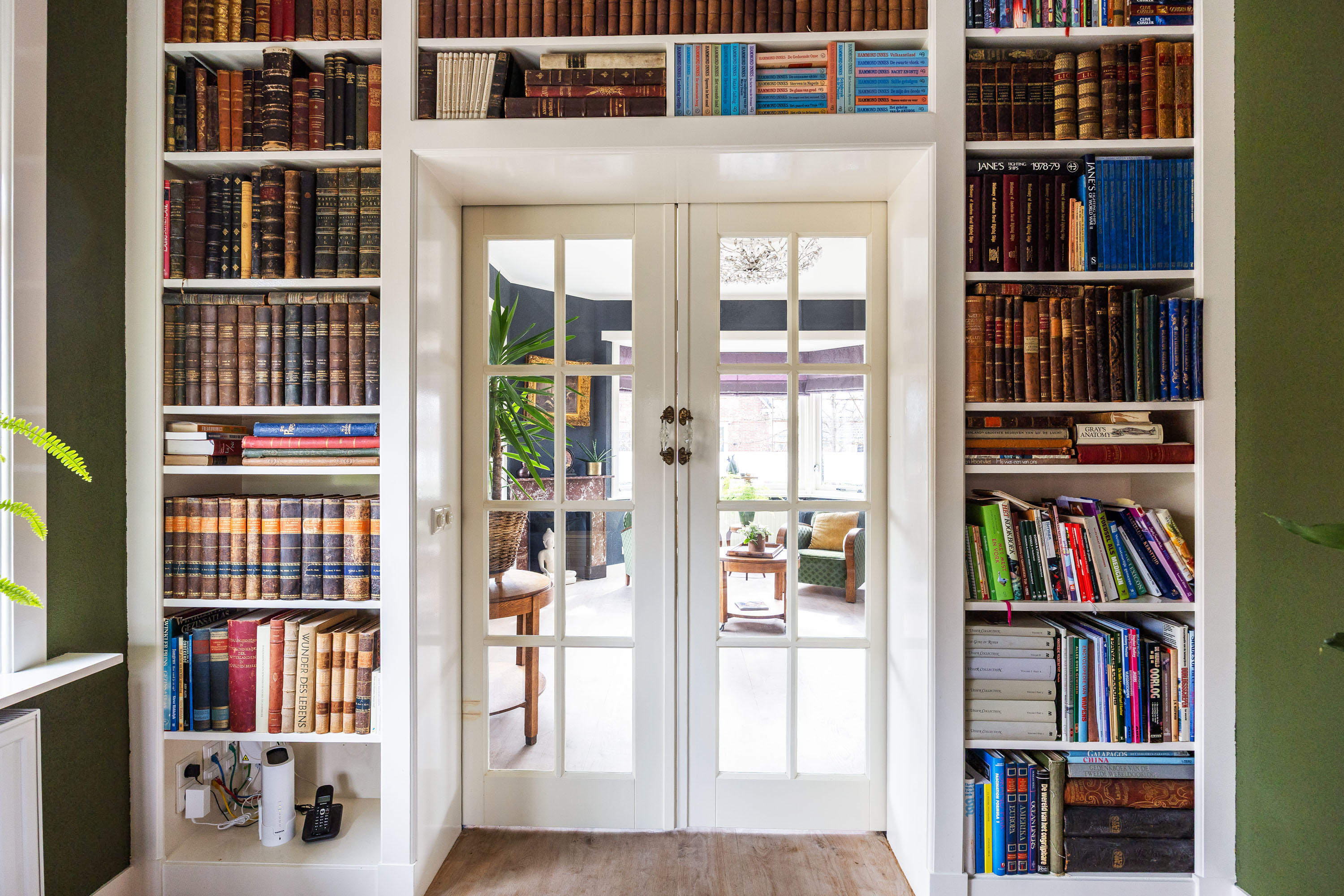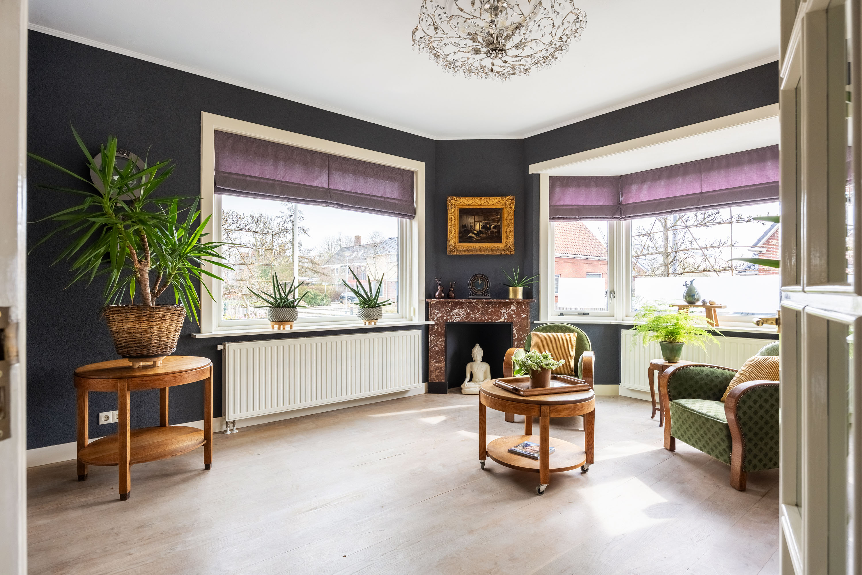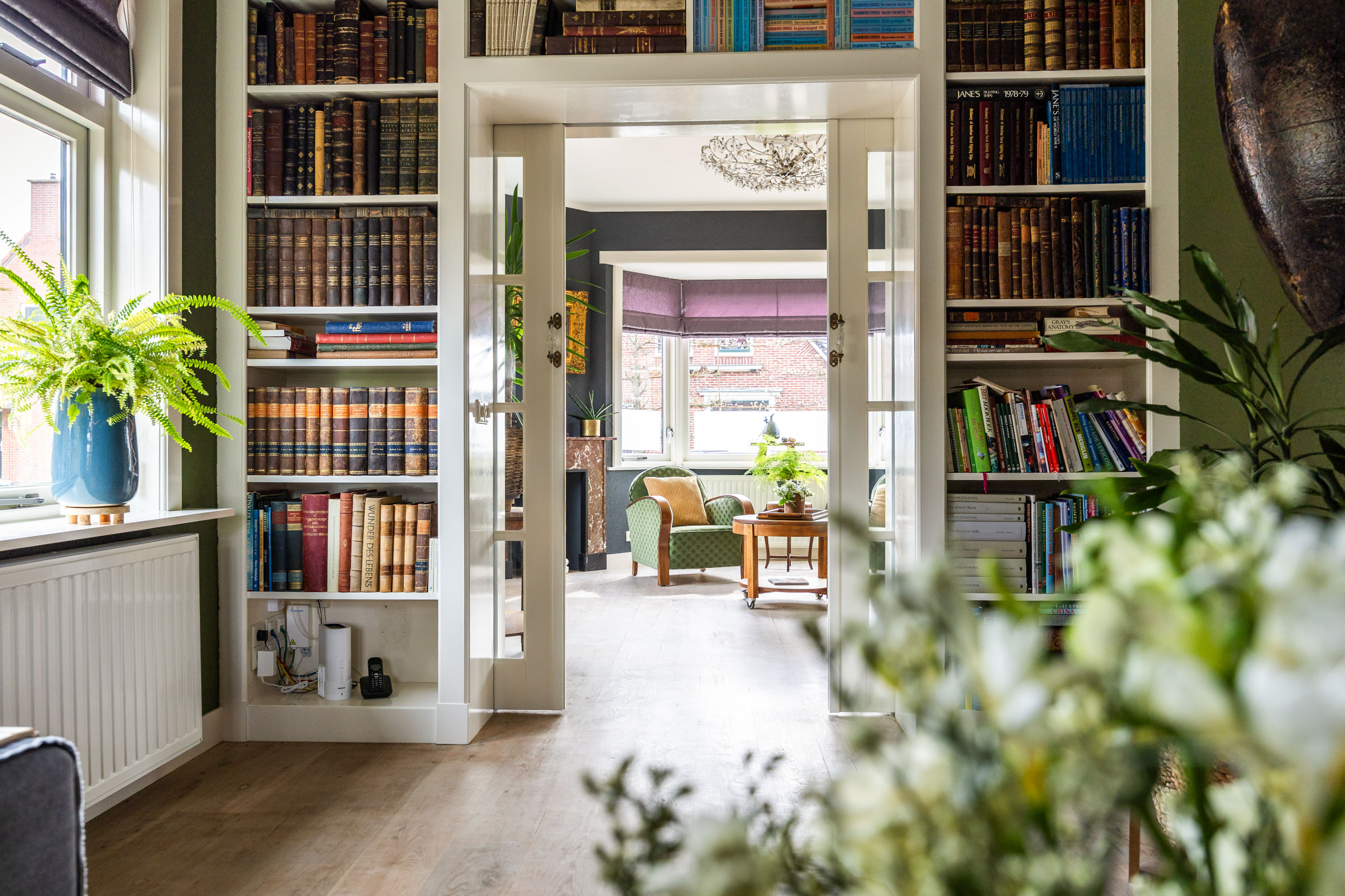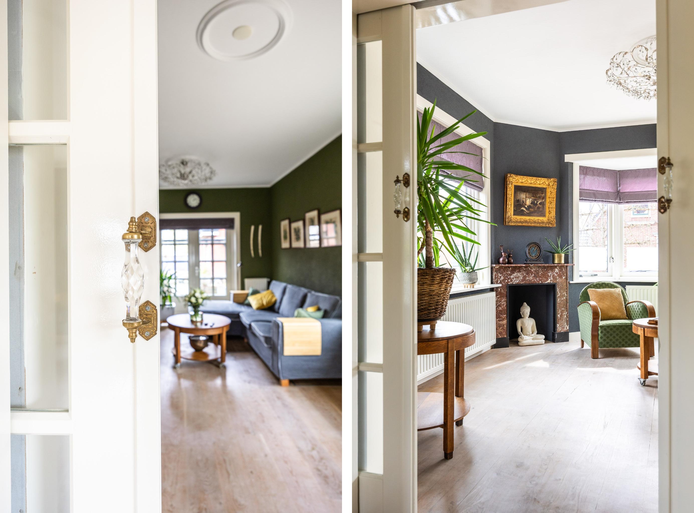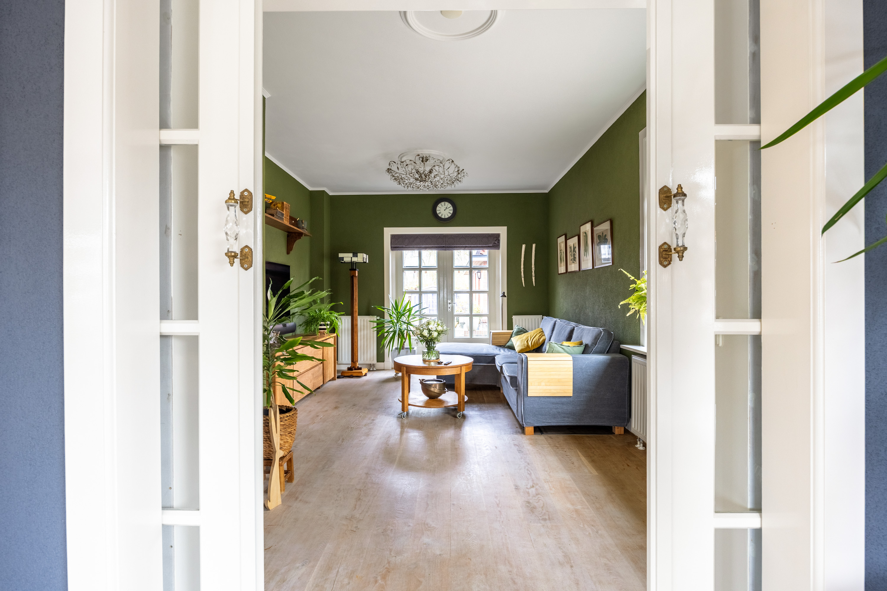 De woonkamer is royaal en sfeervol opgezet en wordt op een prachtige manier verdeeld door authentieke en suite deuren. Hierdoor ontstaat er een natuurlijke scheiding tussen bijvoorbeeld het zit- en eetgedeelte, terwijl je tegelijkertijd de openheid en het licht behoudt. Grote raampartijen zorgen voor een fijne lichtinval en versterken het ruimtelijke gevoel, en aan de achterzijde van de kamer vind je openslaande deuren waardoor je zo de tuin in stapt en binnen en buiten op een mooie manier met elkaar verbonden zijn.