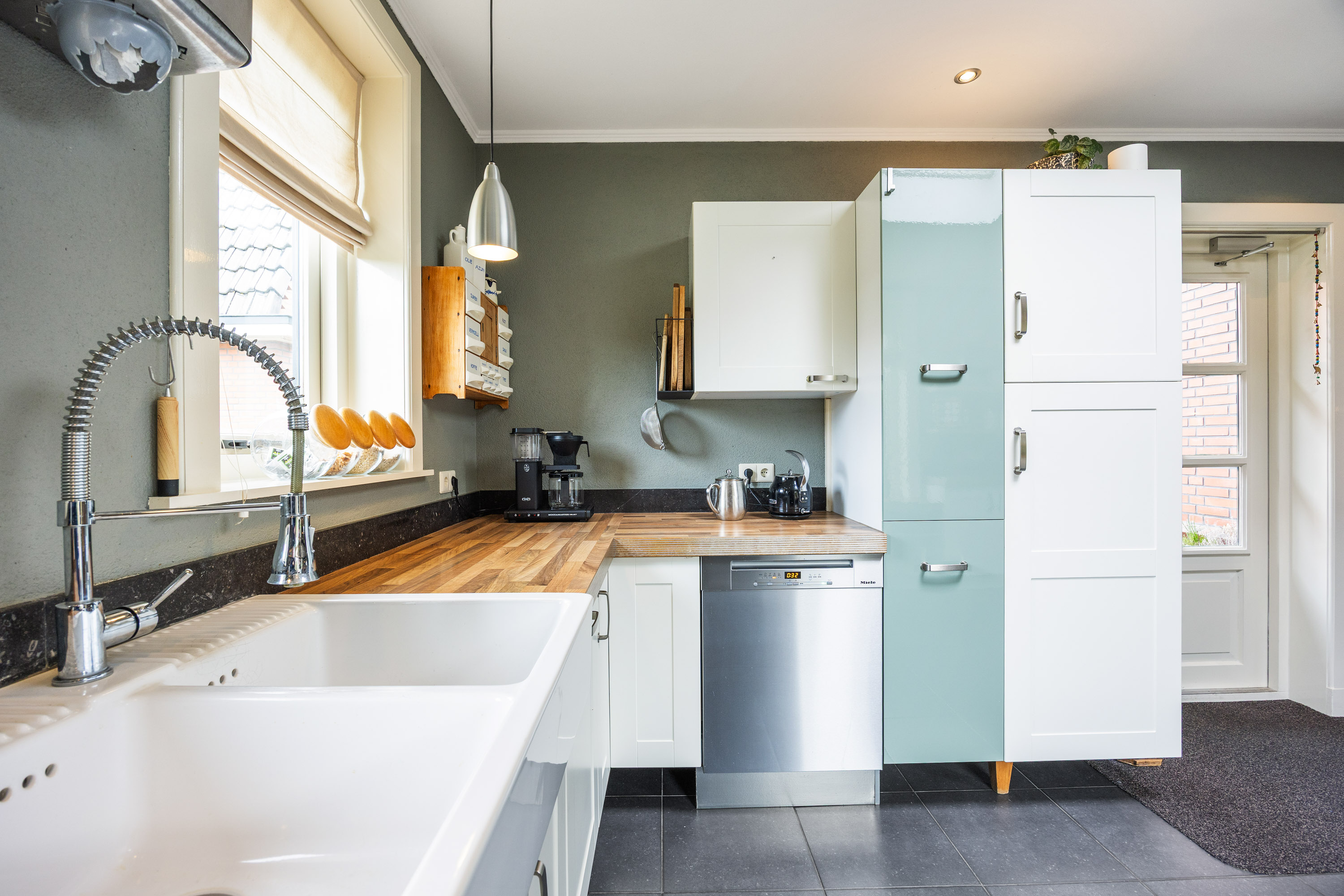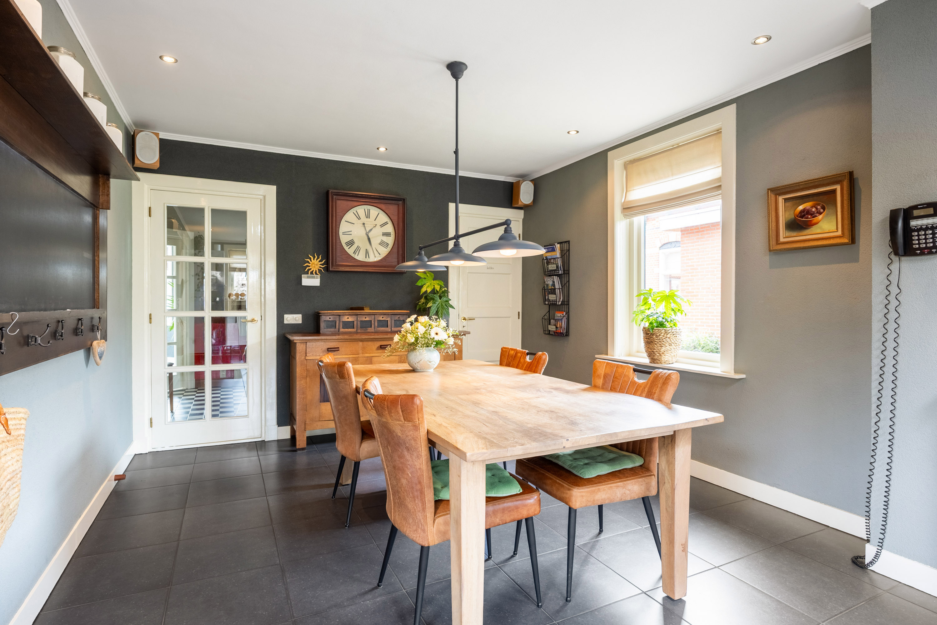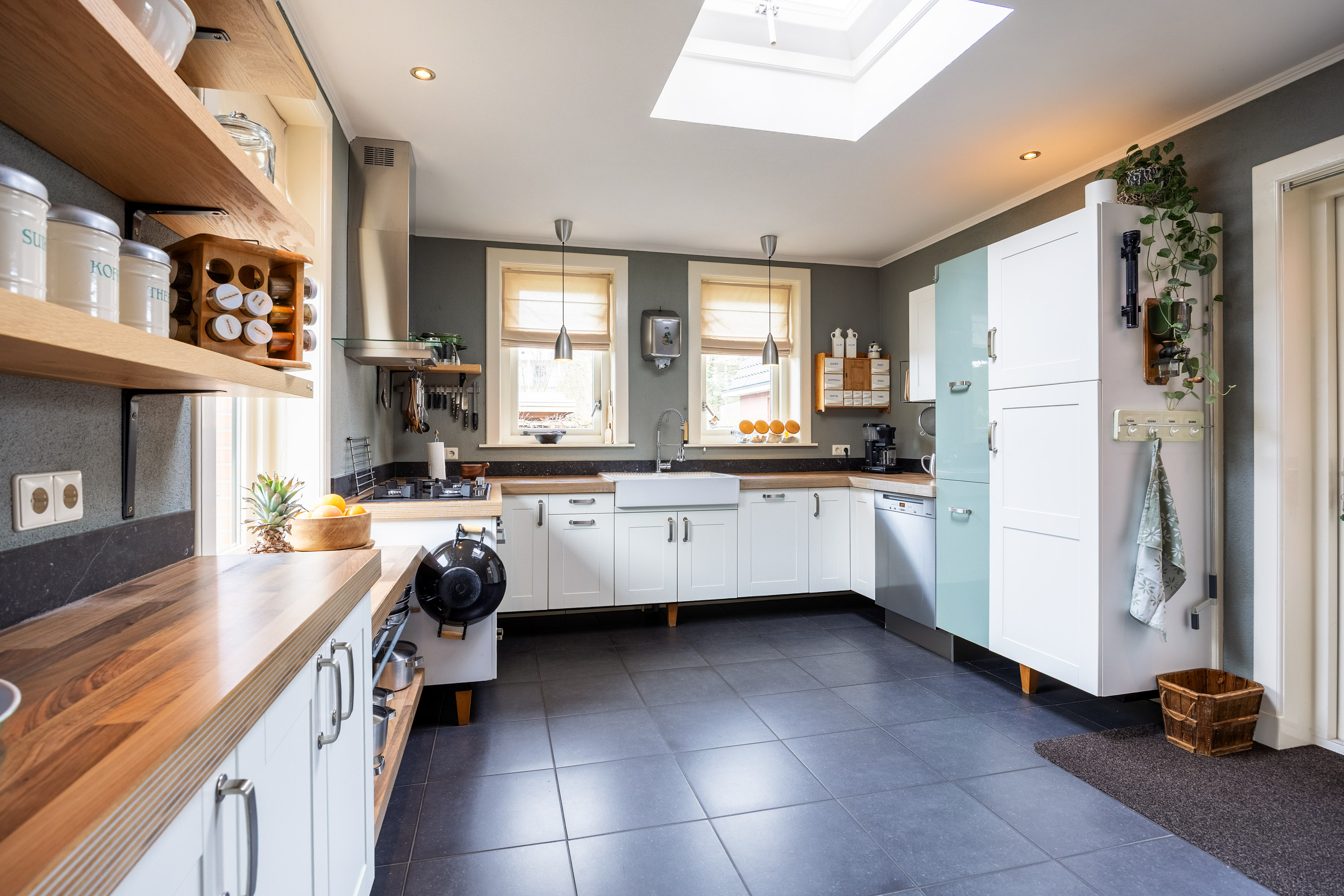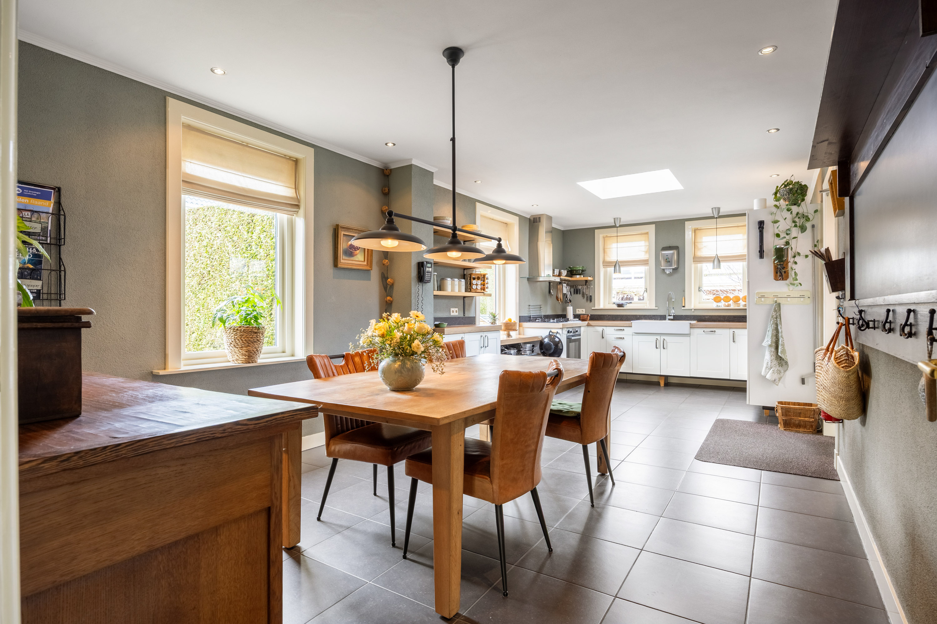 Aansluitend ligt de woonkeuken, een heerlijke plek om samen te komen en uitgebreid te tafelen. Dankzij de lichtkoepel is het een fijne lichte ruimte. De keuken is voorzien van diverse inbouwapparatuur en biedt meer dan voldoende ruimte voor een grote eettafel. Daarnaast heb je vanuit hier toegang tot zowel de kelder als de achtertuin, wat het geheel extra praktisch maakt.