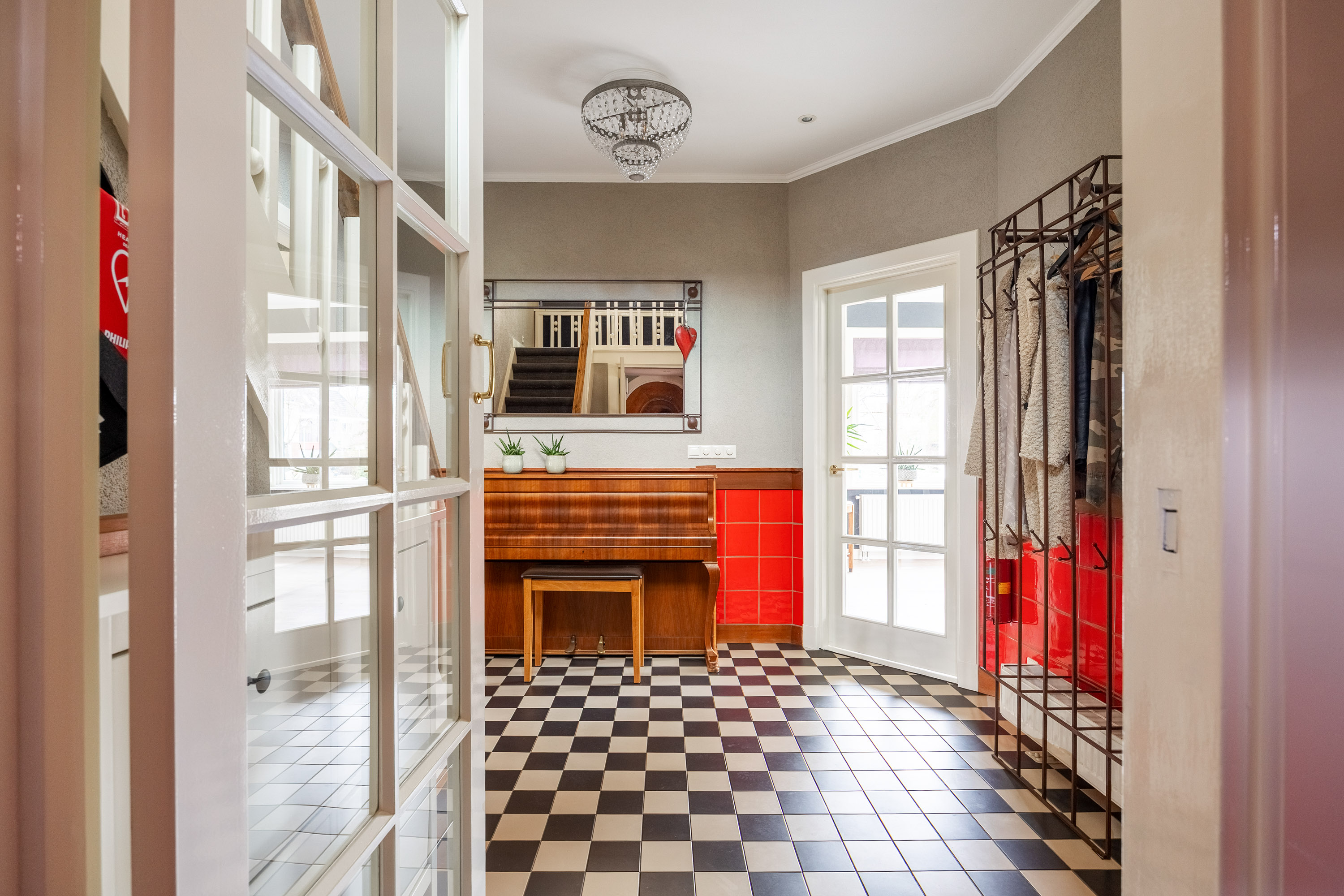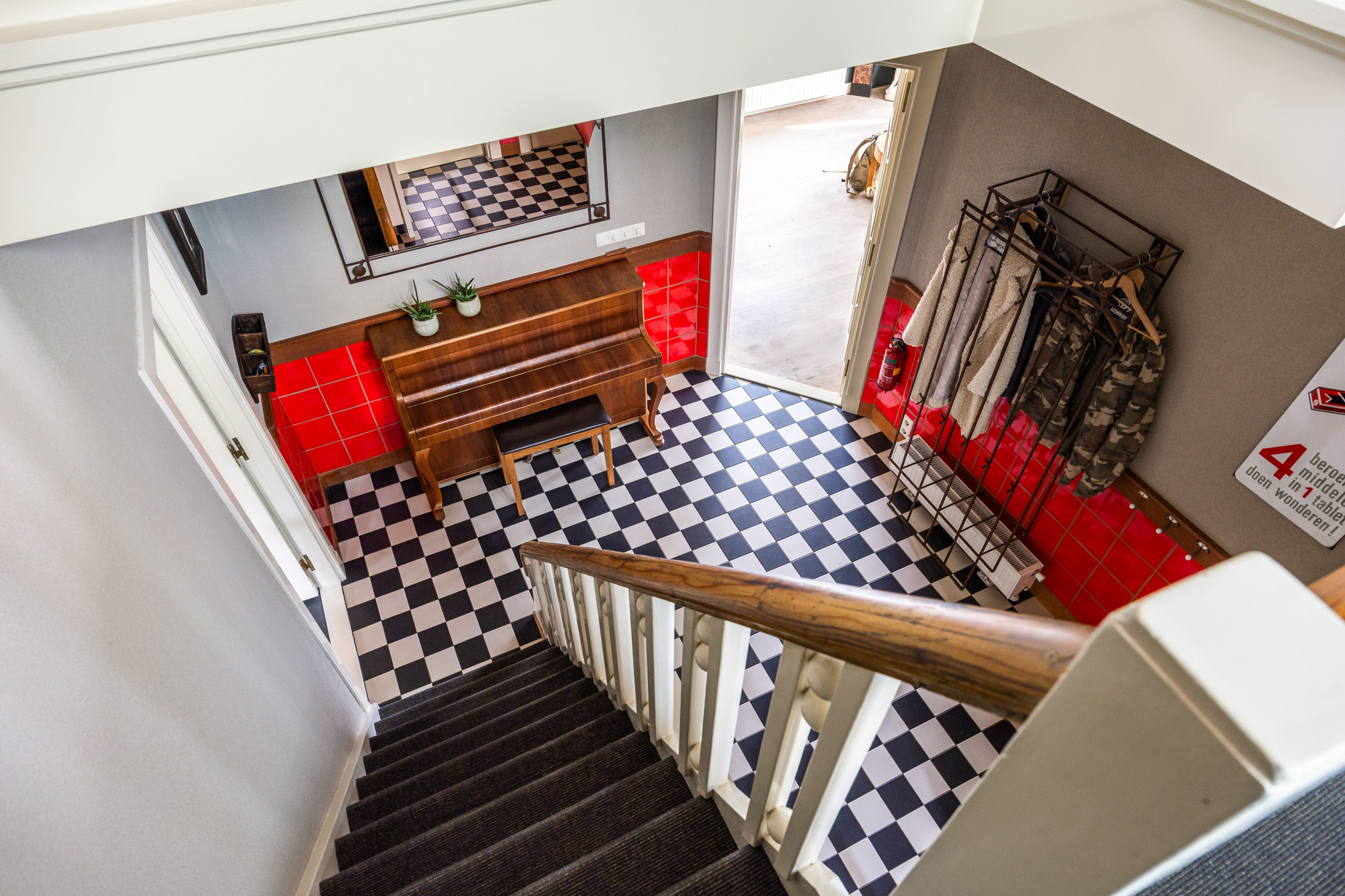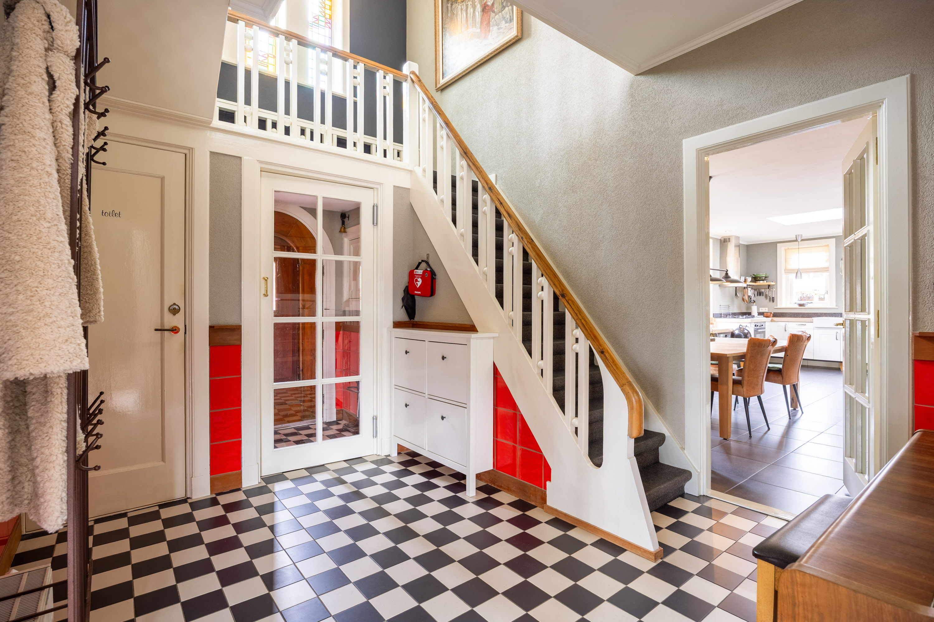 Begane grond: via de karakteristieke voordeur kom je de woning binnen, waar het bijzondere karakter direct voelbaar is – maar dan gecombineerd met comfort en ruimte. Je stapt binnen in de hal waar meteen duidelijk wordt dat dit geen standaard woning is. De centrale hal vormt het hart van het huis en geeft toegang tot het toilet, de keuken en de leefruimtes. In het toilet valt direct het mooie glas-in-loodraam op, een detail dat perfect past bij de stijl van de woning. Tegelijkertijd is het comfort van nu overal aanwezig: vloerverwarming is doorgelegd in de hal, keuken en het toilet, wat zorgt voor een aangename en constante warmte.