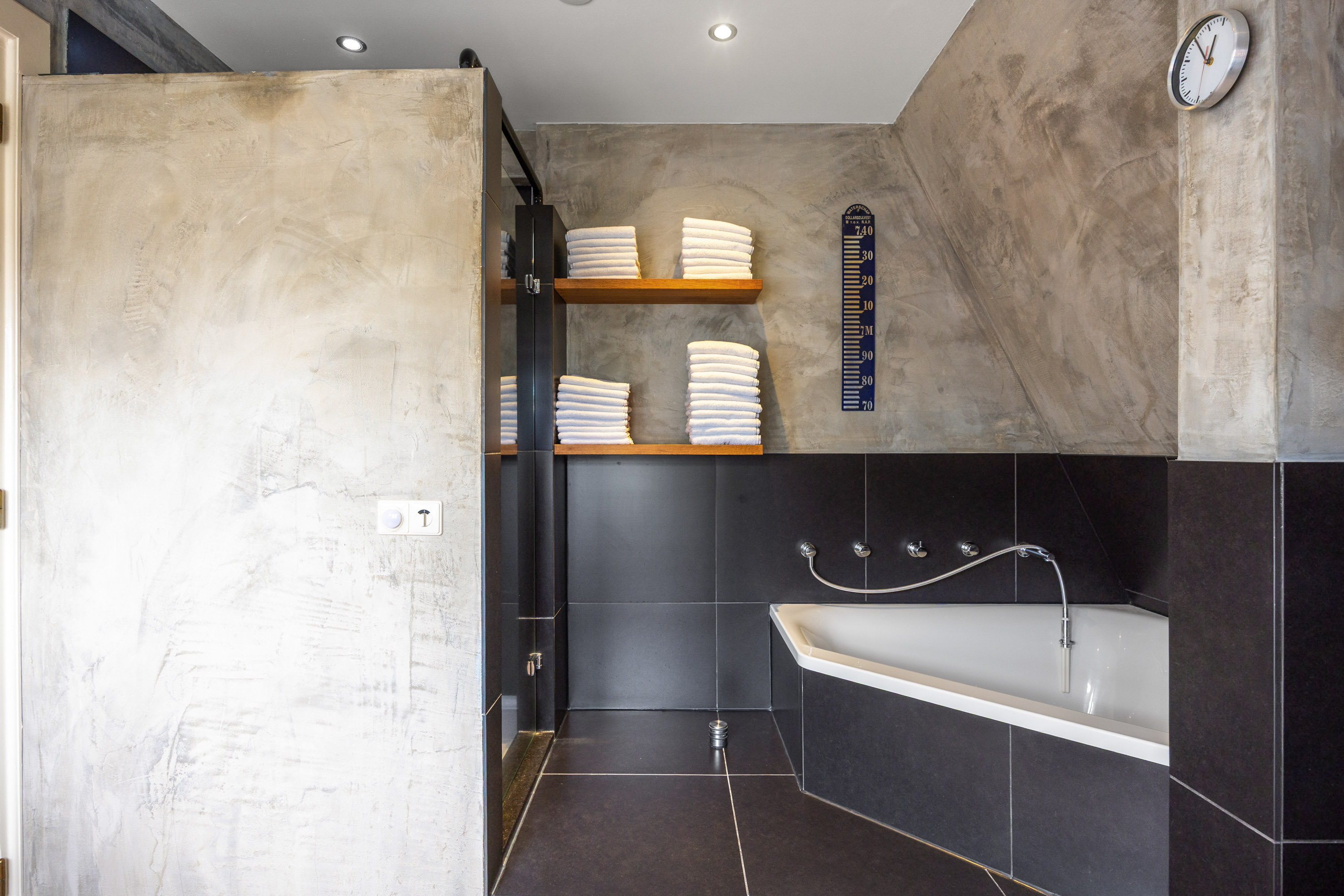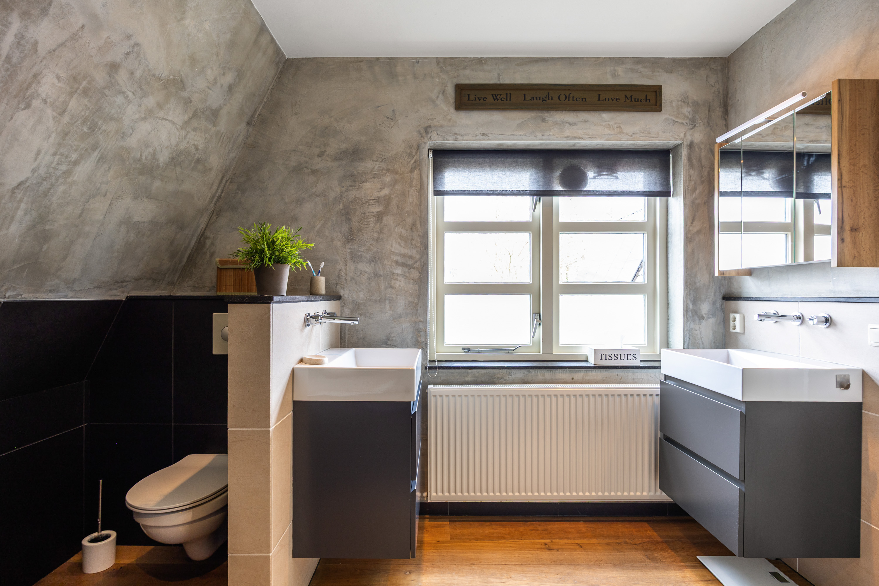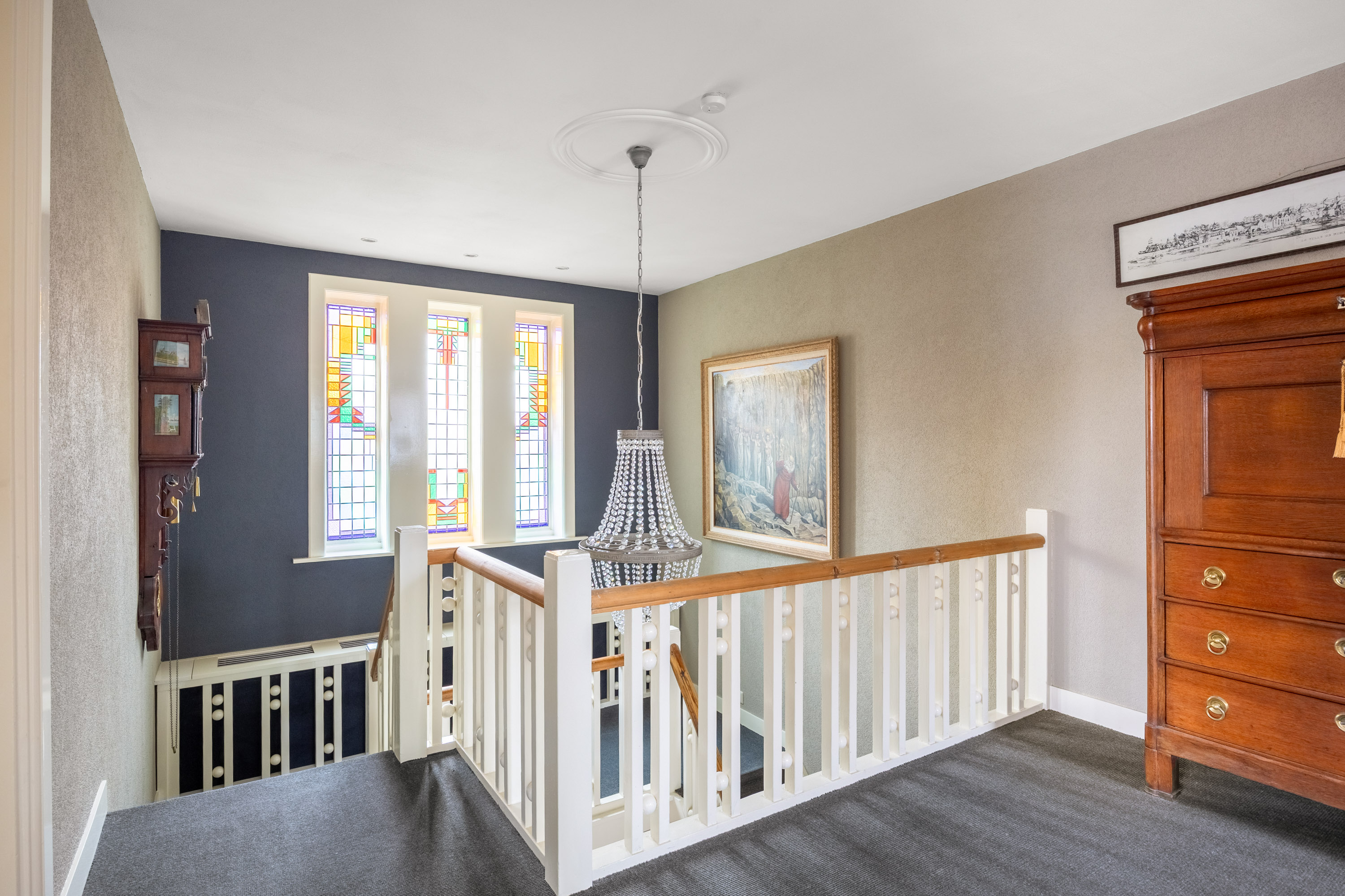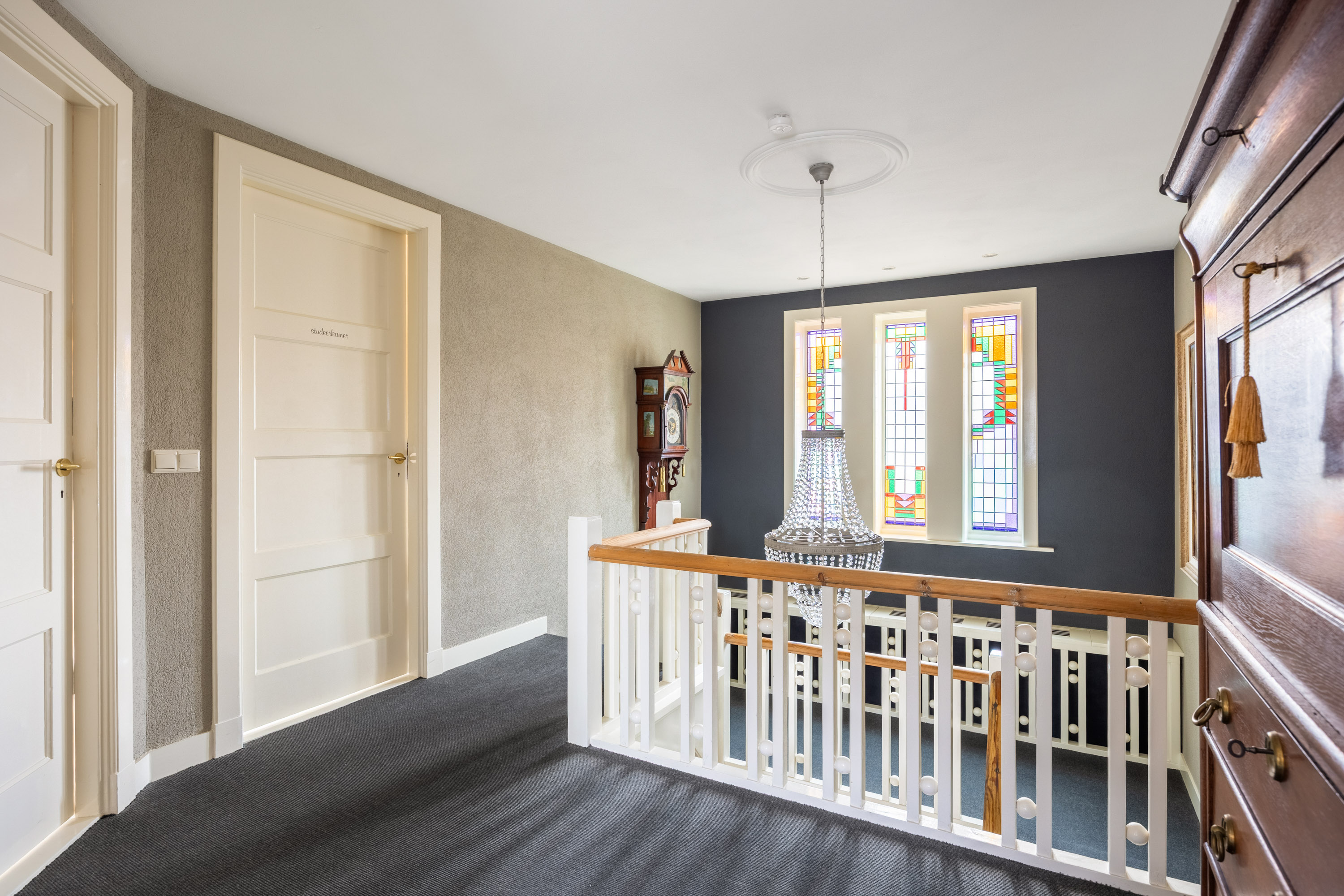 Eerste verdieping: boven zet de ruimte zich moeiteloos voort. Zodra je de trap op loopt, valt direct het mooie glas-in-lood op, dat zorgt voor een sfeervolle lichtinval en perfect aansluit bij het karakter van de woning. Op de eerste verdieping vind je twee ruime slaapkamers en een goed uitgeruste badkamer, praktisch ingedeeld en van alle gemakken voorzien. De badkamer beschikt over een hangend toilet, een wastafel met meubel, een douche en een comfortabel hoekbad. De overloop is opvallend ruim en biedt volop bergruimte, wat zorgt voor een praktische invulling van de verdieping.