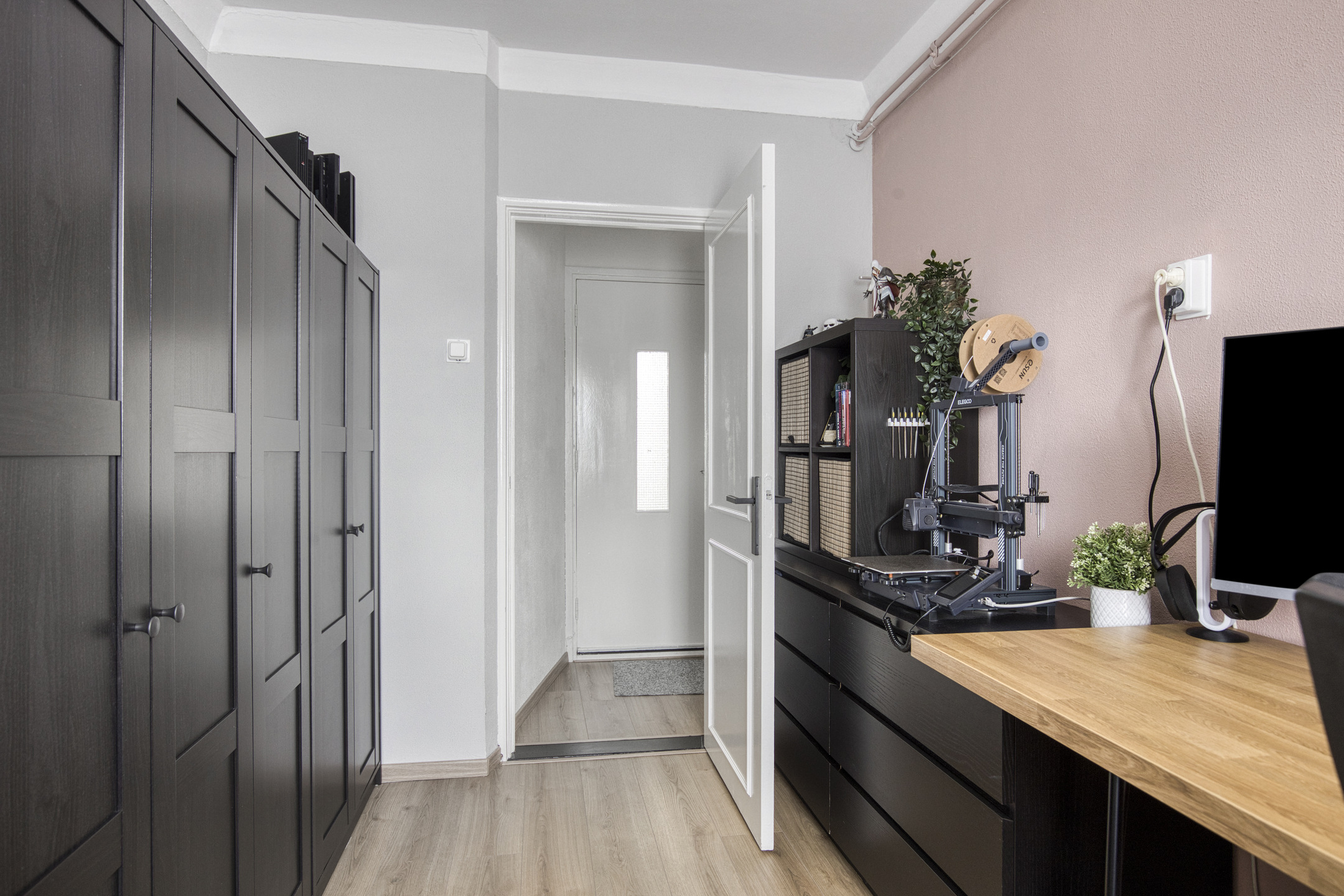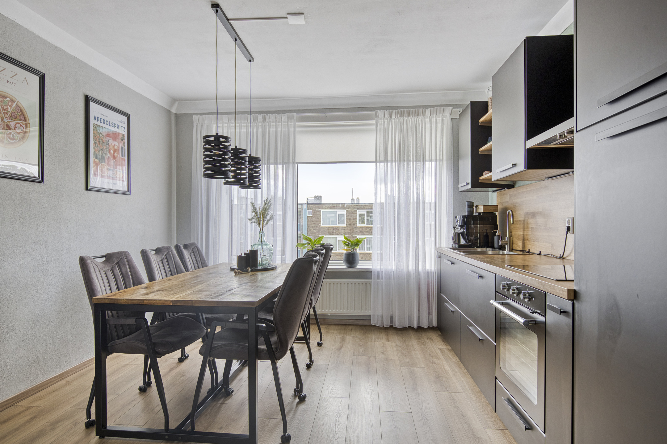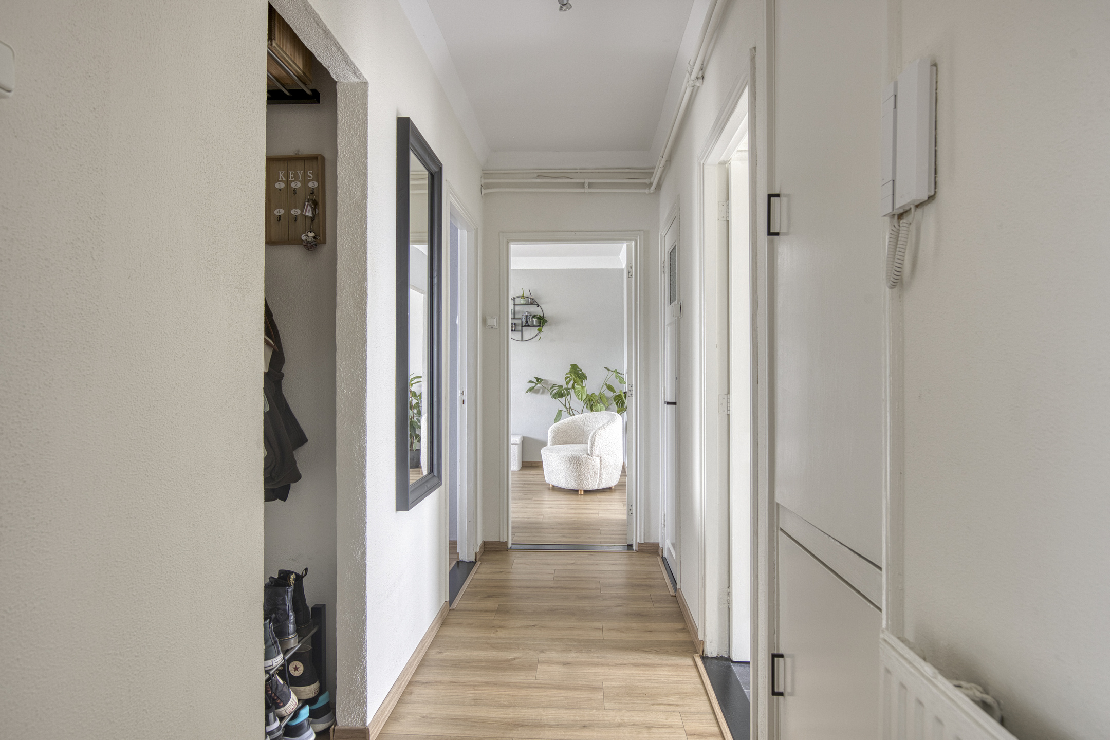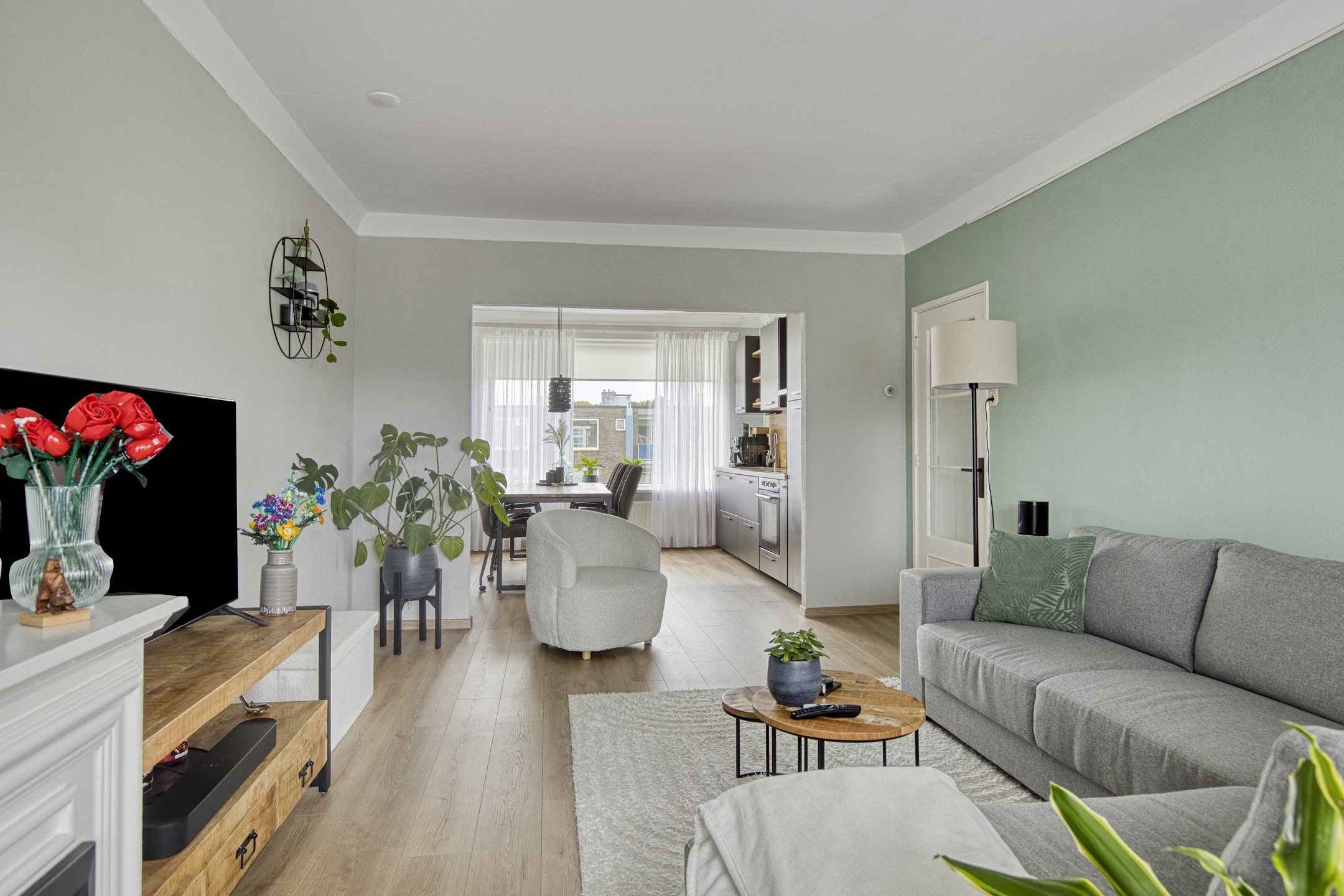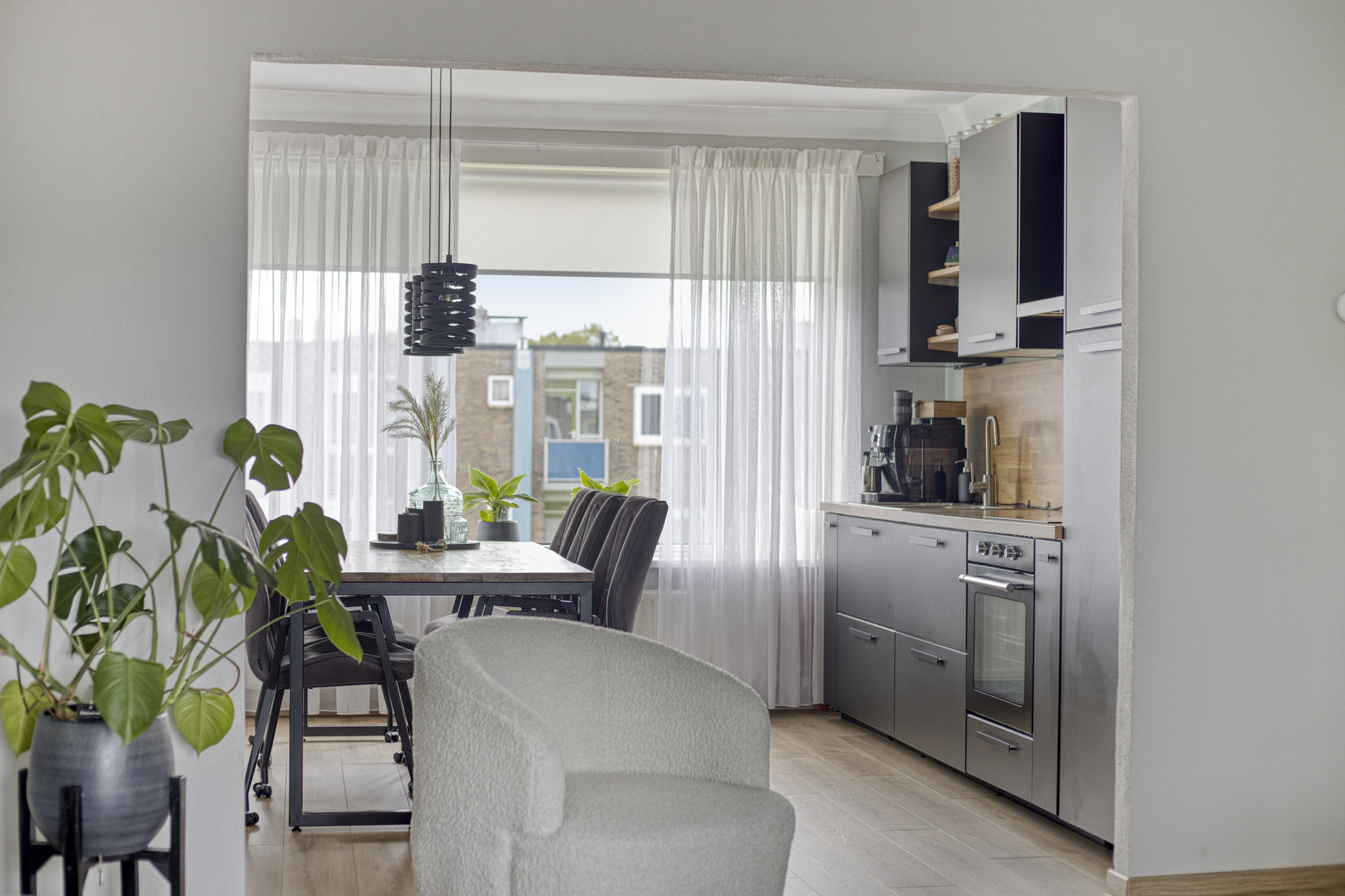 Via de verzorgde entree met intercominstallatie bereik je de trapopgang en het souterrain waar de berging zich bevindt, ideaal voor fietsen en extra opslag. Eenmaal in het appartement stap je binnen in de ruime hal die toegang biedt tot alle vertrekken. De doorlopende laminaatvloer geeft het geheel een rustige en stijlvolle basis. De woonkamer voelt ruim en licht aan dankzij de grote raampartijen. Dankzij de open verbinding tussen de eetkamer en keuken is dit een fijne plek om samen te komen. De moderne keuken in matzwart met houtaccenten is voorzien van diverse inbouwapparatuur en veel kastruimte.