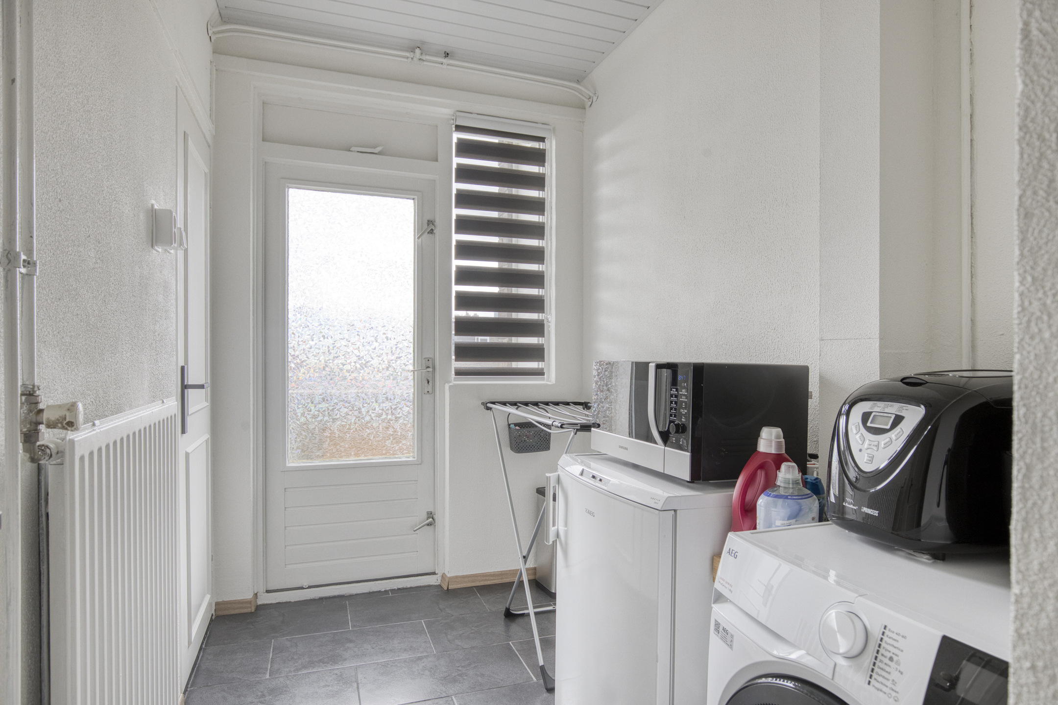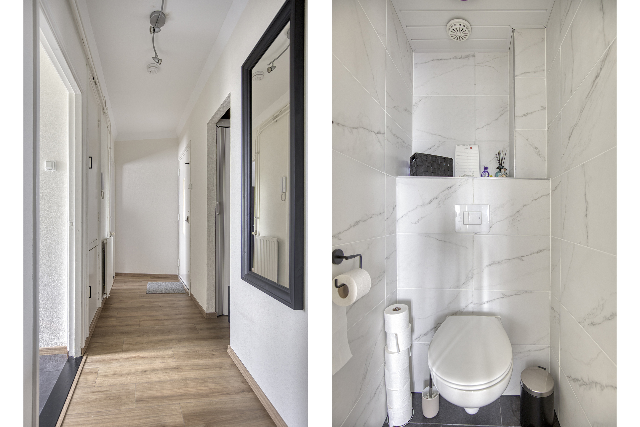 De badkamer is strak afgewerkt met marmerlook wandtegels, een inloopdouche met glazen deur en een modern wastafelmeubel. Het toilet is uitgevoerd in dezelfde stijl. In de praktische bijkeuken is plek voor een witgoedopstelling en extra opbergruimte, met tevens toegang tot het balkon aan de achterzijde.
