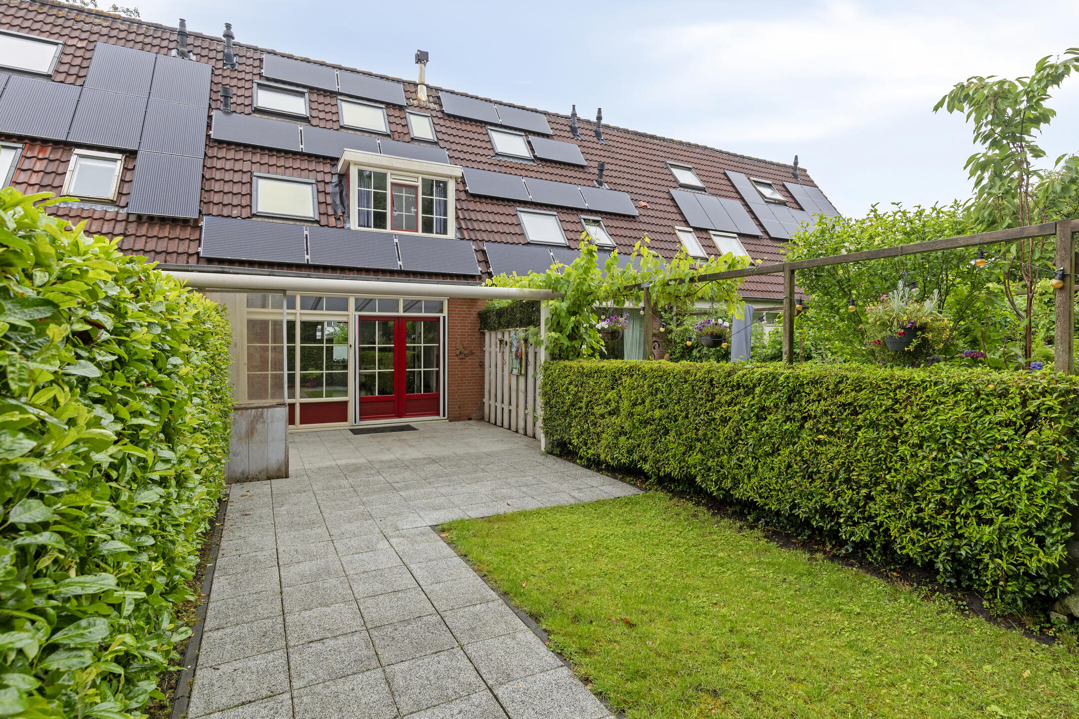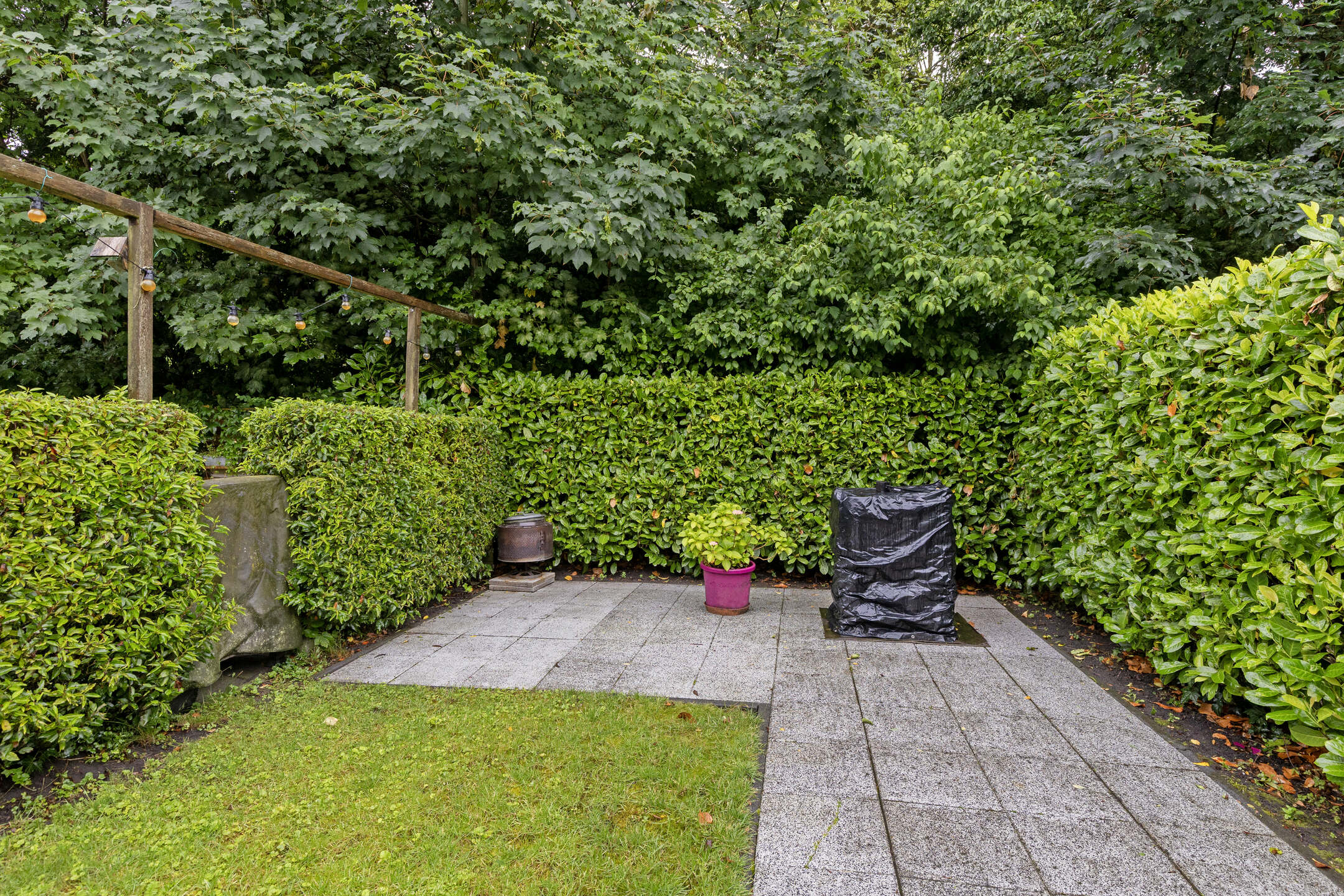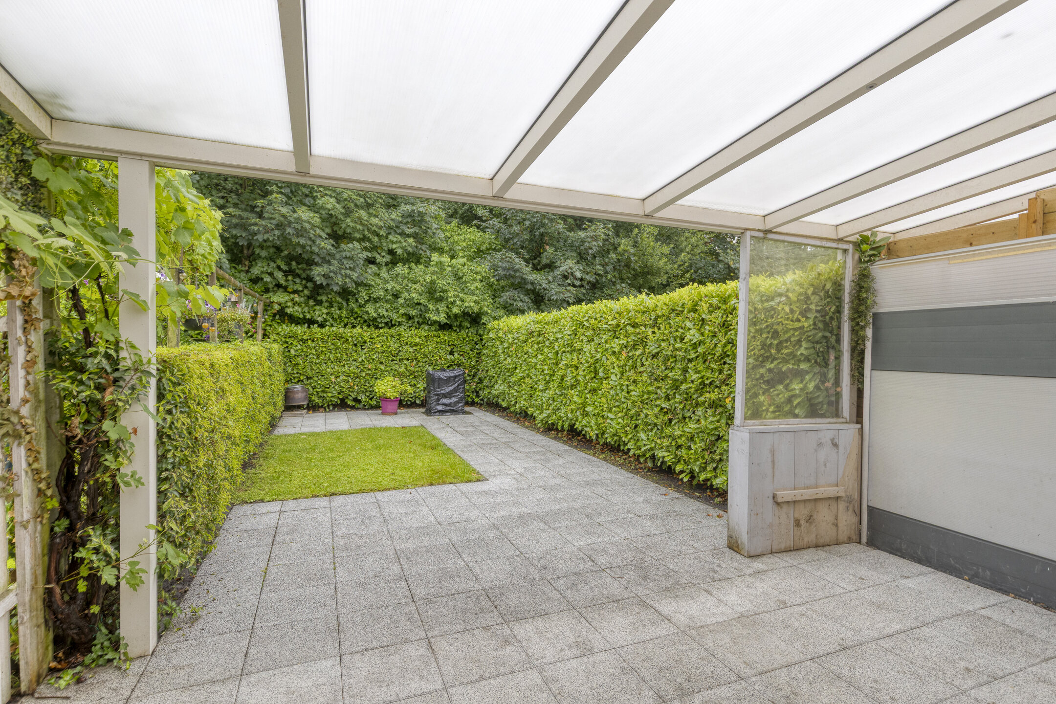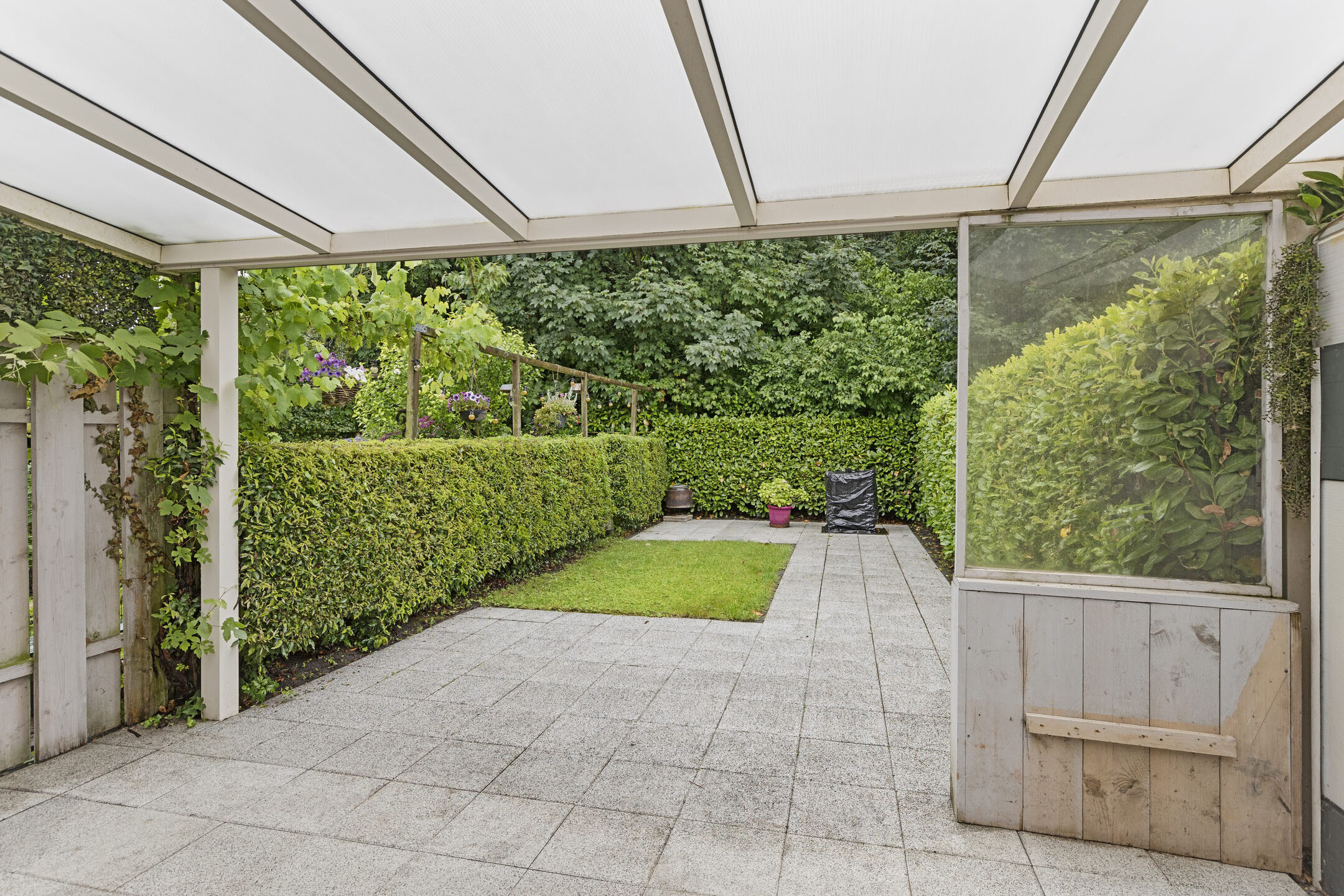 - Beschutte achtertuin met overkapping.