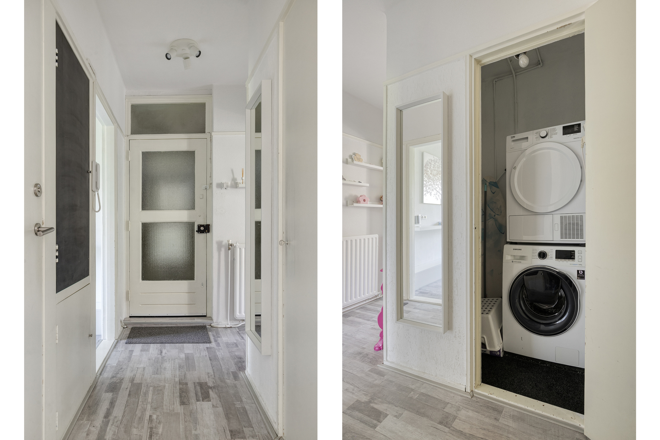 Entree en hal: je komt binnen via een nette portiek van het appartement. Deze wordt om de week schoongemaakt. Bij binnenkomst in de hal zijn vrijwel alle ruimtes direct toegankelijk. In de hal bevindt zich tevens een handige bergkast met wasmachine aansluiting.