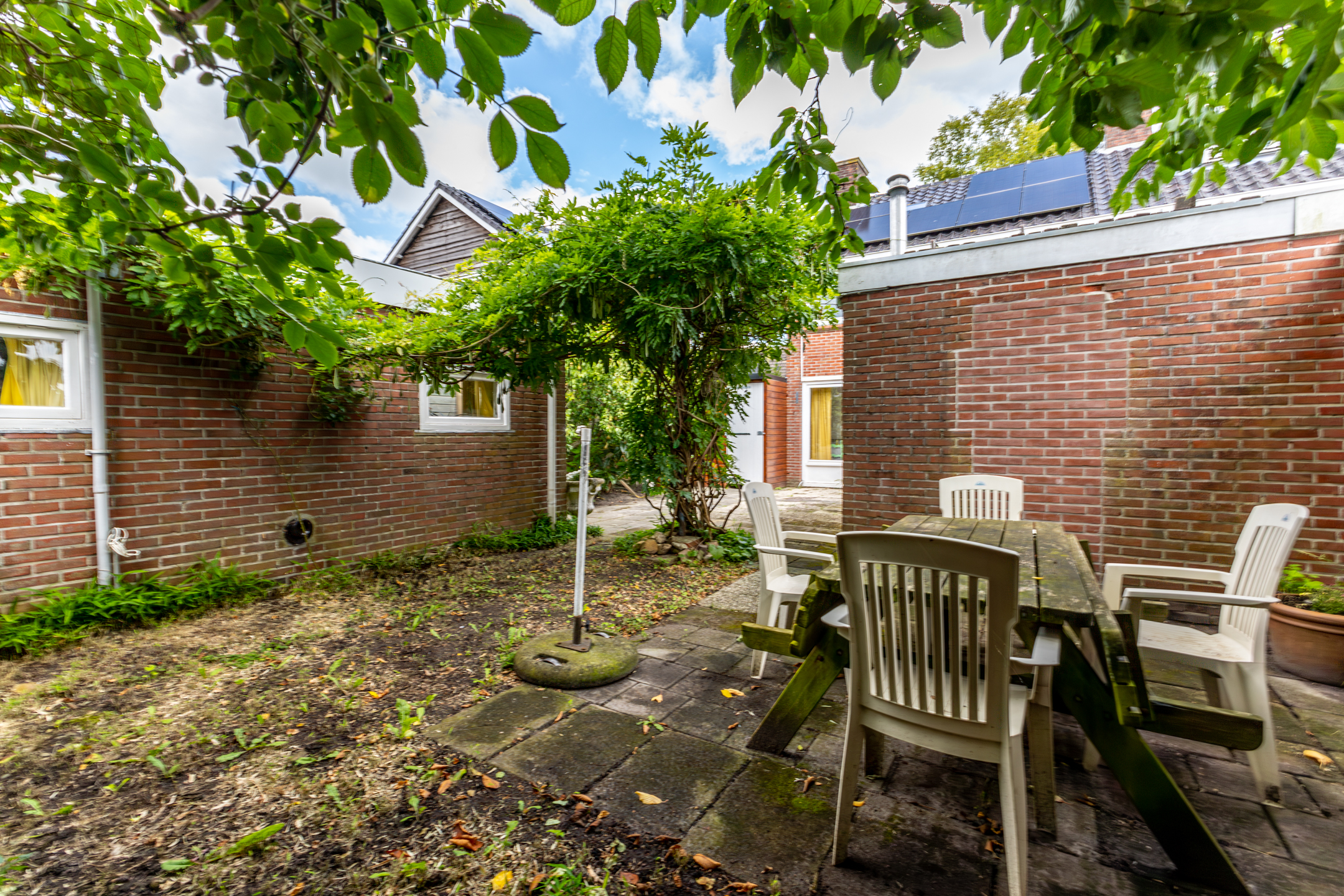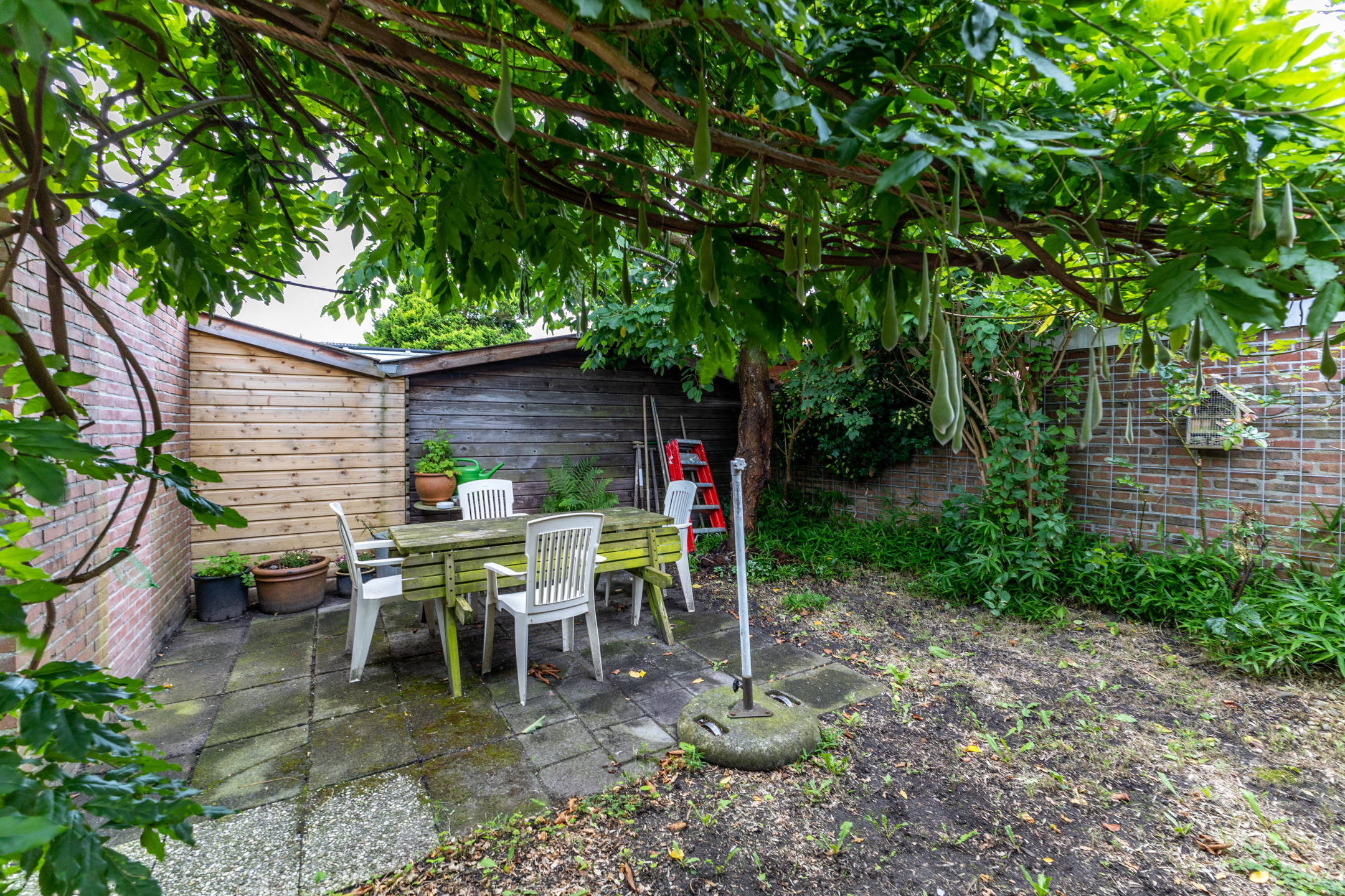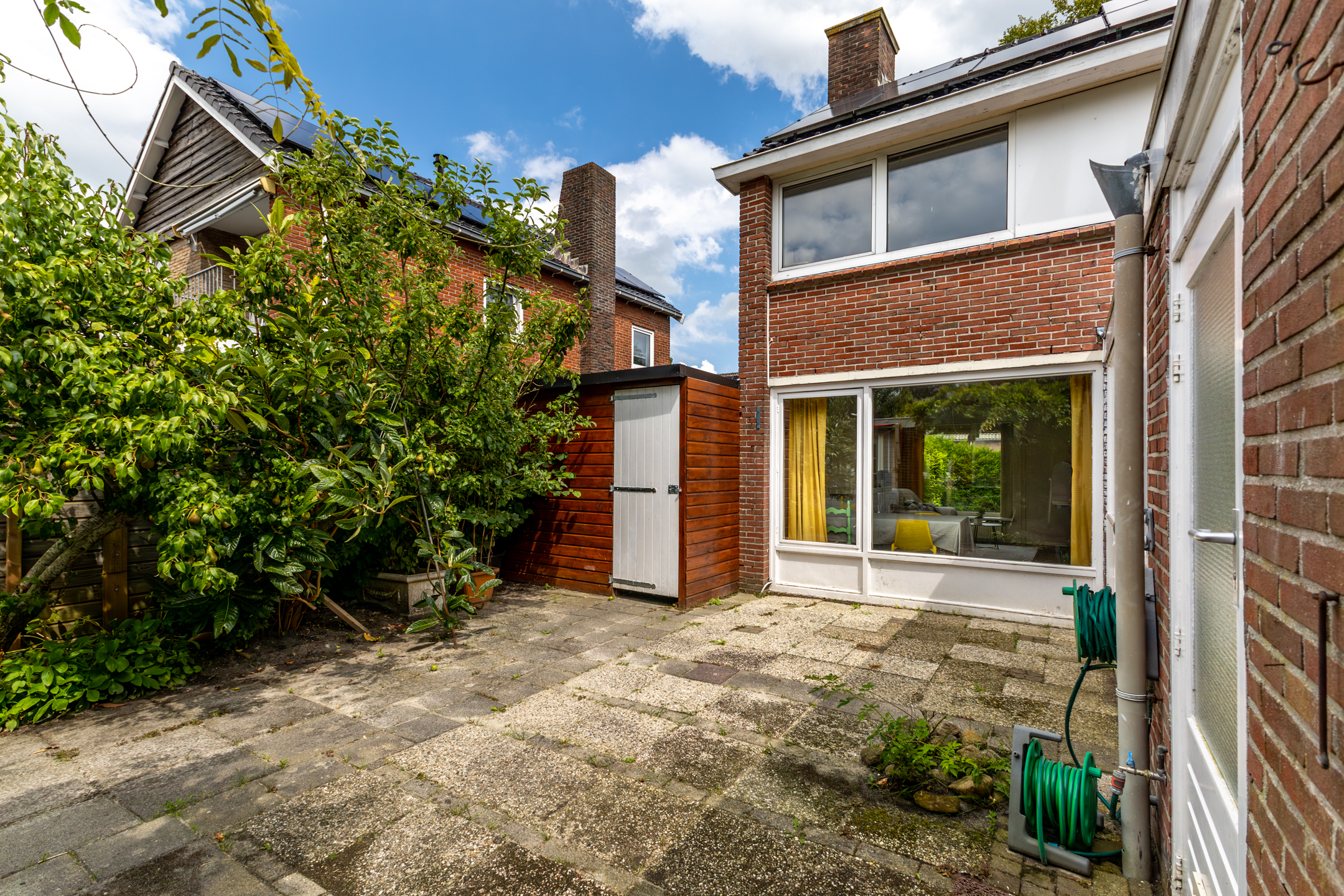 Buiten: de woning beschikt over een ruime tuin, perfect voor kinderen om in te spelen of voor het houden van gezellige zomerbarbecues. In de tuin staat een aangebouwde houten berging die extra opslagruimte biedt. Daarnaast is er een vrijstaand gastenverblijf dat voor meerdere doeleinden gebruikt kan worden. Dit gastenverblijf is verwarmd en voorzien van een keukenblok, douche en toilet, wat het ideaal maakt voor gasten of als thuiskantoor.