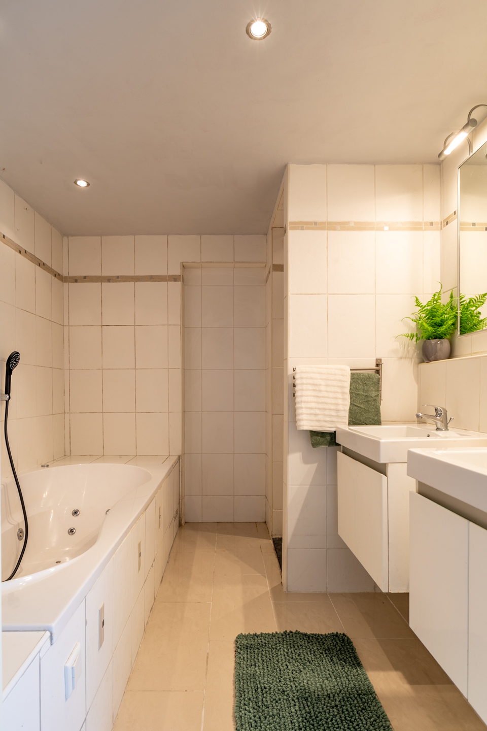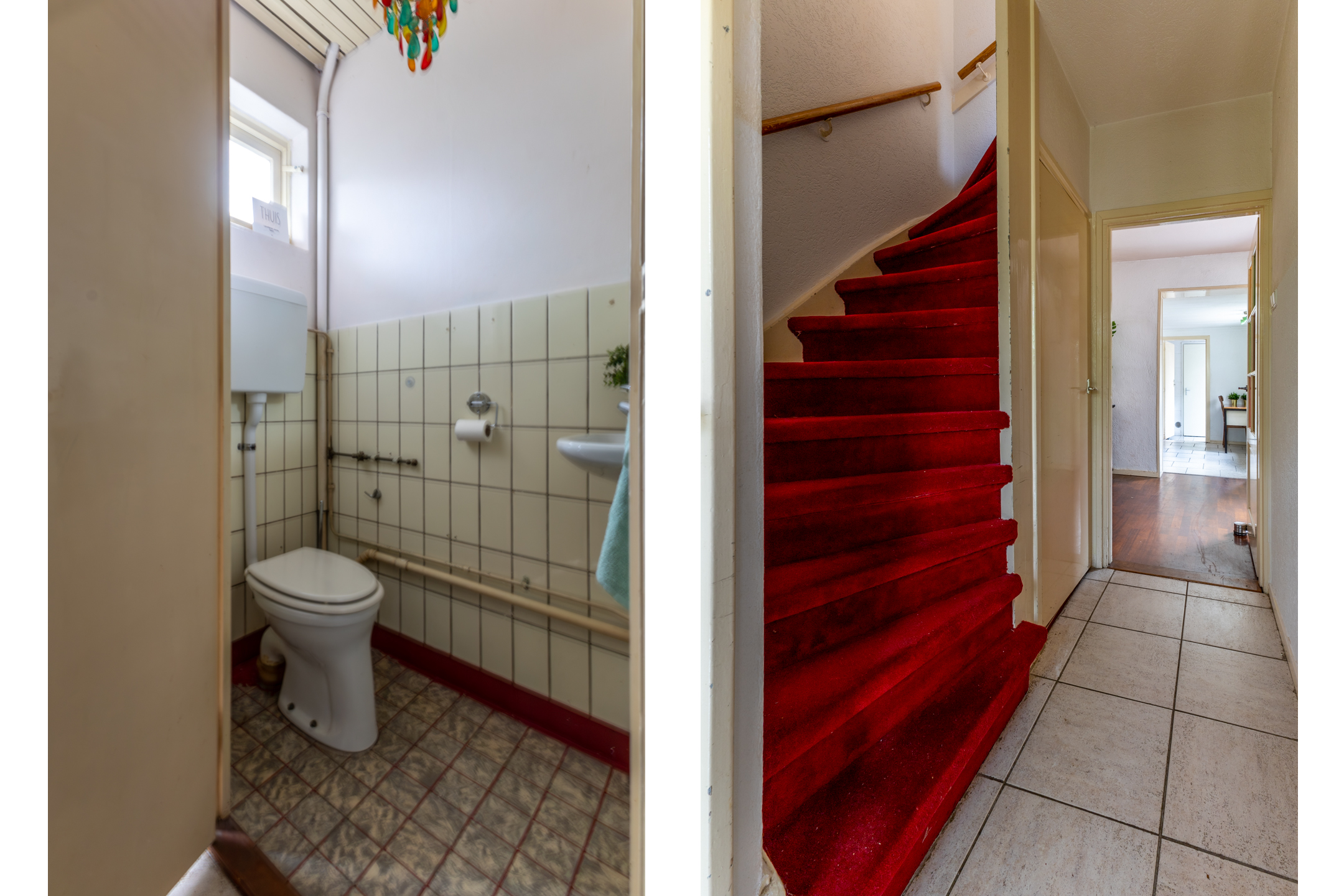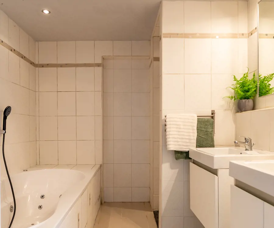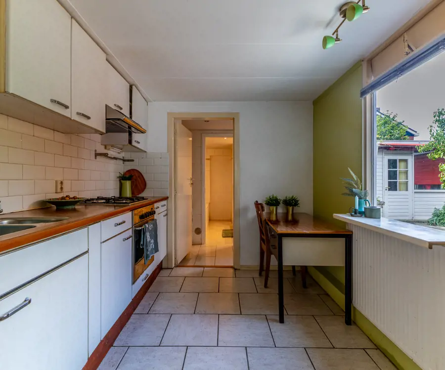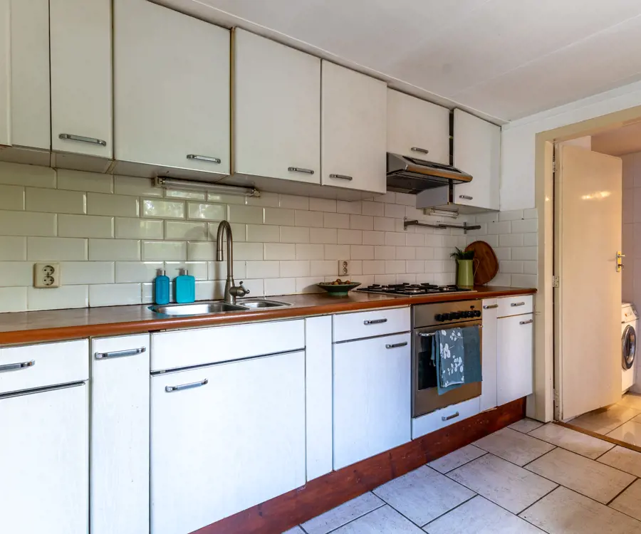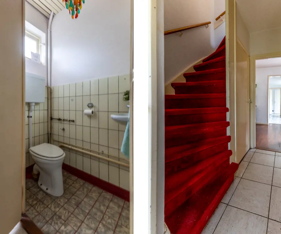 Begane grond: bij binnenkomst via de hal bevindt zich direct aan de linkerkant een toiletruimte. Vanuit de hal kom je in de ruime en lichte woonkamer, die dankzij de grote ramen veel natuurlijk lichtinval heeft. De woonkamer biedt voldoende ruimte voor een gezellige zithoek en een eethoek. Aansluitend aan de woonkamer vind je de keuken. Naast de keuken is een handige bijkeuken, ideaal voor extra opslag en het plaatsen van een wasmachine en droger. De badkamer op de begane grond is uitgerust met een douche, ligbad, dubbele wastafel en toilet.