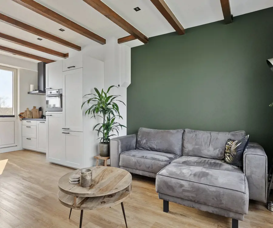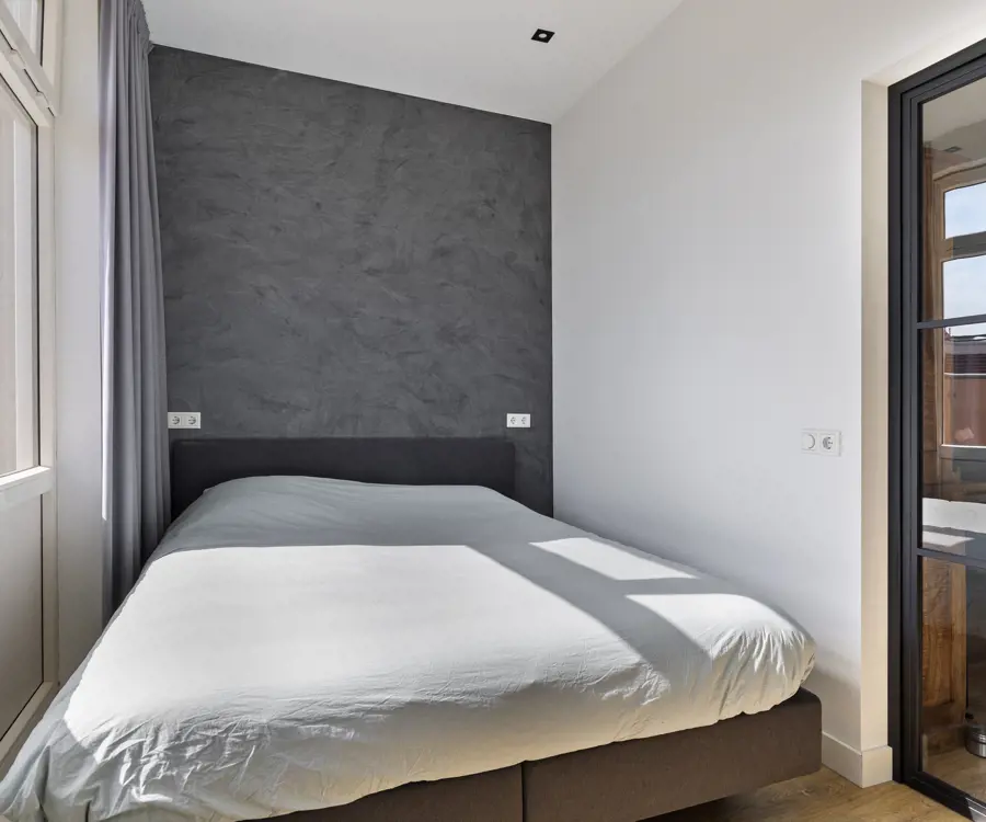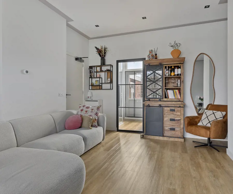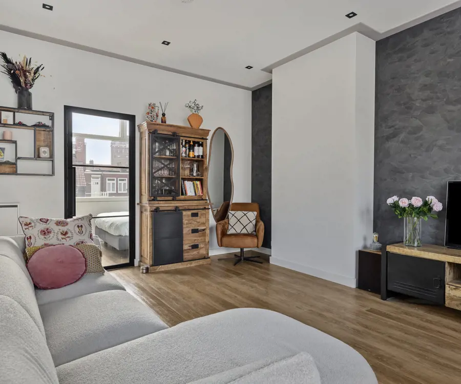 De tweede verdieping is ingericht als een zelfstandige woonruimte, met een tweede woonkamer, open keuken voorzien van inbouwapparatuur, een moderne badkamer met douche, wastafelmeubel en hangtoilet , en een tweede slaapkamer. Ook hier zijn balkons aanwezig, grenzend aan de woonkamer. Belangrijk om te vermelden is dat de woonkamer op deze verdieping eenvoudig anders ingedeeld kan worden, zodat er een derde slaapkamer gecreëerd wordt — zonder dat dit ten koste hoeft te gaan van het wooncomfort. Dit maakt de woning extra flexibel en toekomstbestendig.