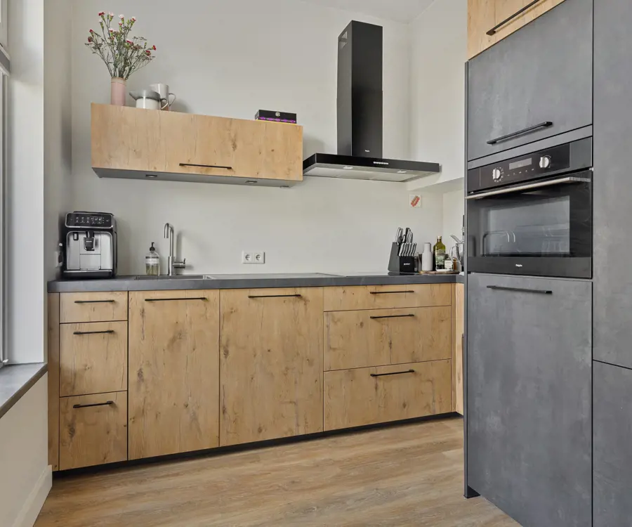 Via de trap bij de voordeur bereik je de eerste verdieping, waar je binnenkomt in de ruime en lichte woonkamer met een open keuken en eetgedeelte. Vanuit deze centrale leefruimte heb je toegang tot de eerste slaapkamer, een moderne badkamer met douche, wastafelmeubel en toilet, en een praktische bergkast. Dankzij de grote ramen is de woonkamer heerlijk licht en voelt deze extra ruim aan. De open keuken is uitgerust met moderne inbouwapparatuur en vormt een stijlvolle aanvulling op de leefruimte. Vanuit de slaapkamer stap je zo het balkon op aan de achterzijde – een fijne plek voor een kop koffie in de ochtendzon.