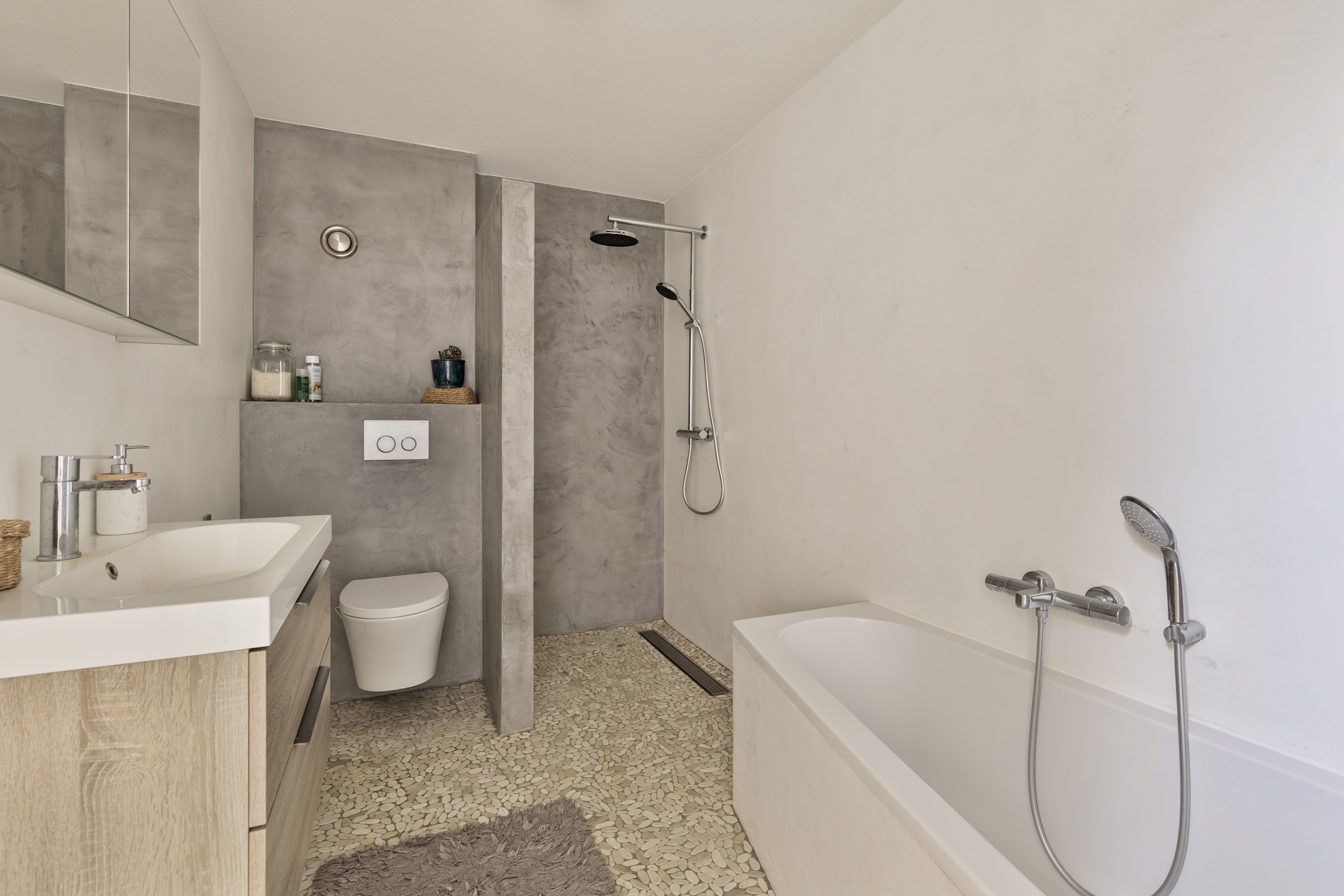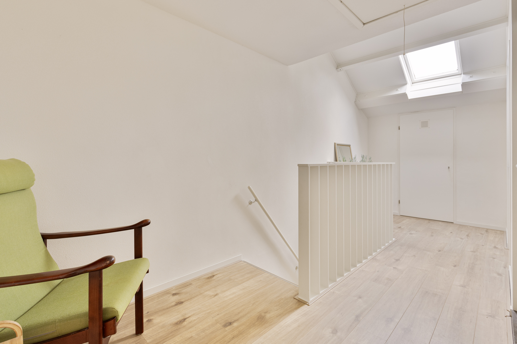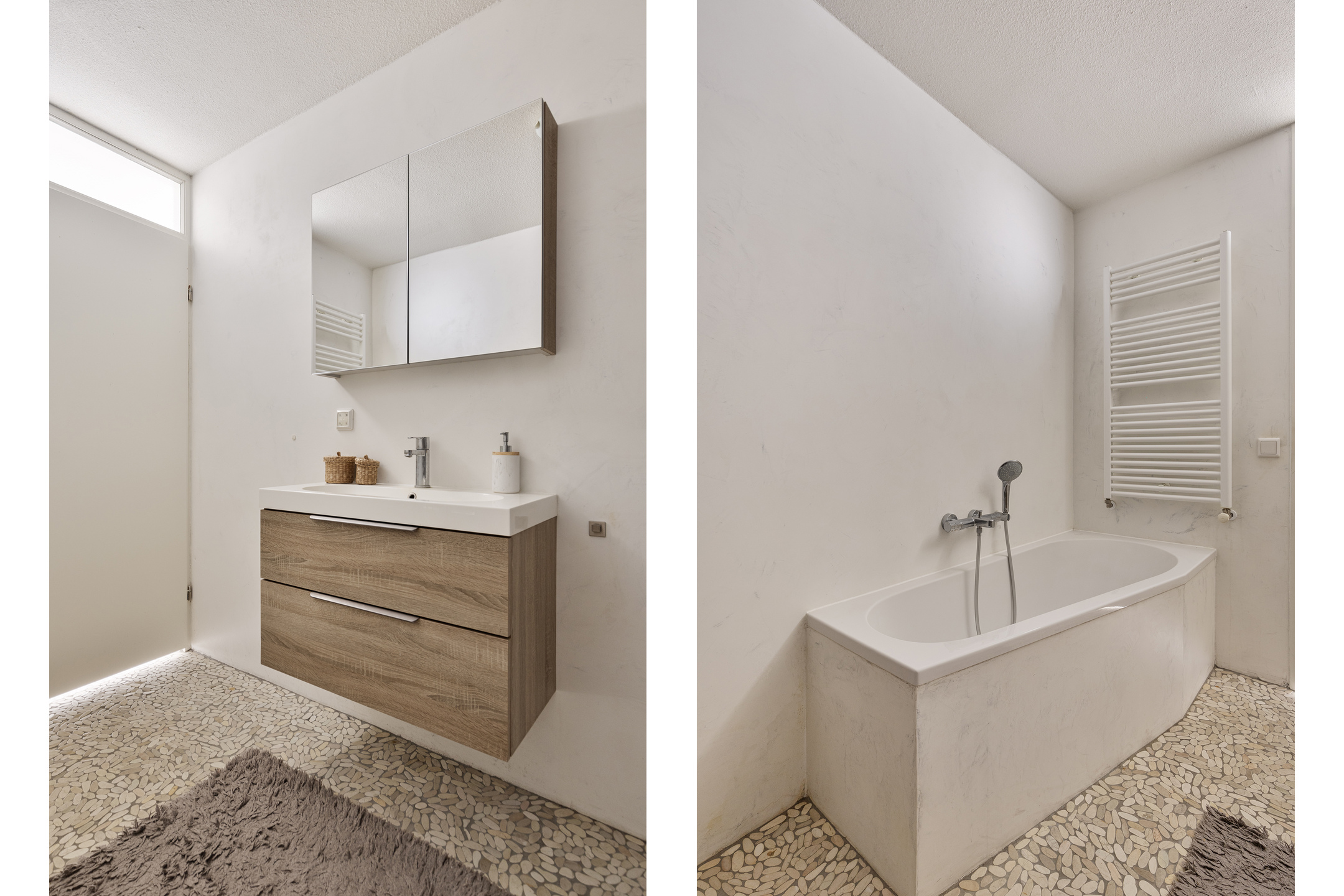 Eerste verdieping: de overloop biedt toegang tot drie ruime slaapkamers. De grootste slaapkamer, gelegen aan de achterzijde, heeft een hoog plafond dat een ruimtelijk gevoel geeft. De moderne badkamer is stijlvol afgewerkt en voorzien van een ligbad, inloopdouche, toilet en wastafelmeubel. Daarnaast is er een praktische wasruimte aanwezig.