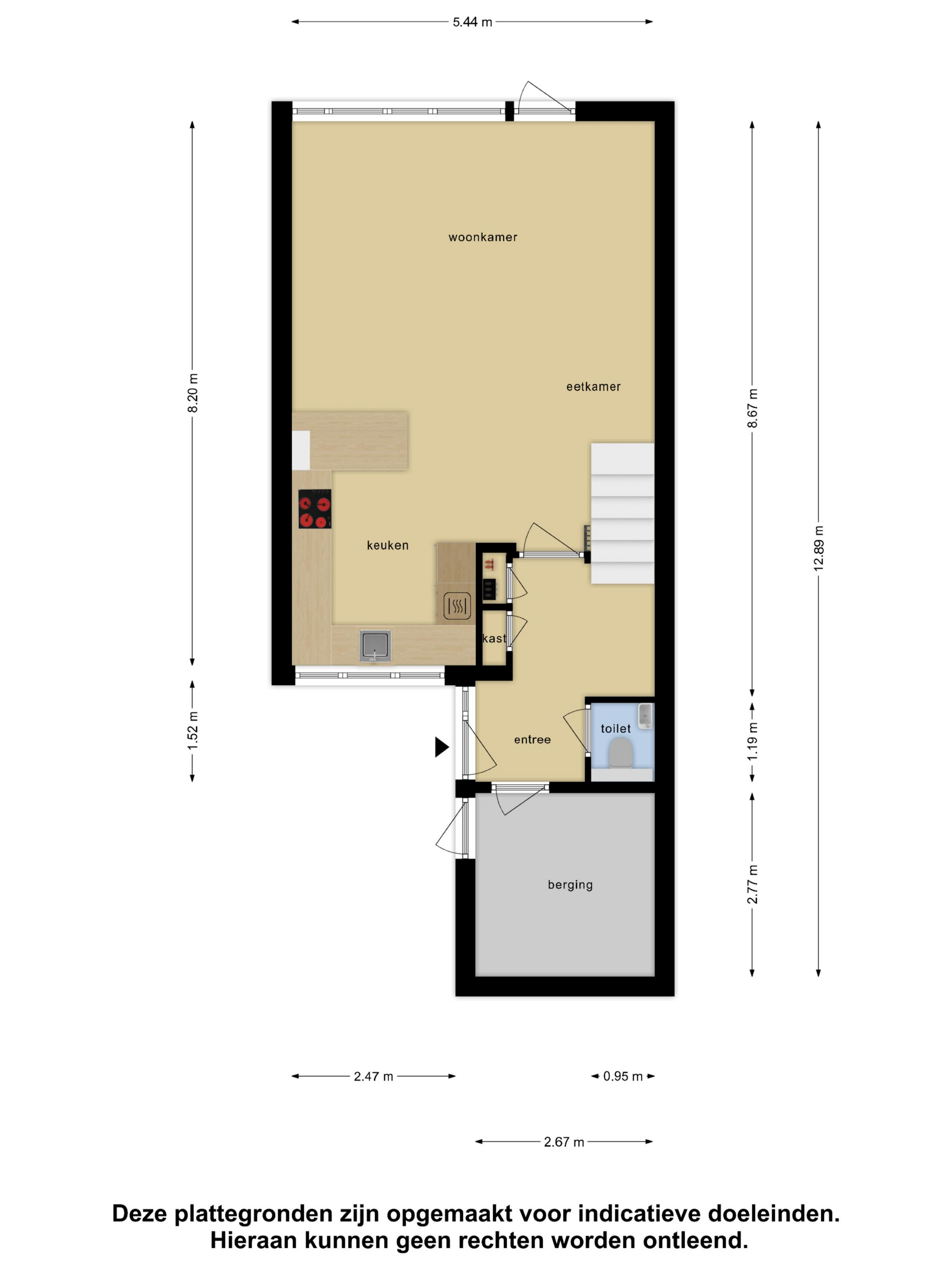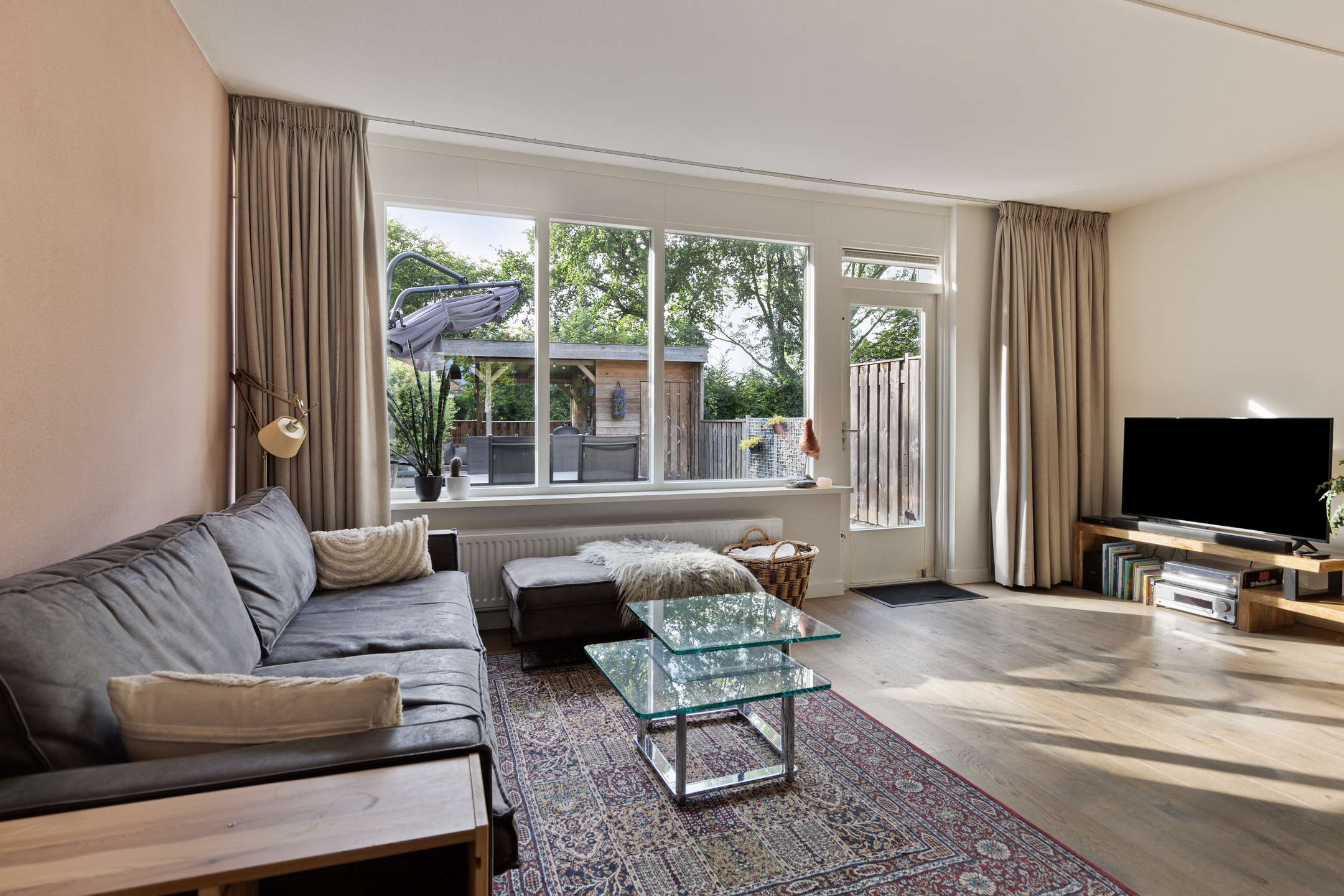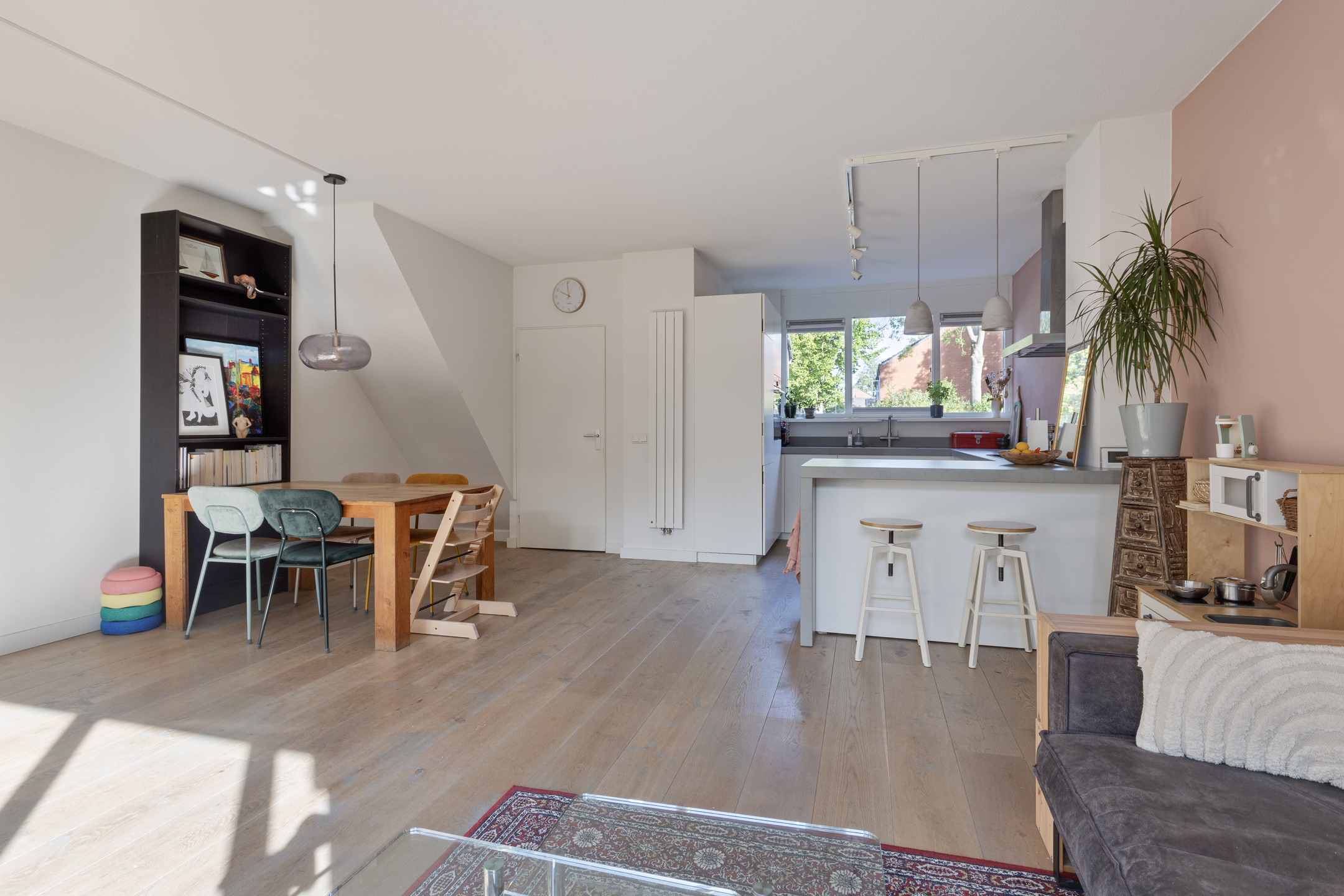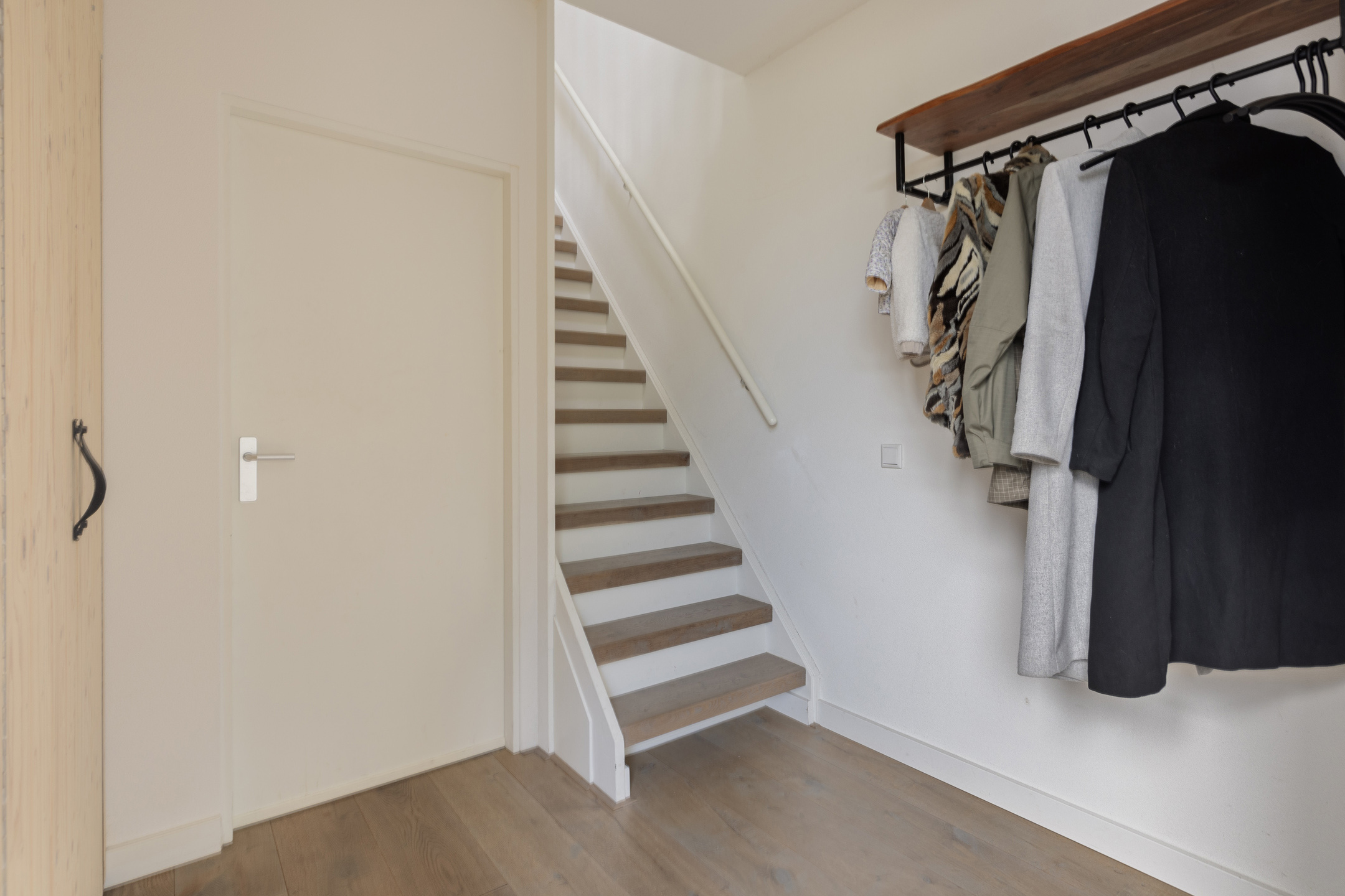 Begane grond: entree/hal voorzien van een vernieuwde meterkast. Vanuit de hal is tevens de berging te bereiken, die ook vanaf buiten toegankelijk is. Via de hal/entree, waar zich ook de toegang tot het moderne toilet en de trap naar de eerste verdieping bevinden, betreed je de lichte woonkamer. De woonkamer beschikt over grote raampartijen die zorgen voor veel natuurlijk lichtinval en zicht op de achtertuin. Aangrenzend vind je de moderne open keuken, compleet uitgerust met diverse inbouwapparatuur.