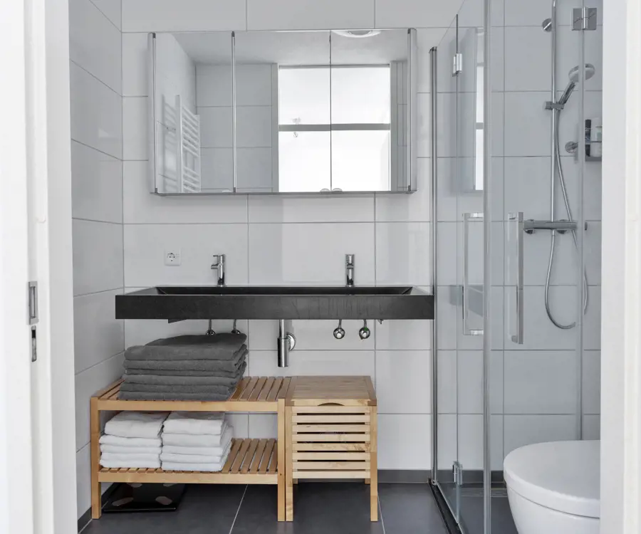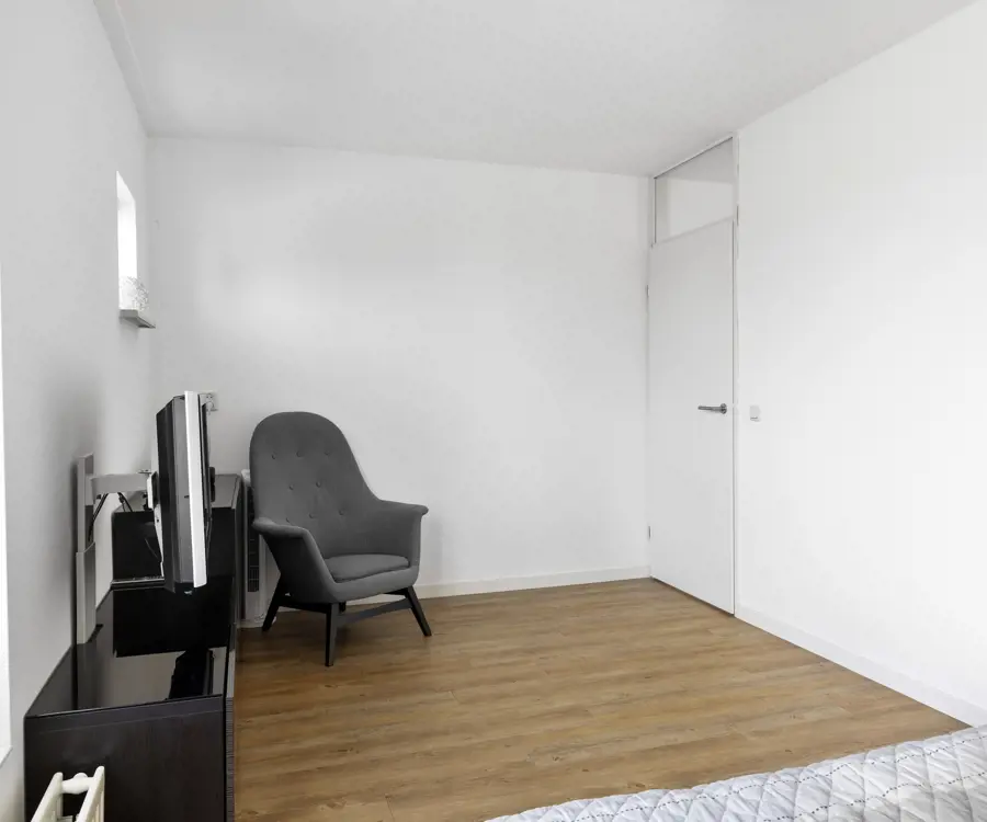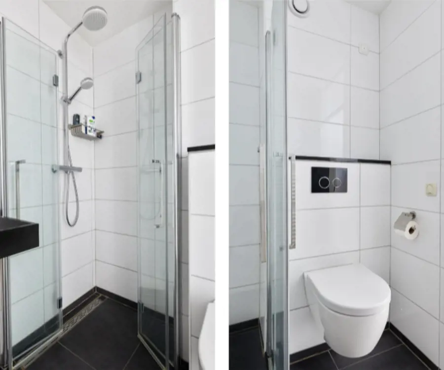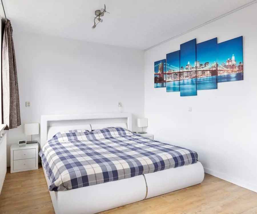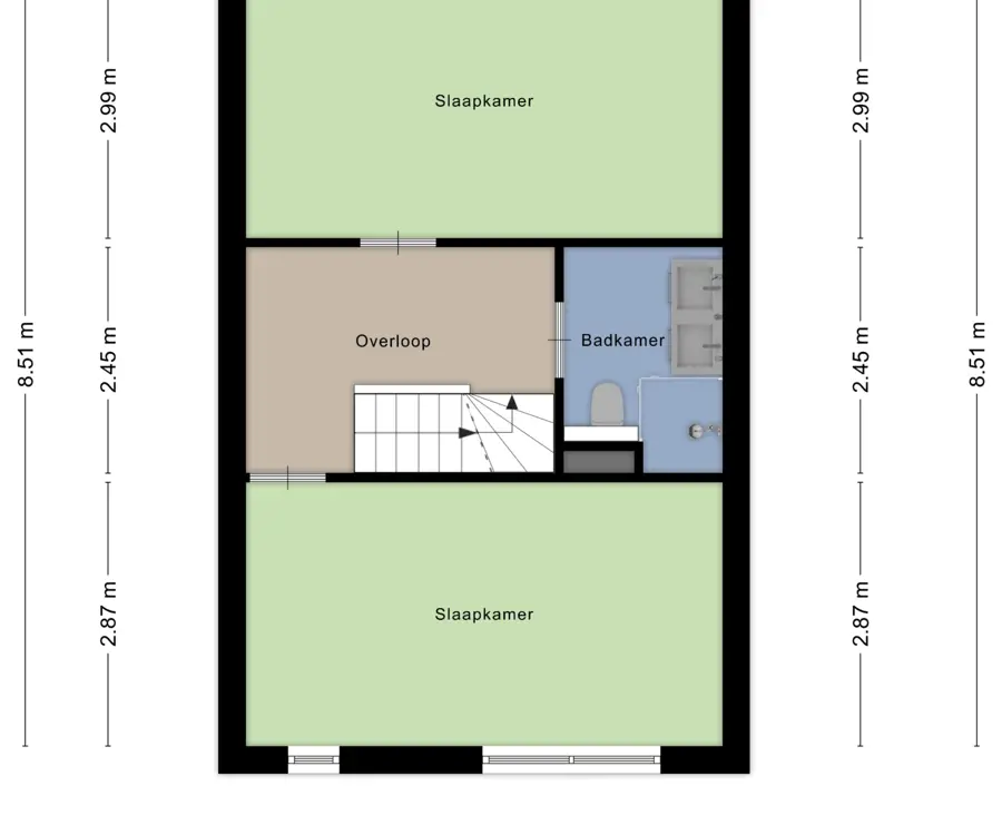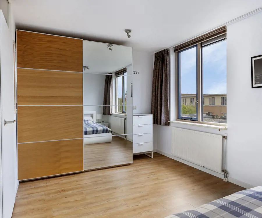 Eerste verdieping: op de eerste verdieping bevinden zich twee ruime slaapkamers van vergelijkbare afmetingen aan de voor- en achterzijde. De slaapkamer aan de achterzijde is eenvoudig op te delen in twee slaapkamers. De overloop biedt toegang tot de moderne badkamer, die is uitgerust met een douche, dubbele wastafel en een tweede toilet. Alles is strak afgewerkt.