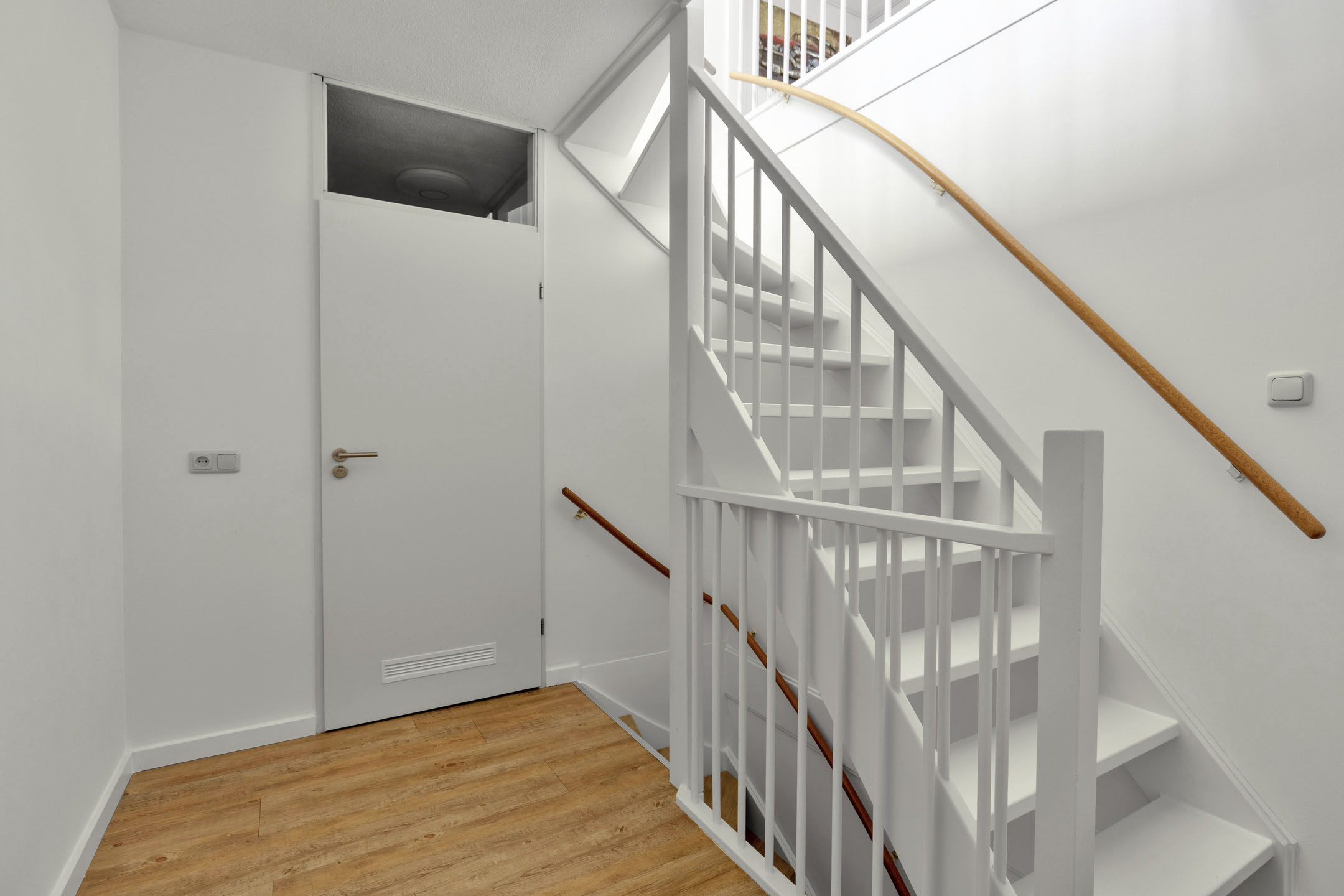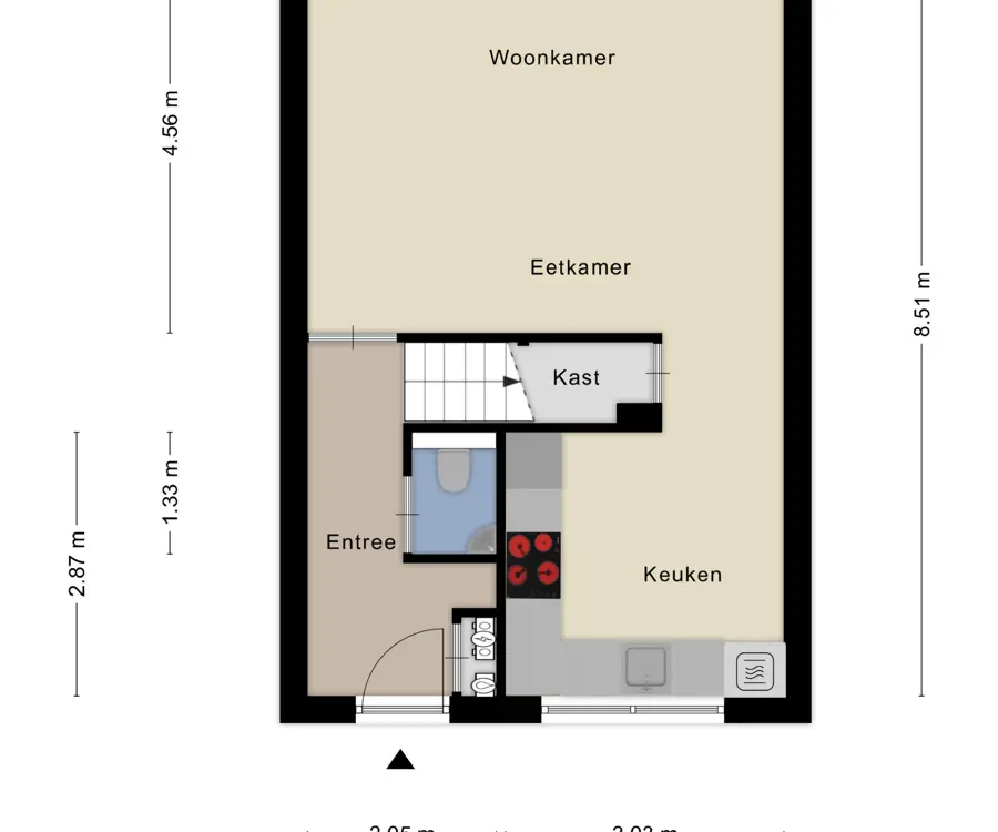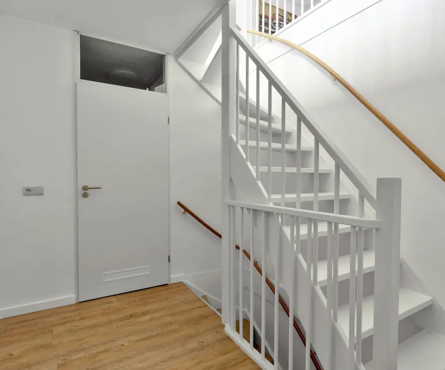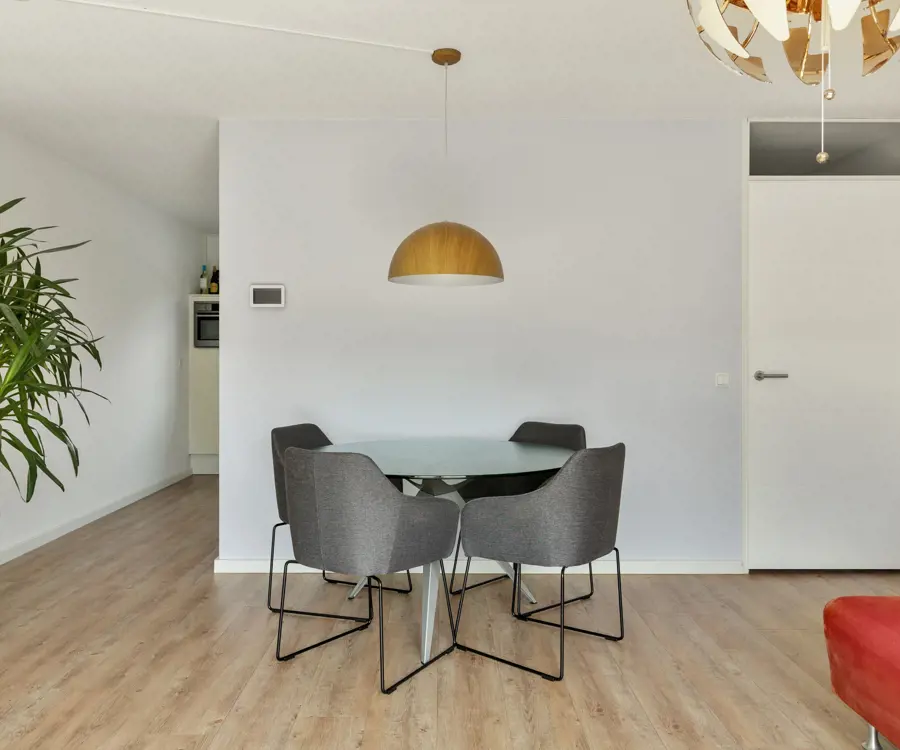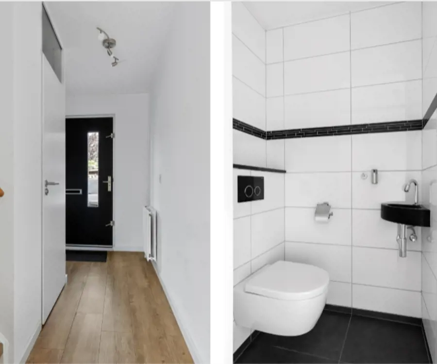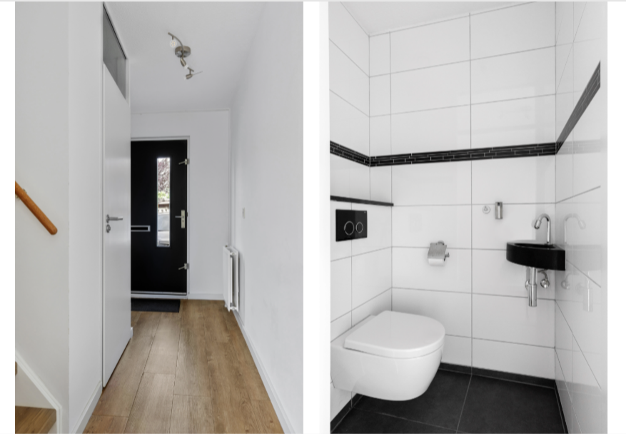 Begane grond: via de voordeur betreed je de ruime hal met toegang tot het toilet, de meterkast en de trapopgang. De lichte en ruime woonkamer bevindt zich aan de achterzijde van de woning en staat in open verbinding met de keuken. De grote schuifpui geeft toegang tot de tuin en zorgt voor veel daglicht. Aan de voorzijde ligt de moderne keuken in een hoekopstelling, voorzien van diverse inbouwapparatuur zoals een vaatwasser, combi-oven, inductiekookplaat en afzuigkap. Onder de trap is een handige trapkast aanwezig voor extra bergruimte.