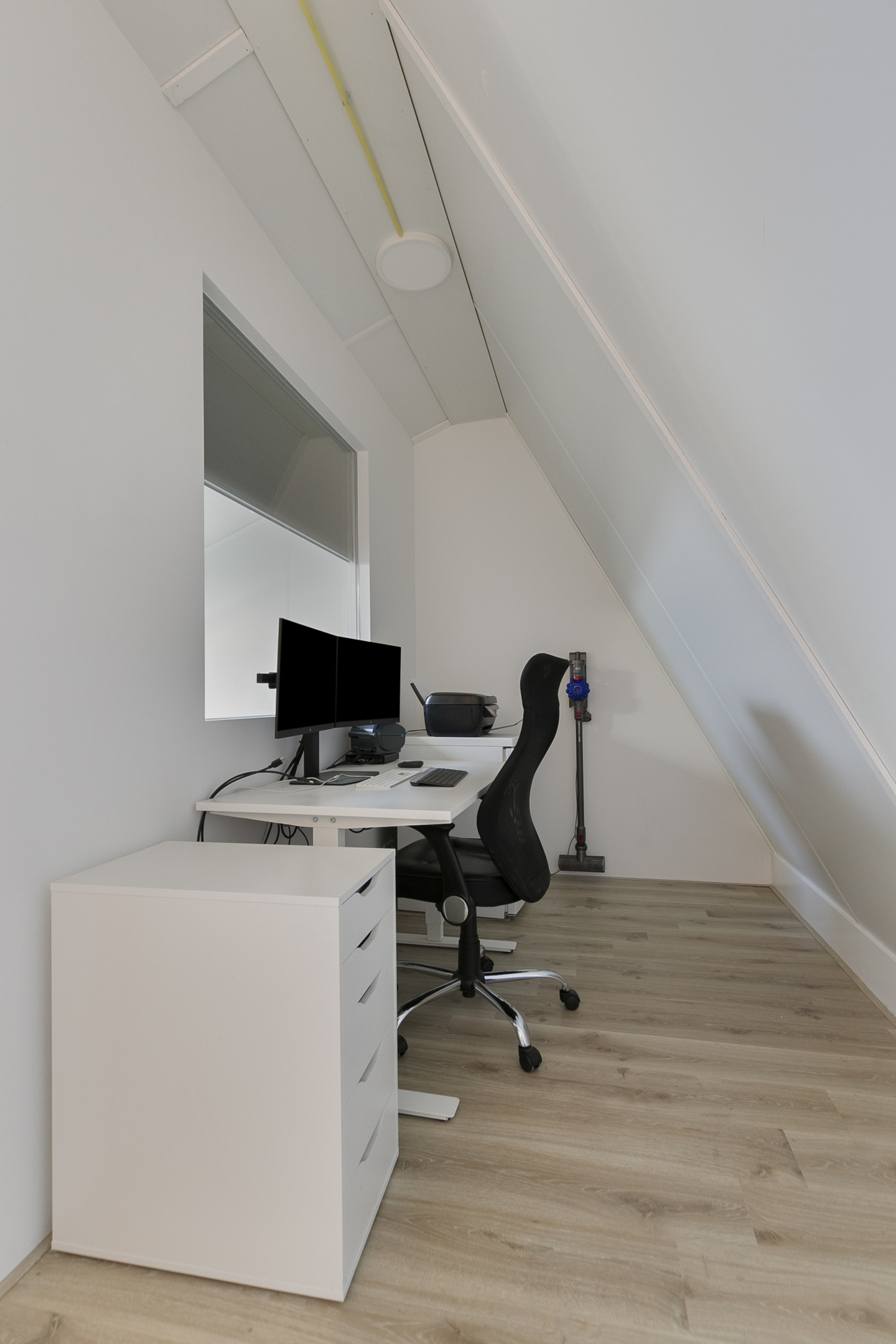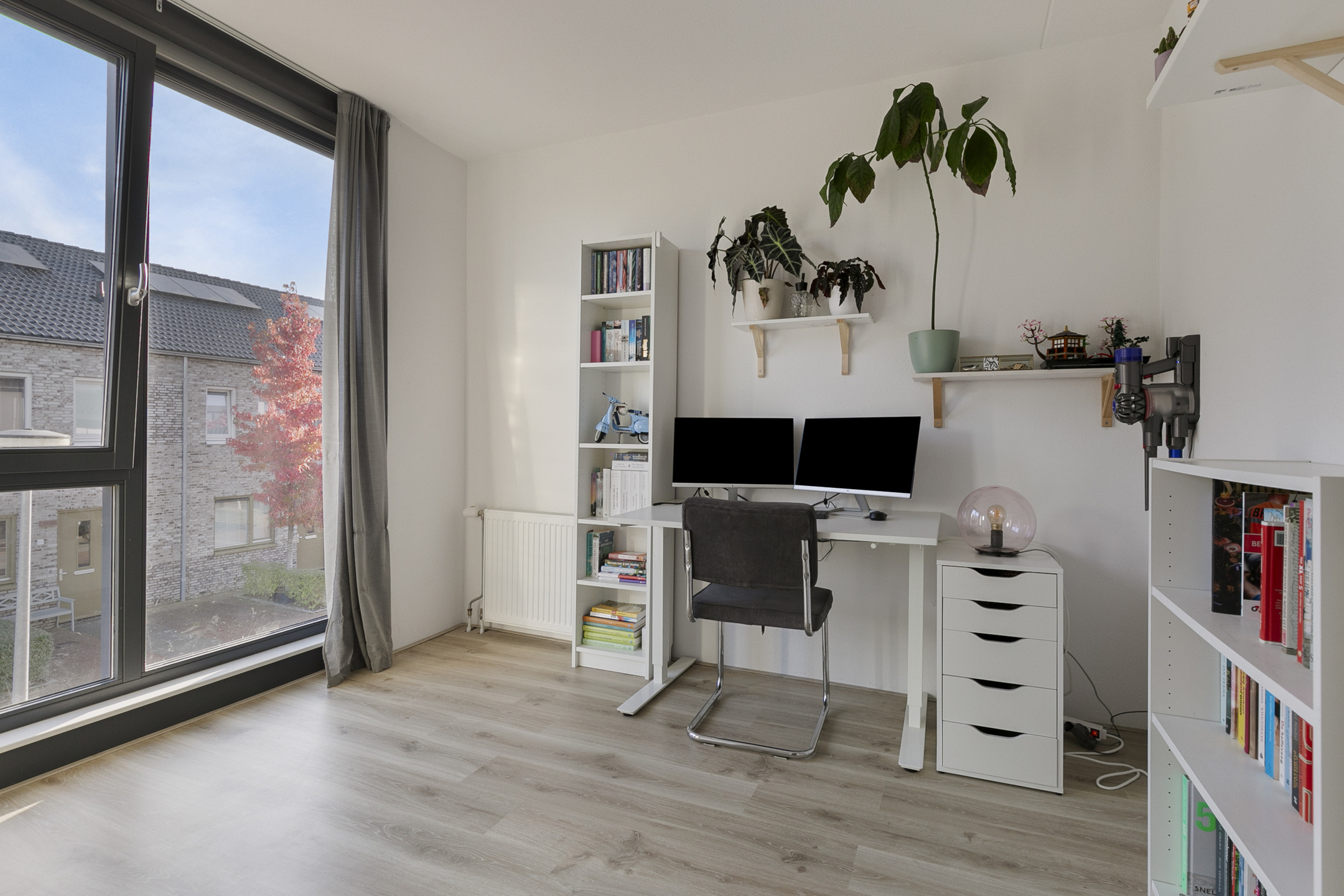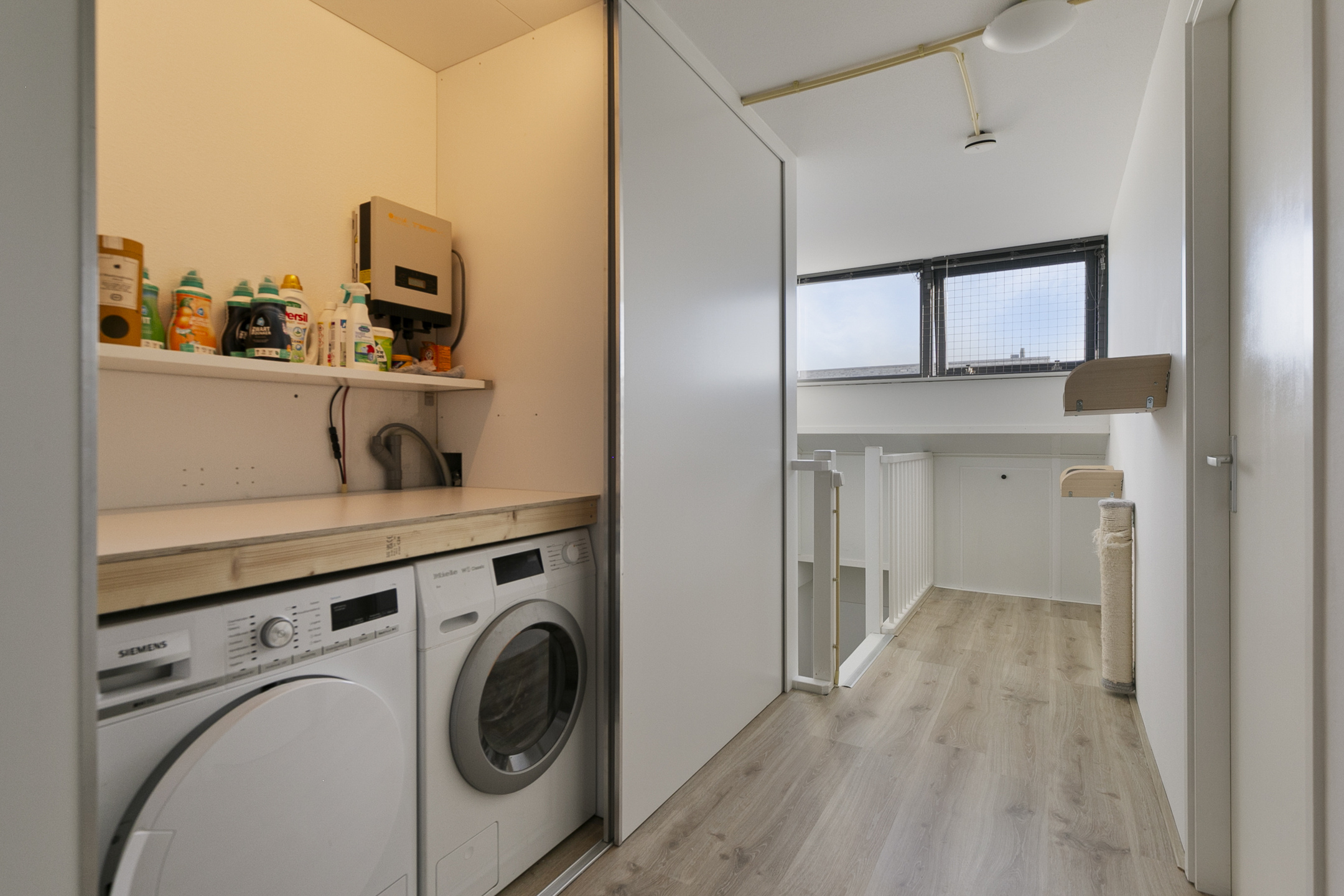 Tweede verdieping: op de overloop bevindt zich de witgoedopstelling. De witgoedopstelling is netjes weggewerkt in een handige kast, zodat je wasmachine en droger netjes uit het zicht zijn en de ruimte rustig oogt. Verder beschikt deze verdieping over een vierde slaapkamer en een multifunctionele ruimte om bijvoorbeeld te gebruiken als werkplek. Ook is er voldoende mogelijkheid om dingen op te bergen.