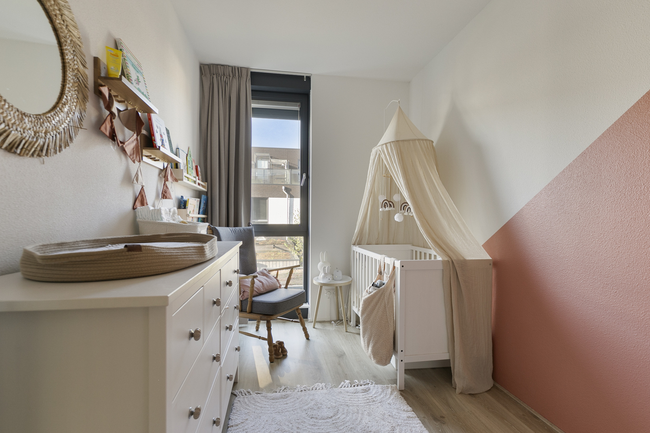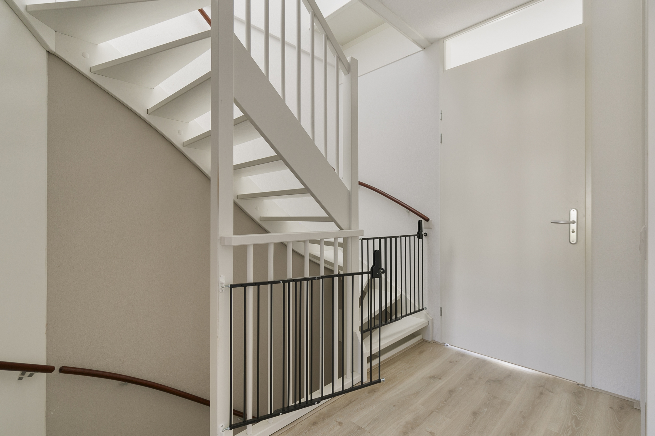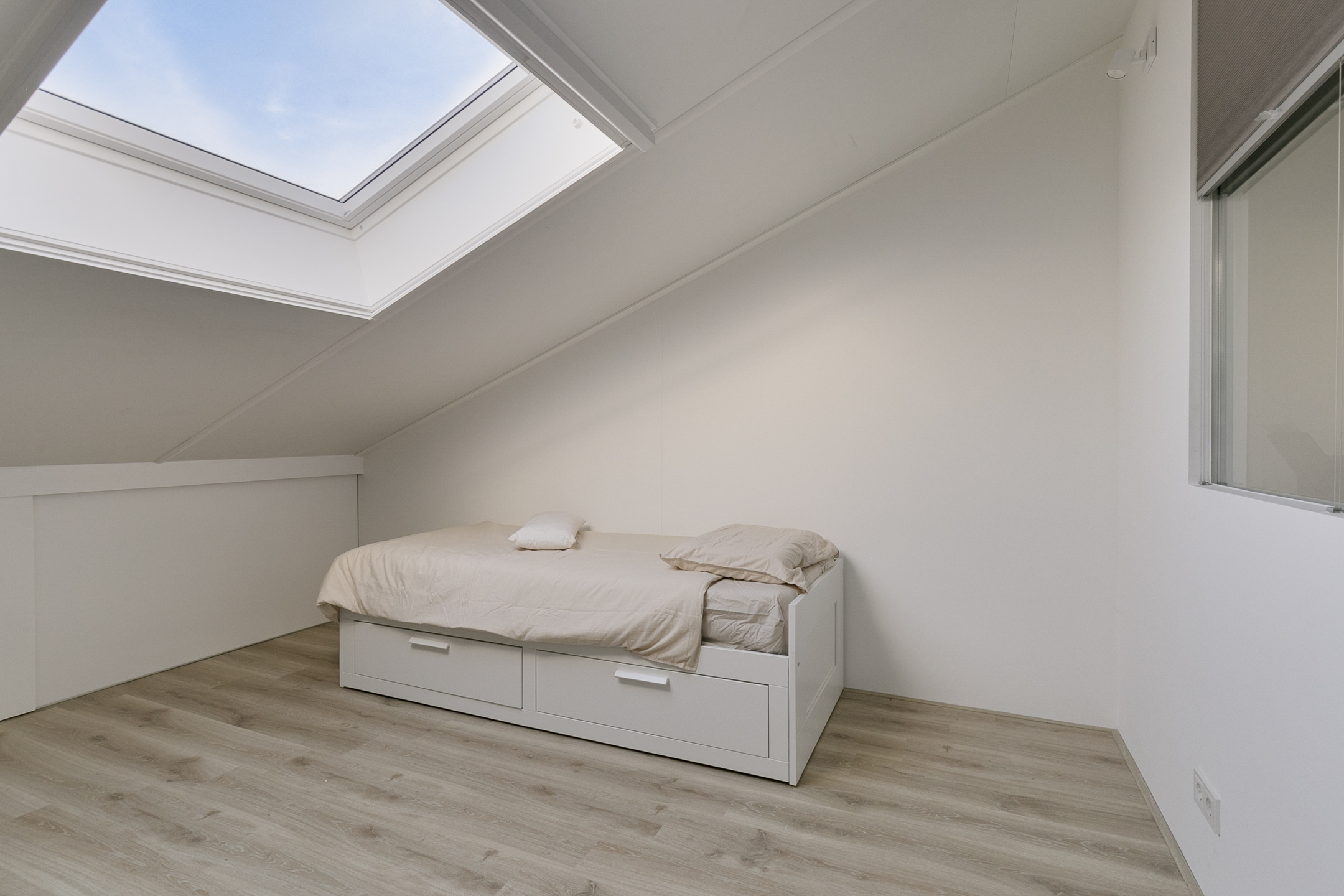 Tweede verdieping: op de overloop bevindt zich de witgoedopstelling. De witgoedopstelling is netjes weggewerkt in een handige kast, zodat je wasmachine en droger netjes uit het zicht zijn en de ruimte rustig oogt. Verder beschikt deze verdieping over een vierde slaapkamer en een multifunctionele ruimte om bijvoorbeeld te gebruiken als werkplek. Ook is er voldoende mogelijkheid om dingen op te bergen.