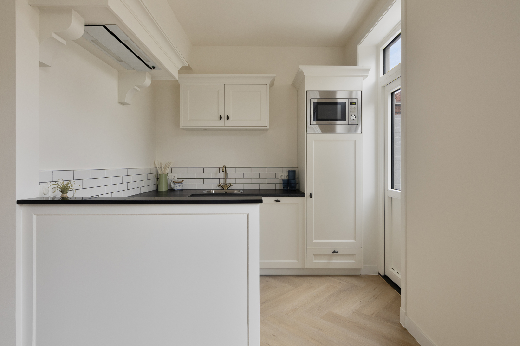 Eerste verdieping: stijlvolle entree/hal waarna de vaste trap leidt naar de eerste verdieping welke volledig is voorzien van een visgraat pvc vloer met vloerverwarming. Hier vind je een modern toilet voorzien van een fonteintje. De woonkamer is voorzien van veel lichtinval en mooie en-suite deuren. De ruime eetkamer heeft een open verbinding met de keuken en is een perfecte plek om te koken en tegelijkertijd in contact te blijven met elkaar. De keuken is voorzien van verschillende inbouwapparatuur. De karakteristieke schouw in de eetkamer voegt een vleugje charme en authenticiteit toe aan de ruimte. Vanuit de keuken is er directe toegang tot het balkon, waar je heerlijk kunt genieten van een kopje koffie in de ochtendzon.