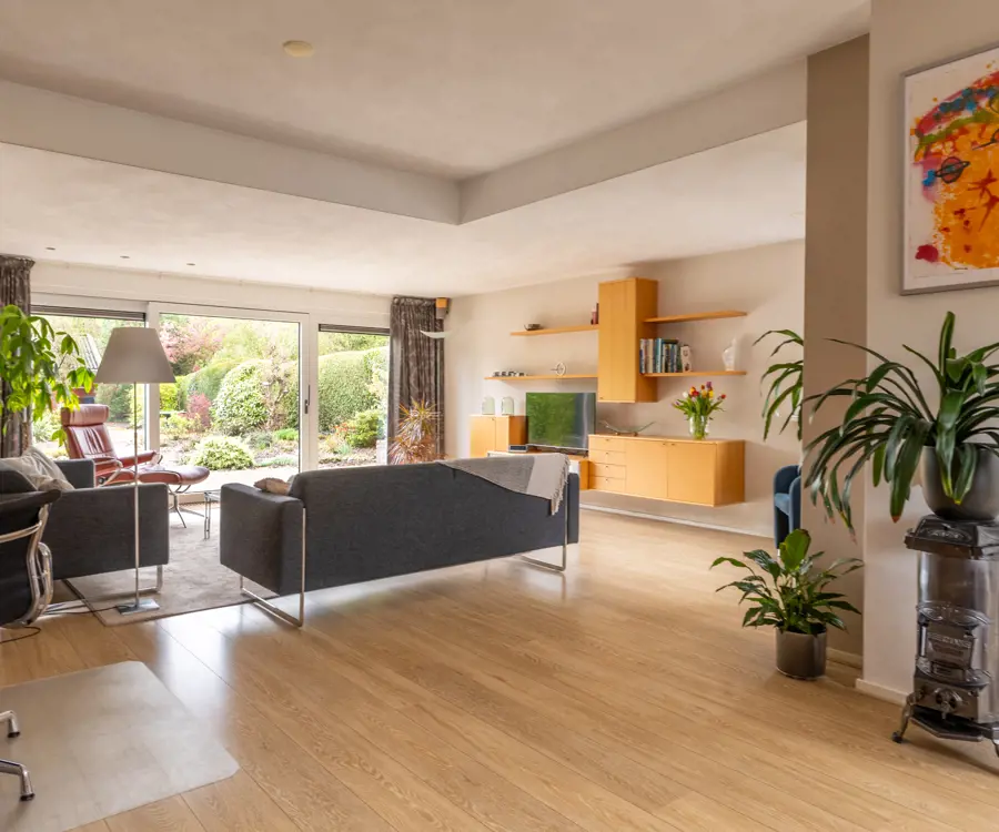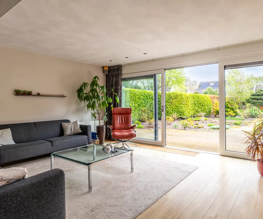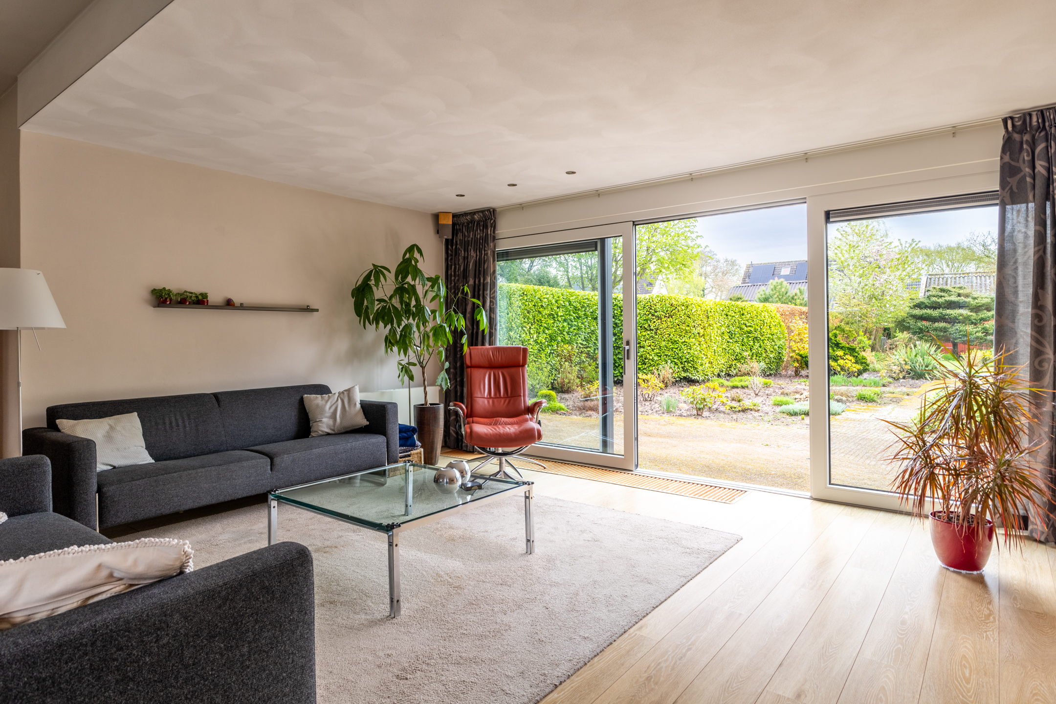 - Royale woonkamer met dubbele schuifpui naar de tuin;