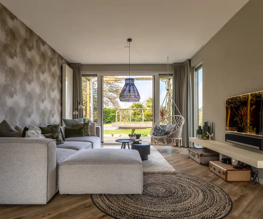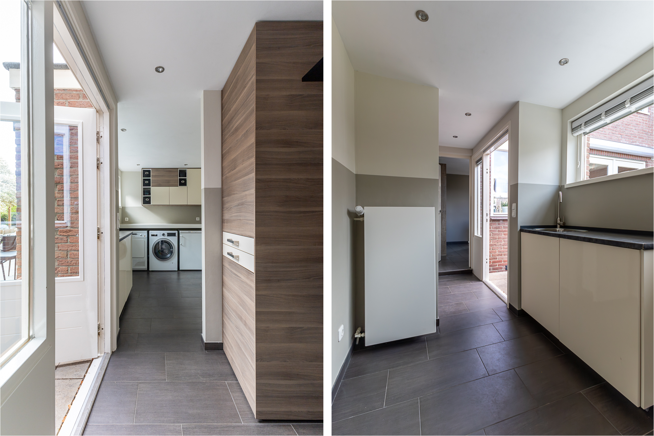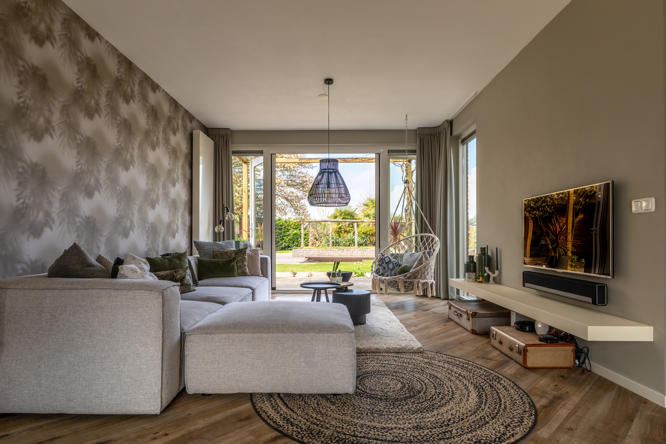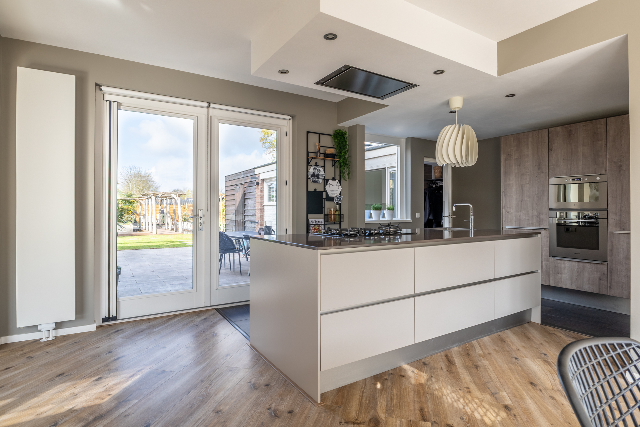 De royale woonkamer, heerlijk licht dankzij de dubbele openslaande deuren naar het terras. De woonruimte kijkt uit op de onder architectuur aangelegde tuin – een oase van rust met meerdere terrassen en volop privacy. Vanuit de keuken is er toegang tot de handige bijkeuken voorzien van de wasmachine opstelling, spoelbak en handige kastruimte.