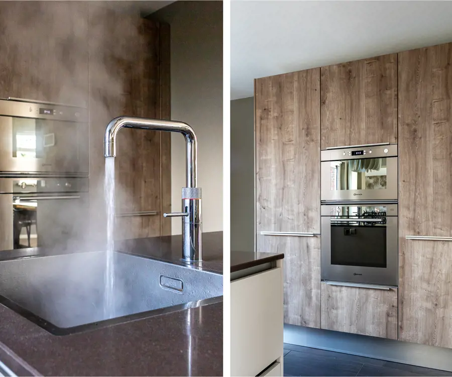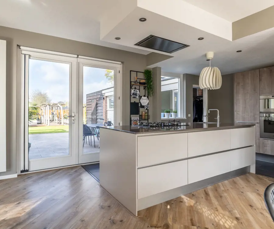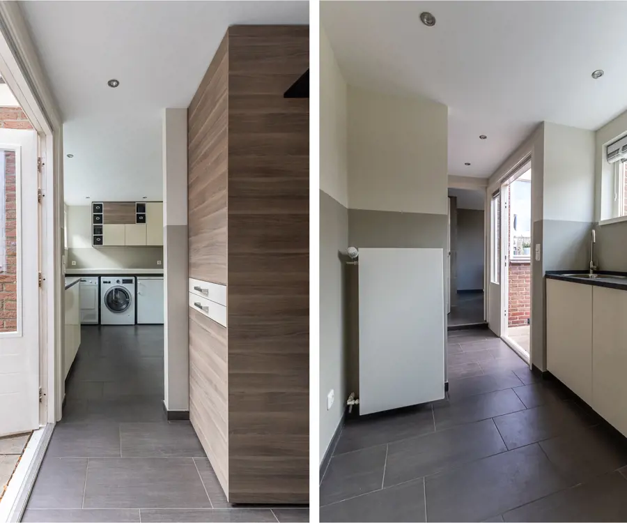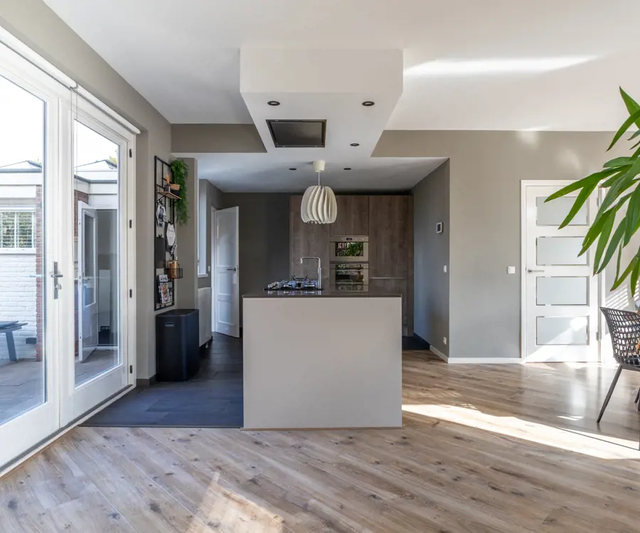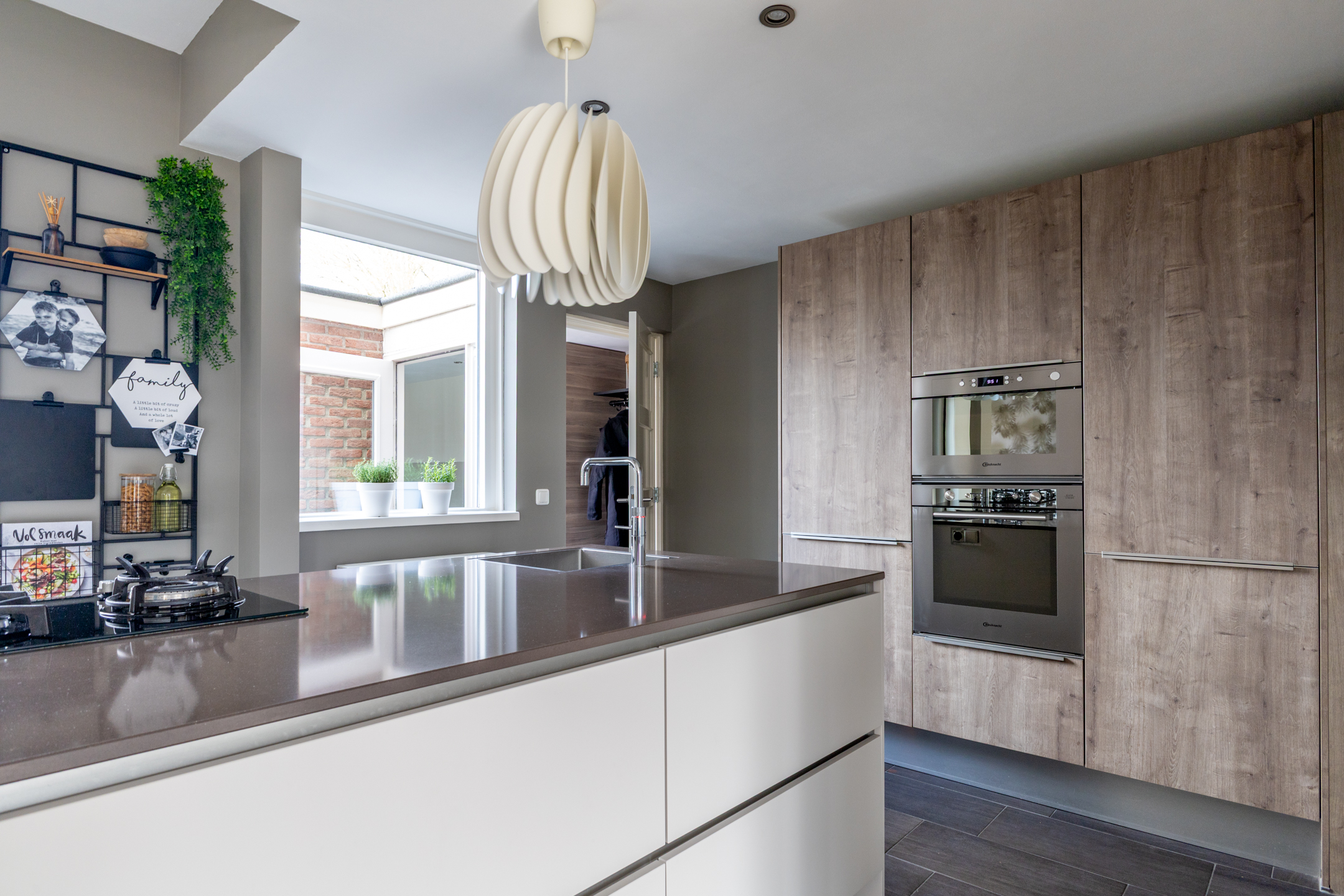 De royale woonkamer, heerlijk licht dankzij de dubbele openslaande deuren naar het terras. De woonruimte kijkt uit op de onder architectuur aangelegde tuin – een oase van rust met meerdere terrassen en volop privacy. Vanuit de keuken is er toegang tot de handige bijkeuken voorzien van de wasmachine opstelling, spoelbak en handige kastruimte.