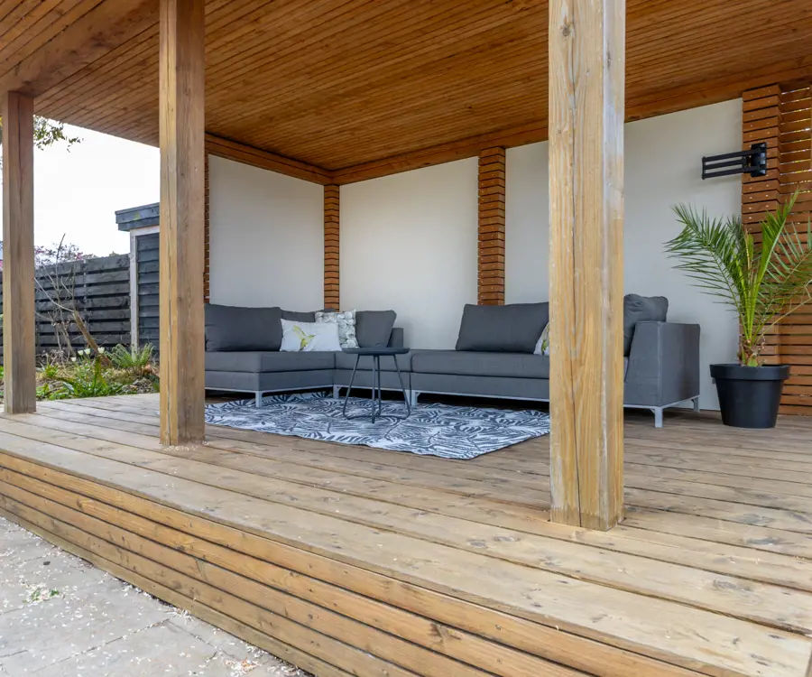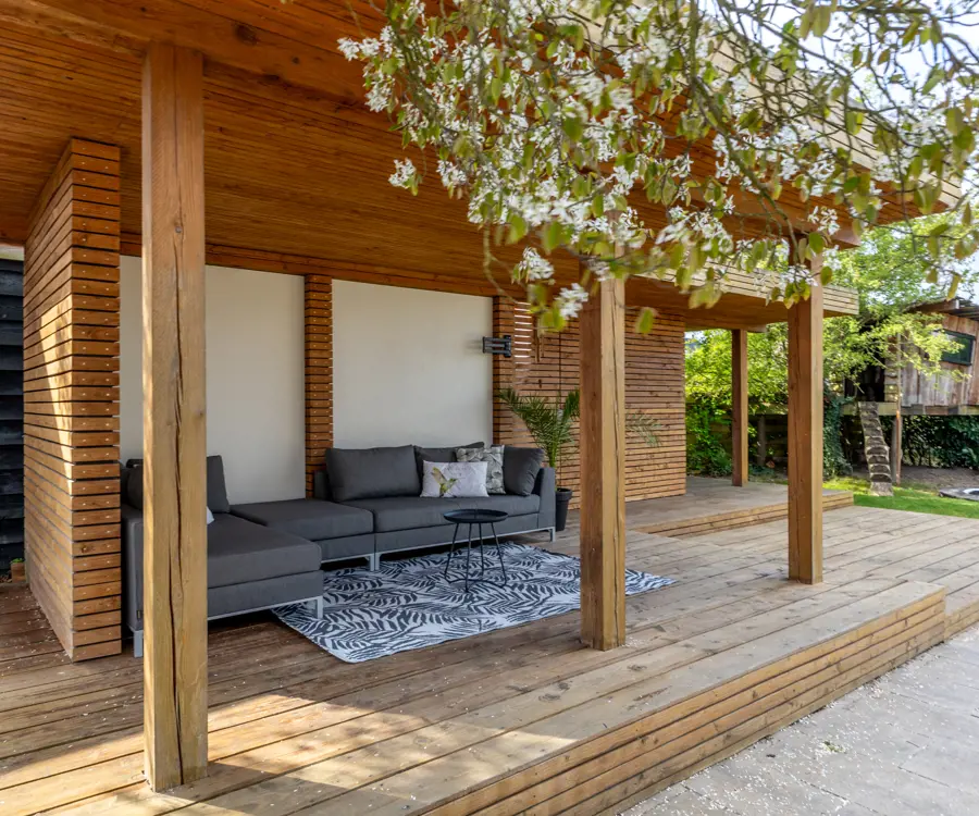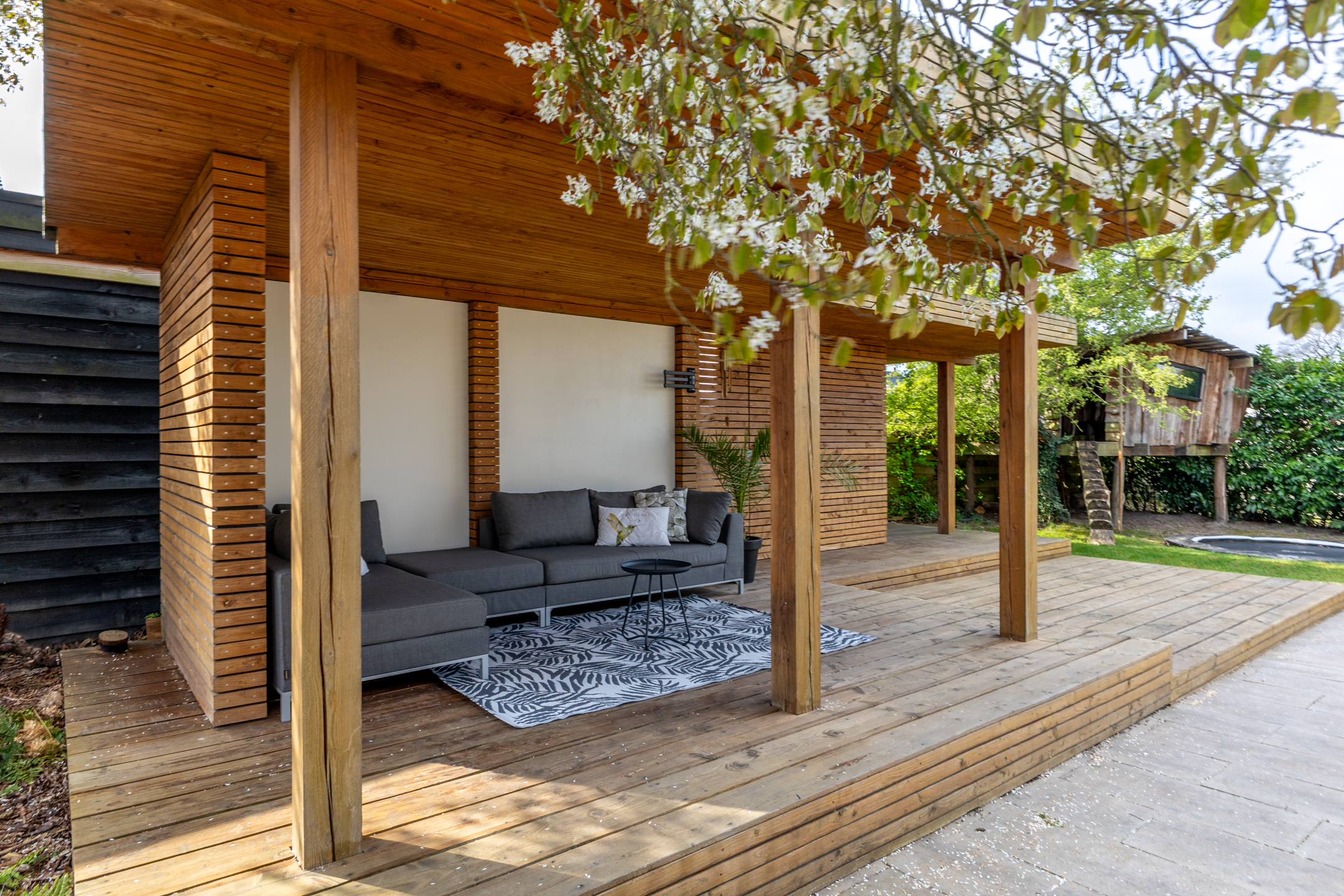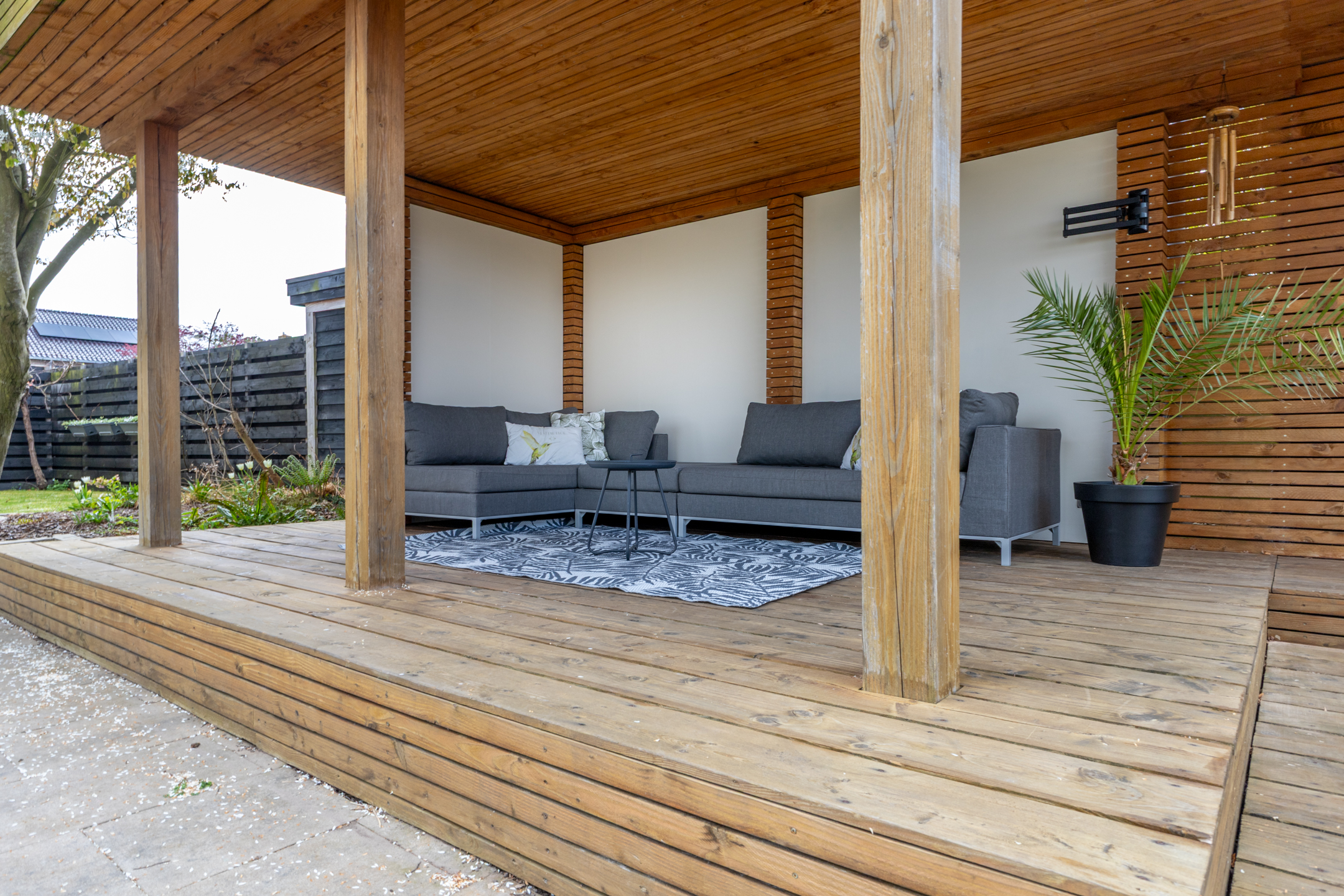 En dan de overkapping– wat een plaatje! Deze robuuste, sfeervolle buitenruimte is ideaal om het hele jaar door van te genieten. ’s Zomers heerlijk borrelen in de schaduw, en op koelere dagen lekker warm onder een dekentje met een goed boek of een buitenhaard. In de tuin is daarnaast ook nog voldoende bergruimte aanwezig, een aangebouwde berging en een berging bij de overkapping.