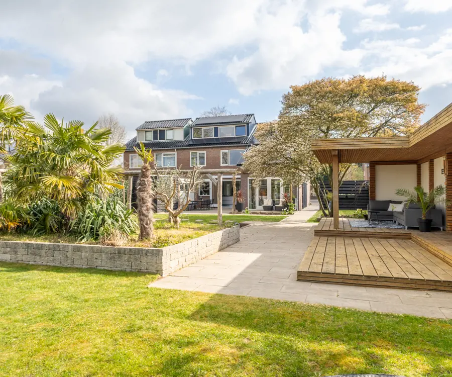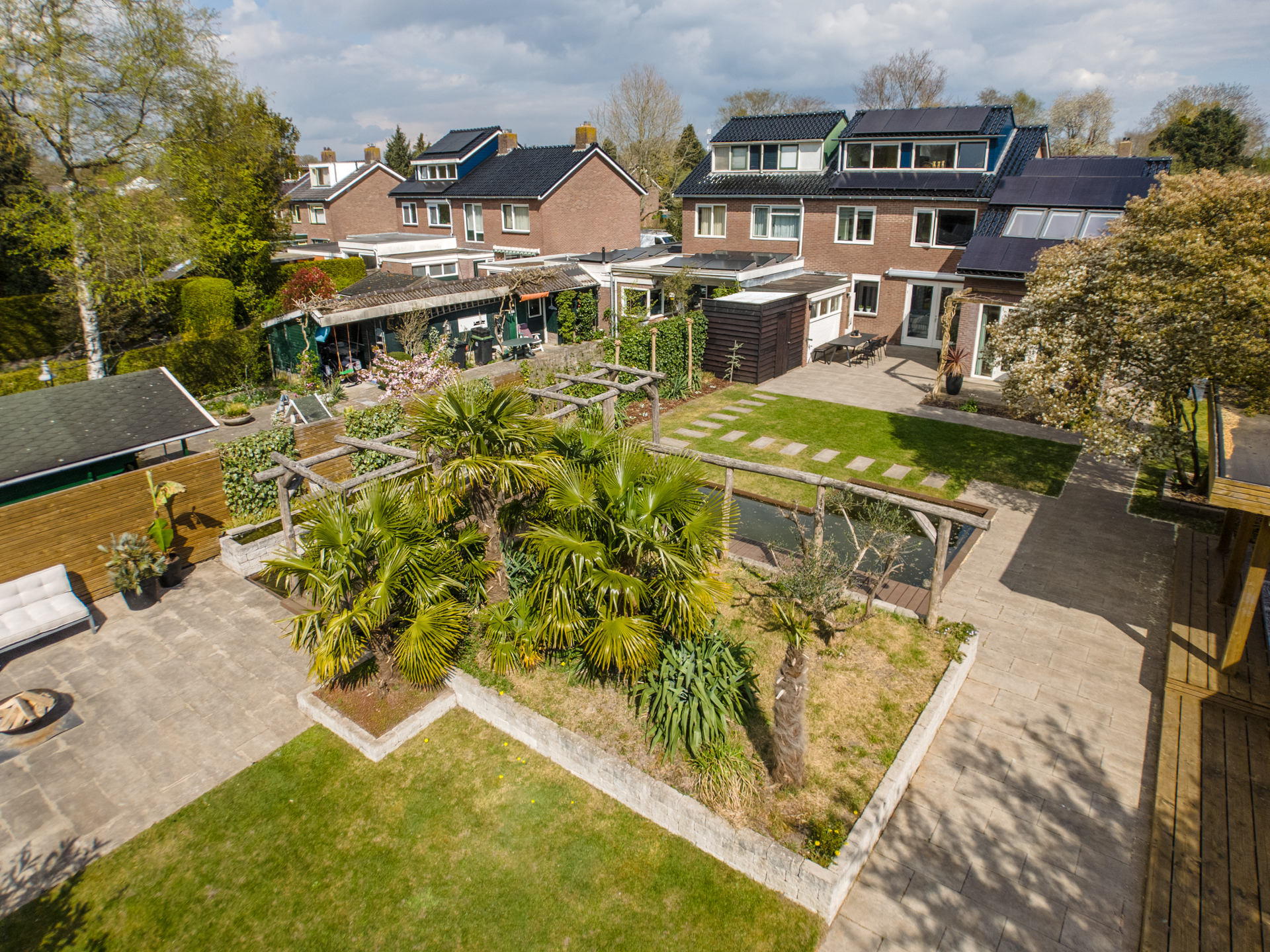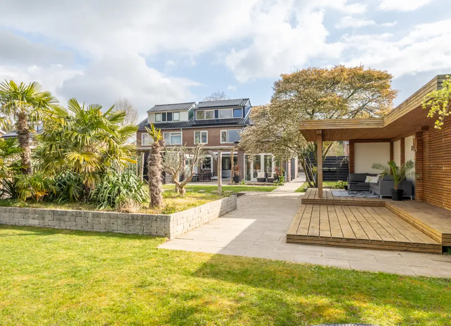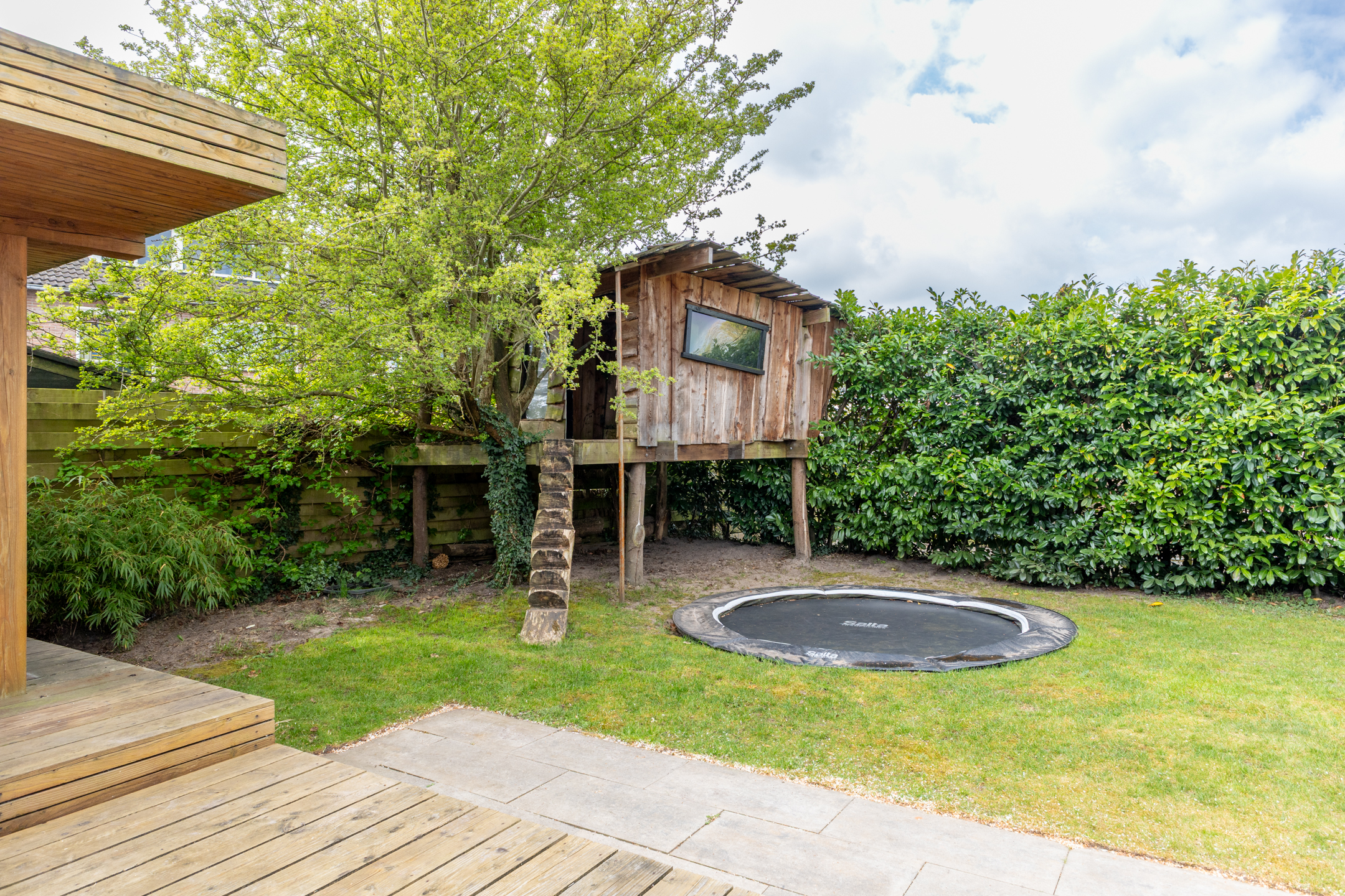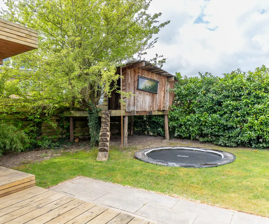 Een van de absolute hoogtepunten van deze woning is de onder architectuur aangelegde tuin. Met een totale oppervlakte van maar liefst 801 m² biedt het perceel ongekende mogelijkheden voor tuinliefhebbers, gezinnen of buitenmensen. De tuin is stijlvol ingedeeld met meerdere terrassen, een groot gazon, speelse beplanting, sierbestrating en zelfs een eigen boomhut!