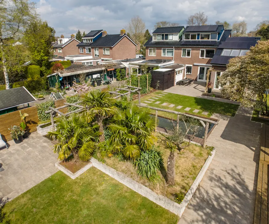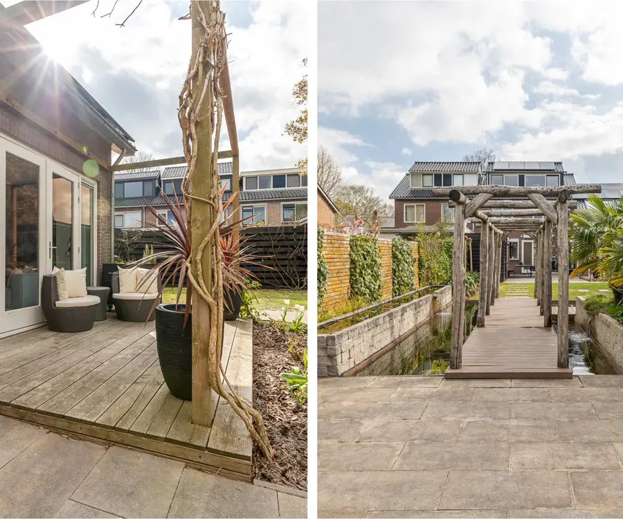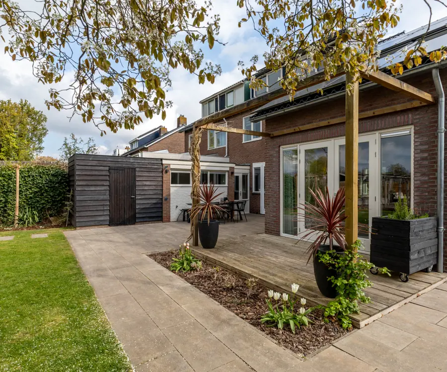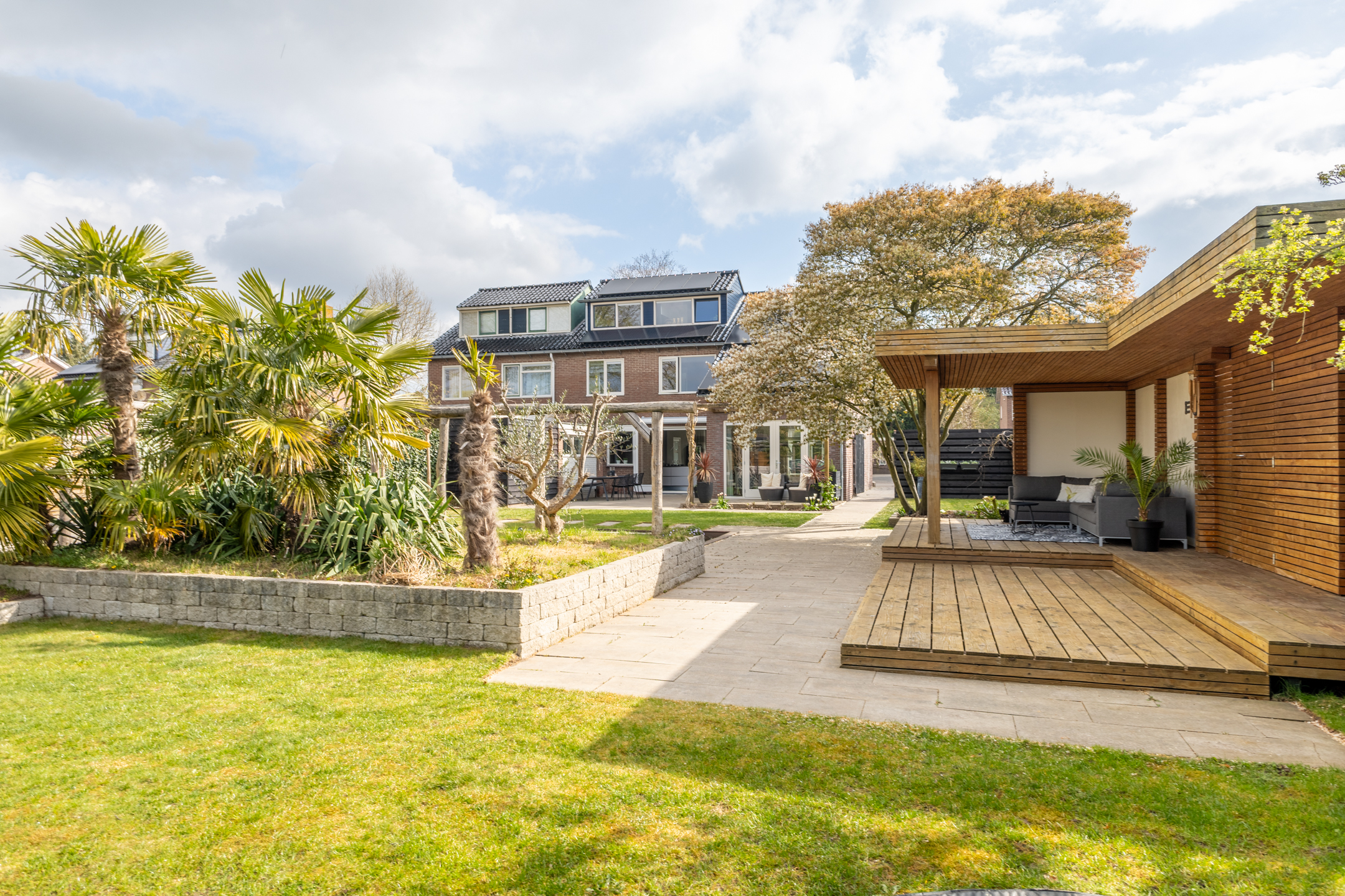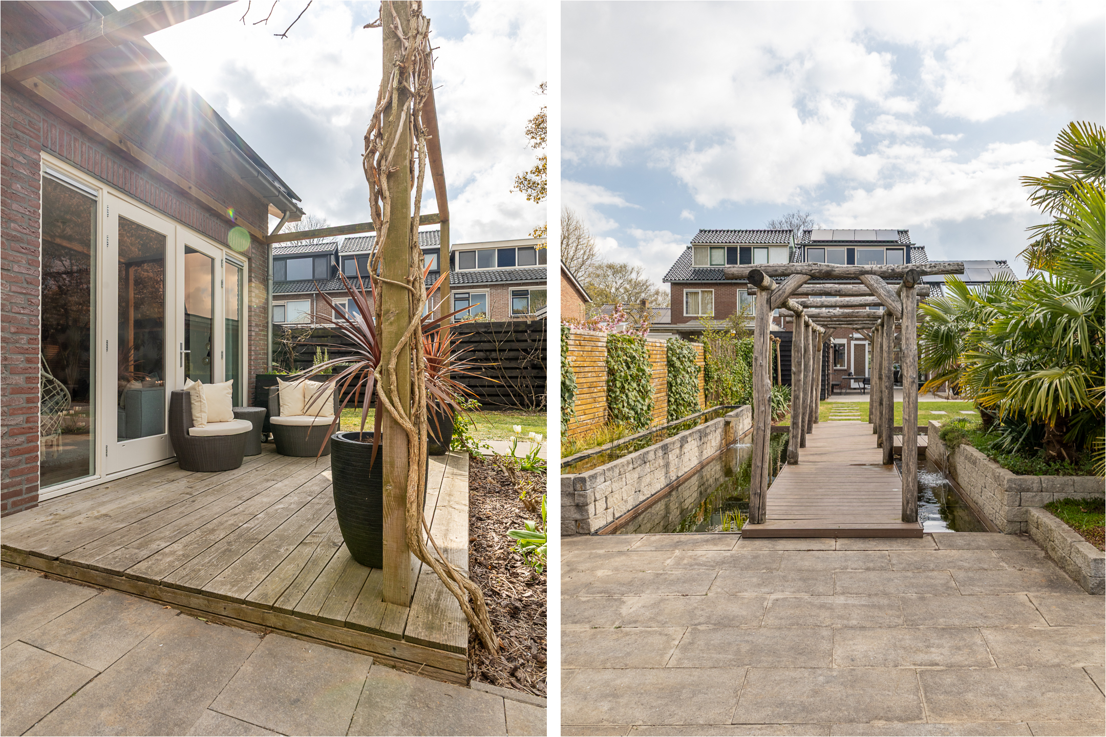 Een van de absolute hoogtepunten van deze woning is de onder architectuur aangelegde tuin. Met een totale oppervlakte van maar liefst 801 m² biedt het perceel ongekende mogelijkheden voor tuinliefhebbers, gezinnen of buitenmensen. De tuin is stijlvol ingedeeld met meerdere terrassen, een groot gazon, speelse beplanting, sierbestrating en zelfs een eigen boomhut!