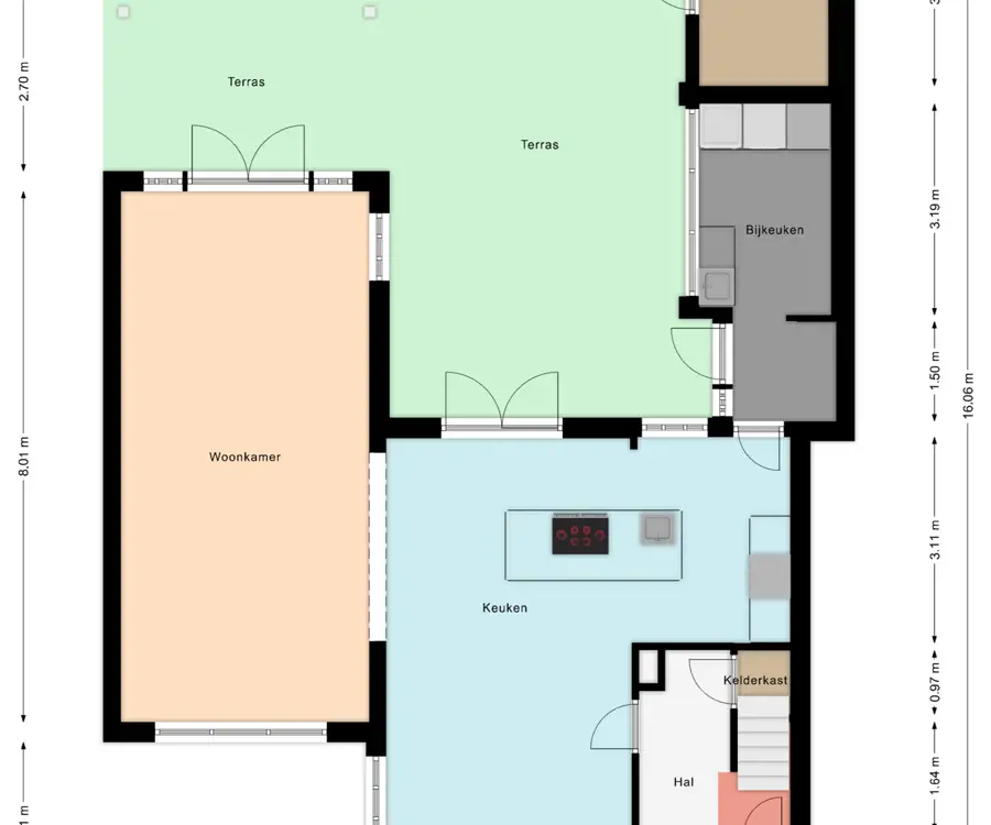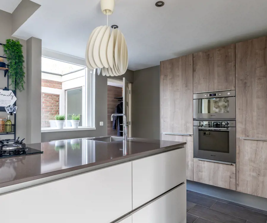 Begane grond: binnenkomst via de ruime hal met toegang tot het moderne toilet, trapopgang, meterkast en handige kelderkast. Het eetgedeelte ligt aan de voorzijde en sluit perfect aan op de royale, open keuken in het midden van de woning. Deze keuken is modern, strak en voorzien van hoogwaardige inbouwapparatuur, een kookeiland en veel werk- en kastruimte – ideaal voor kookliefhebbers.