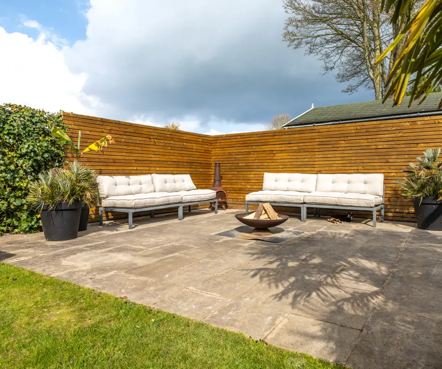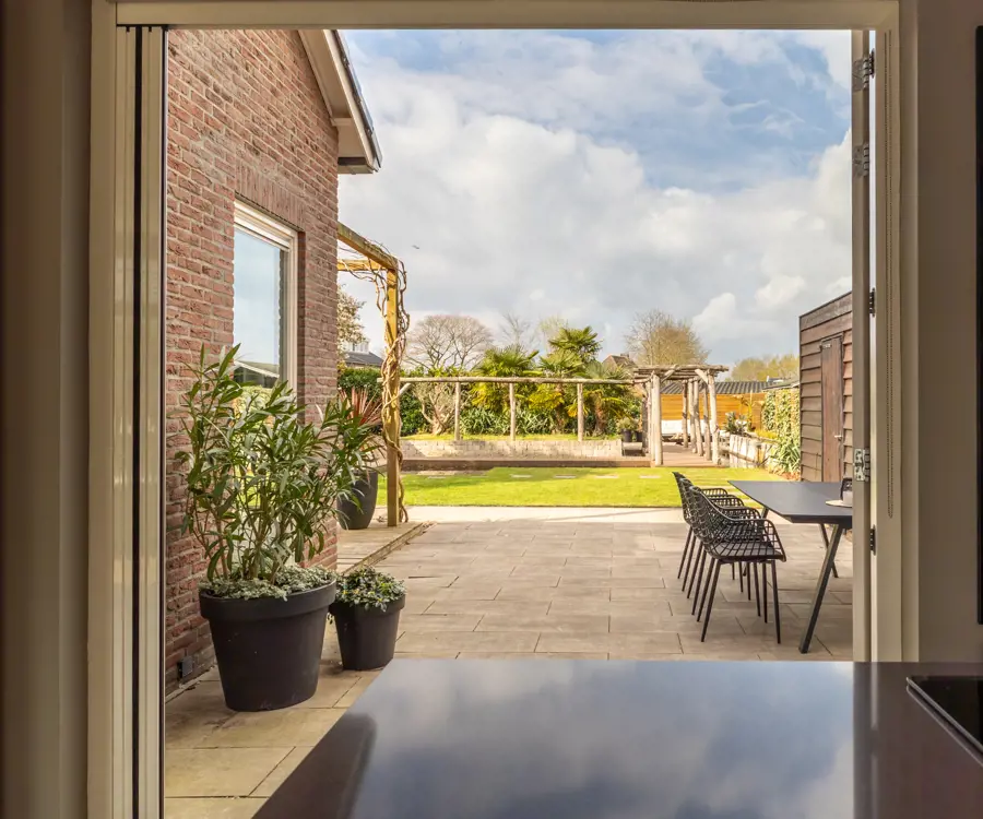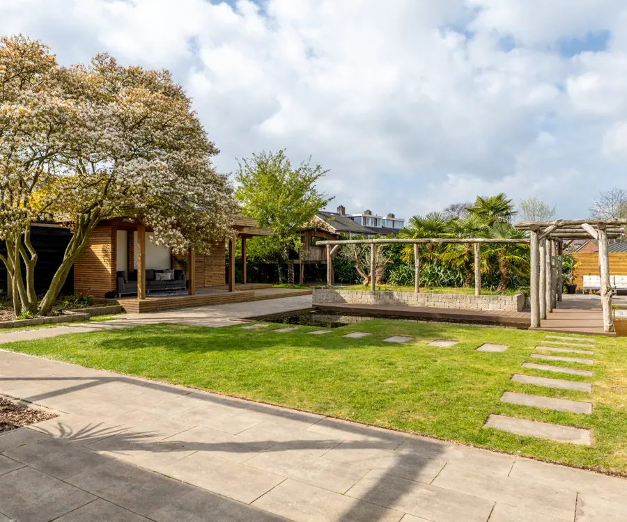 - Riante onder architectuur aangelegde tuin met zon- en schaduwplekken;
