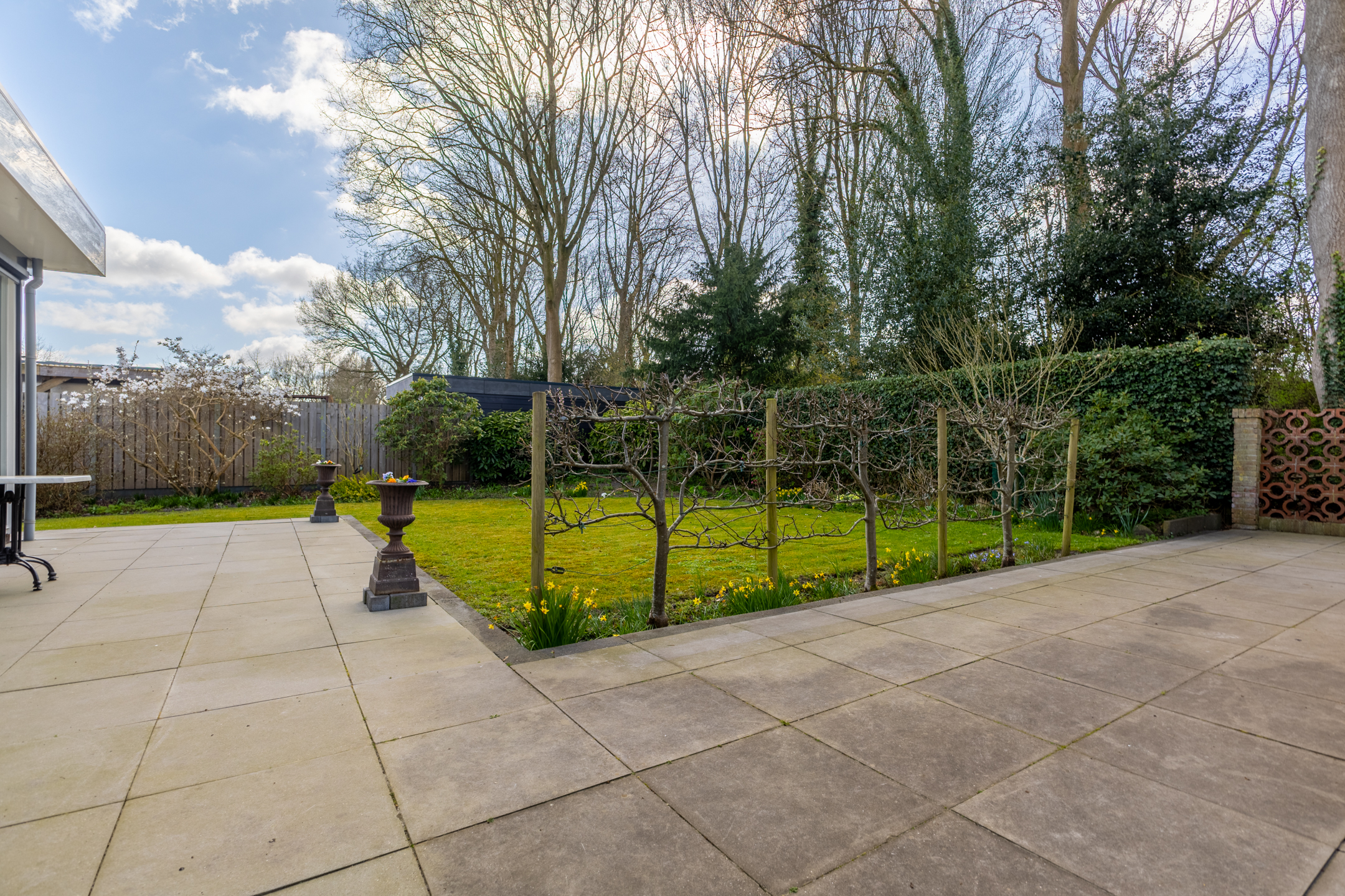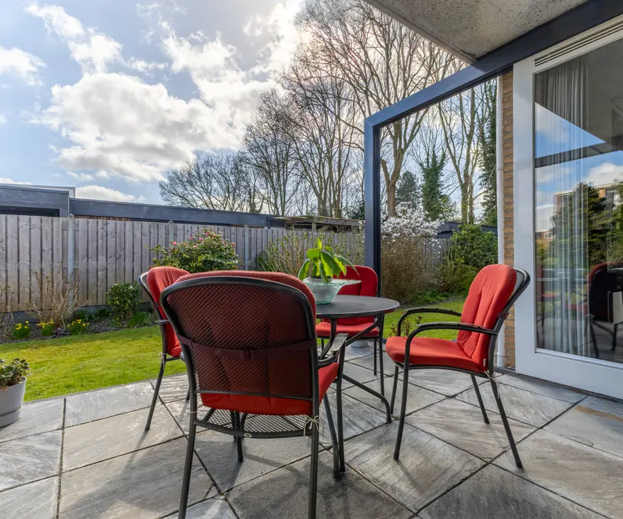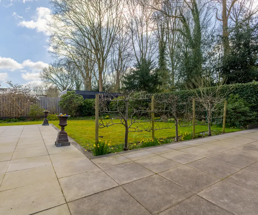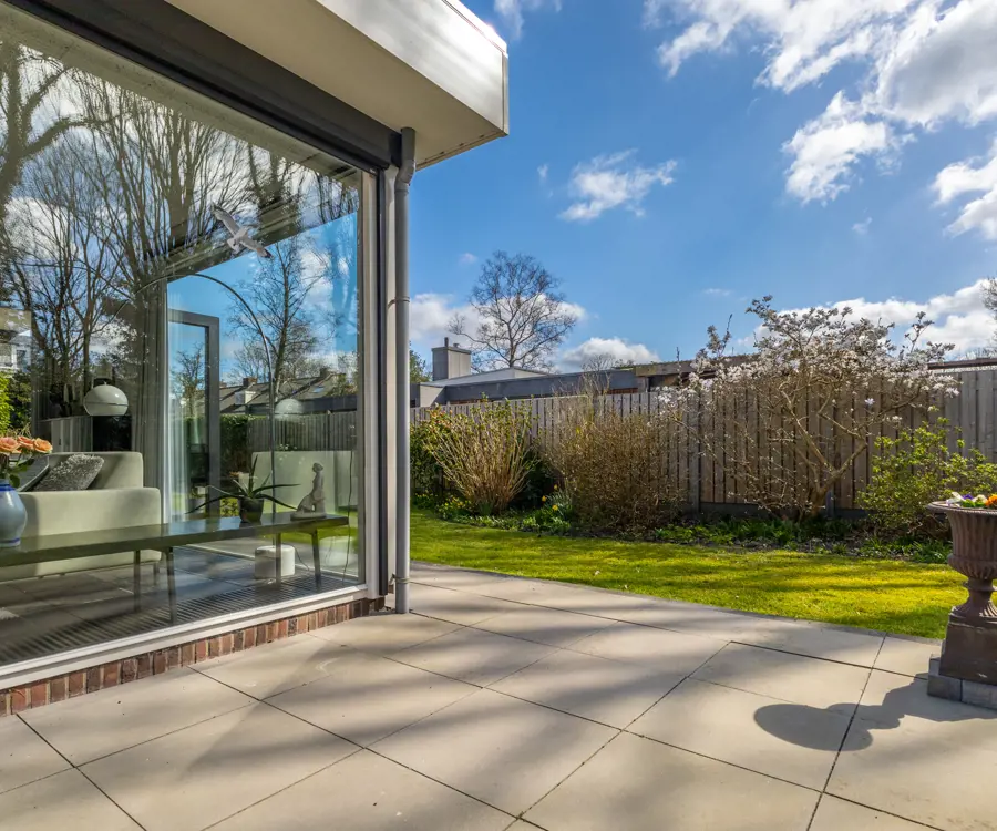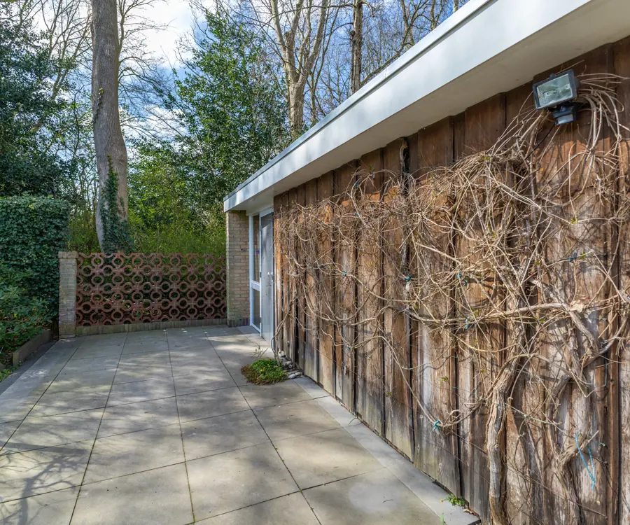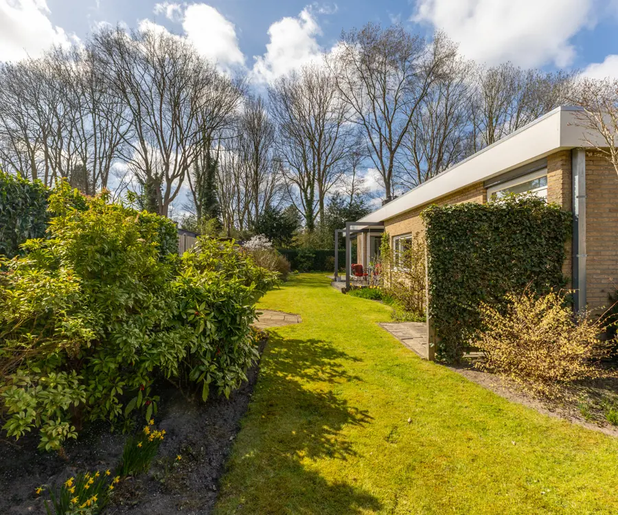 Rondom de woning ligt een prachtig aangelegde tuin die perfect past bij de stijl en architectuur van het huis. Aan de achterzijde bevindt zich een royaal terras dat direct grenst aan de woonkamer – dé plek om op zonnige dagen heerlijk buiten te zitten, omringd door groen en rust. De ligging van het perceel zorgt voor veel privacy en een prettige bezonning gedurende de dag. Of je nu wilt genieten van een kop koffie in de ochtendzon, een goed boek in de schaduw of een diner met vrienden in de avondzon: deze tuin biedt het allemaal. Op het perceel bevindt zich een vrijstaande, royale garage (ca. 5.14 x 6.76 m), met overheaddeur en aparte loopdeur. Ruimte voor een auto, fietsen, opslag en eventueel een werkbank.