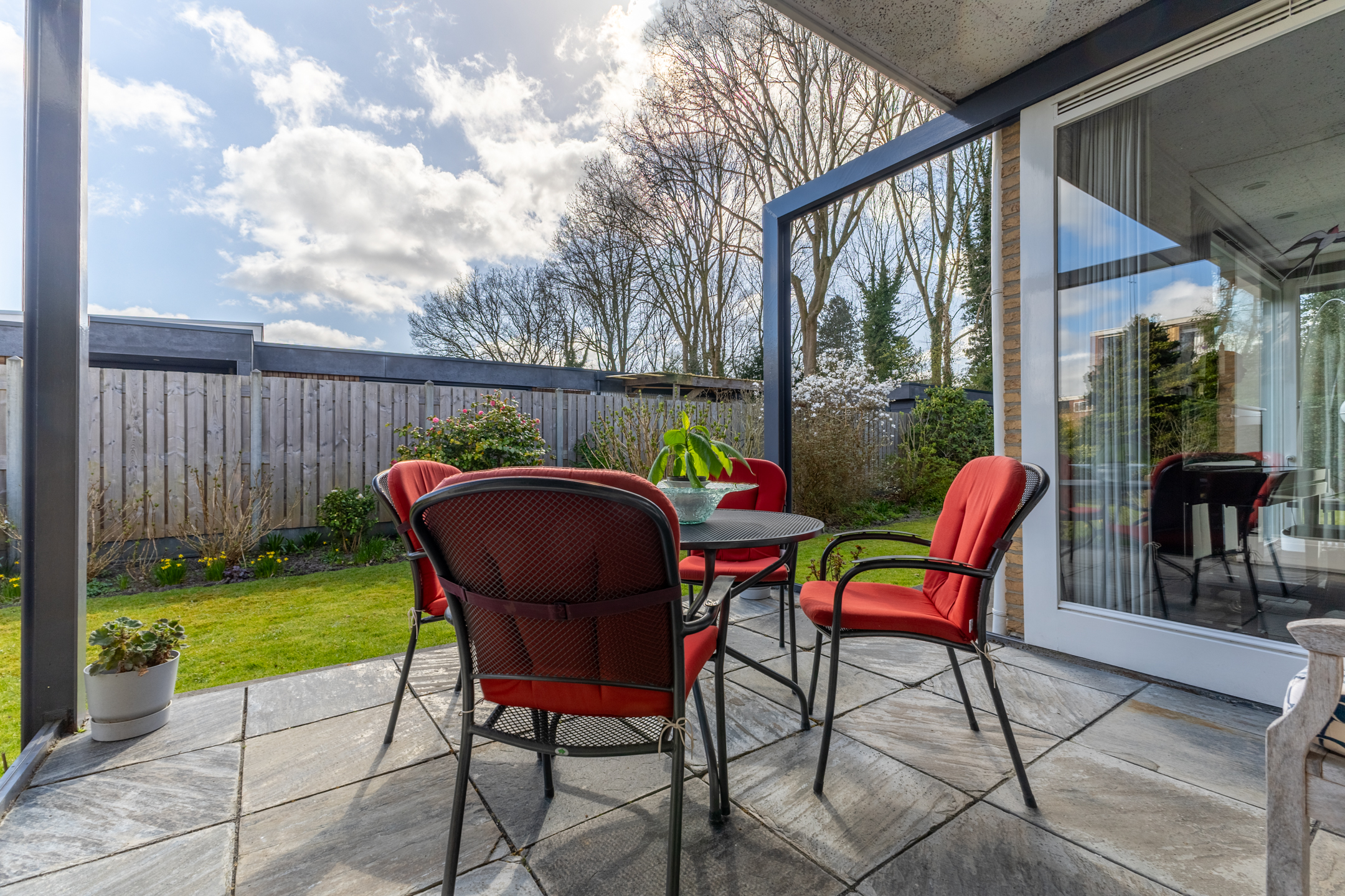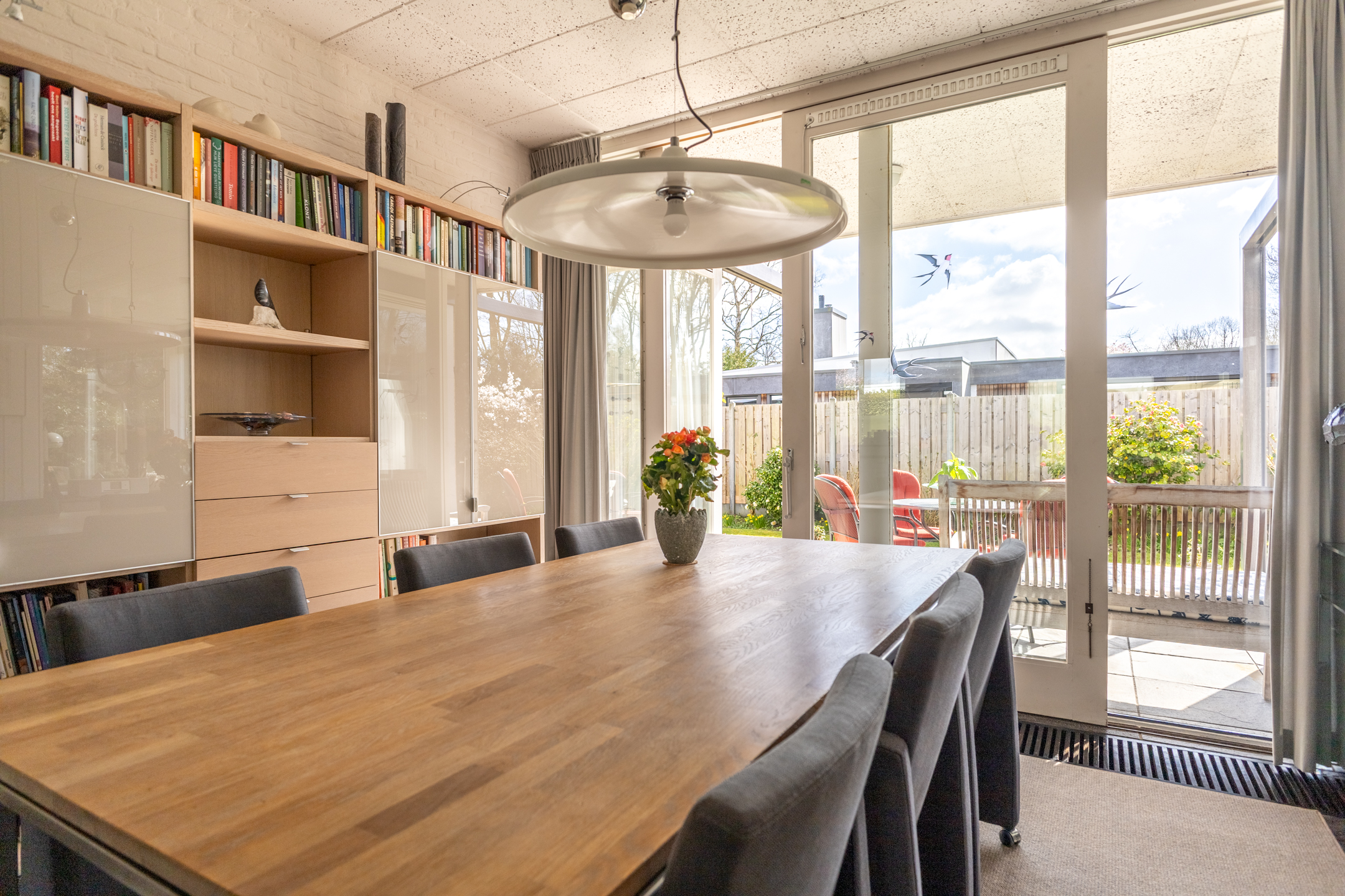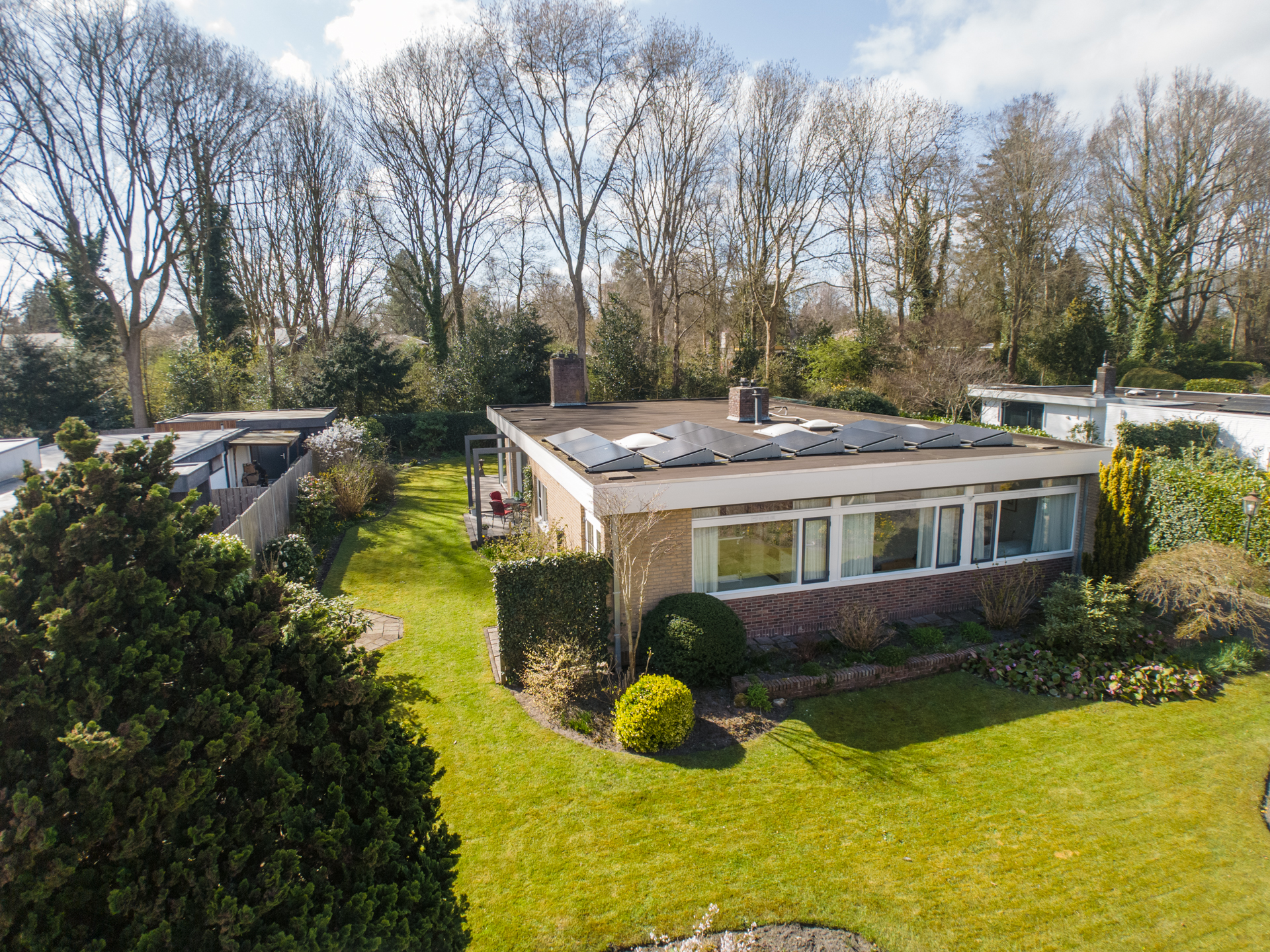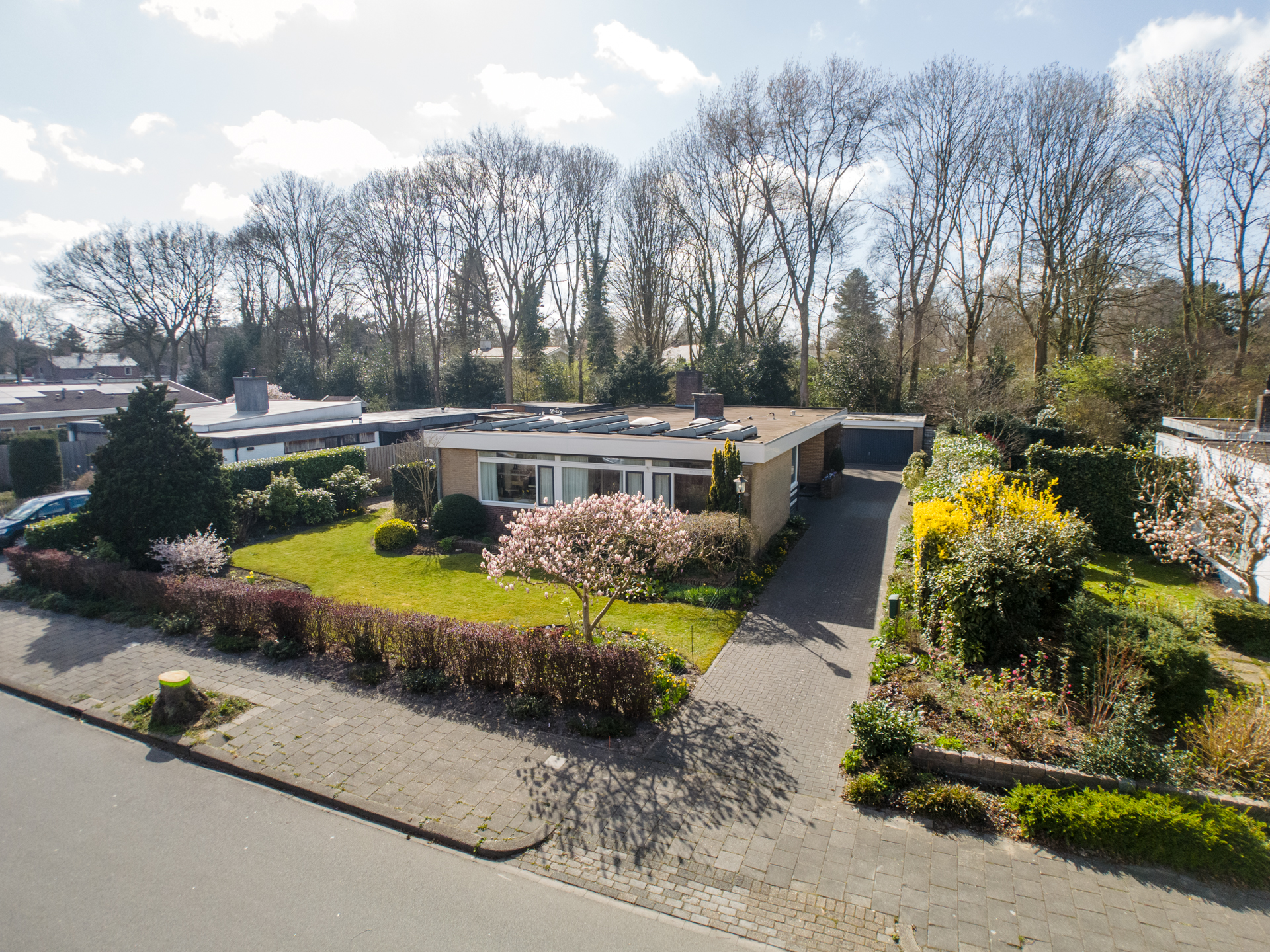 Rondom de woning ligt een prachtig aangelegde tuin die perfect past bij de stijl en architectuur van het huis. Aan de achterzijde bevindt zich een royaal terras dat direct grenst aan de woonkamer – dé plek om op zonnige dagen heerlijk buiten te zitten, omringd door groen en rust. De ligging van het perceel zorgt voor veel privacy en een prettige bezonning gedurende de dag. Of je nu wilt genieten van een kop koffie in de ochtendzon, een goed boek in de schaduw of een diner met vrienden in de avondzon: deze tuin biedt het allemaal. Op het perceel bevindt zich een vrijstaande, royale garage (ca. 5.14 x 6.76 m), met overheaddeur en aparte loopdeur. Ruimte voor een auto, fietsen, opslag en eventueel een werkbank.