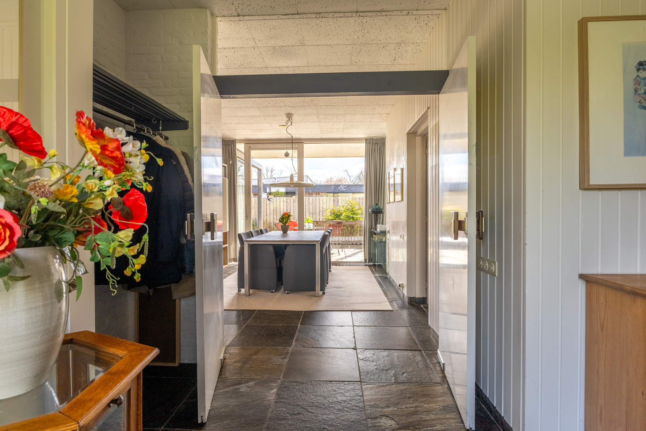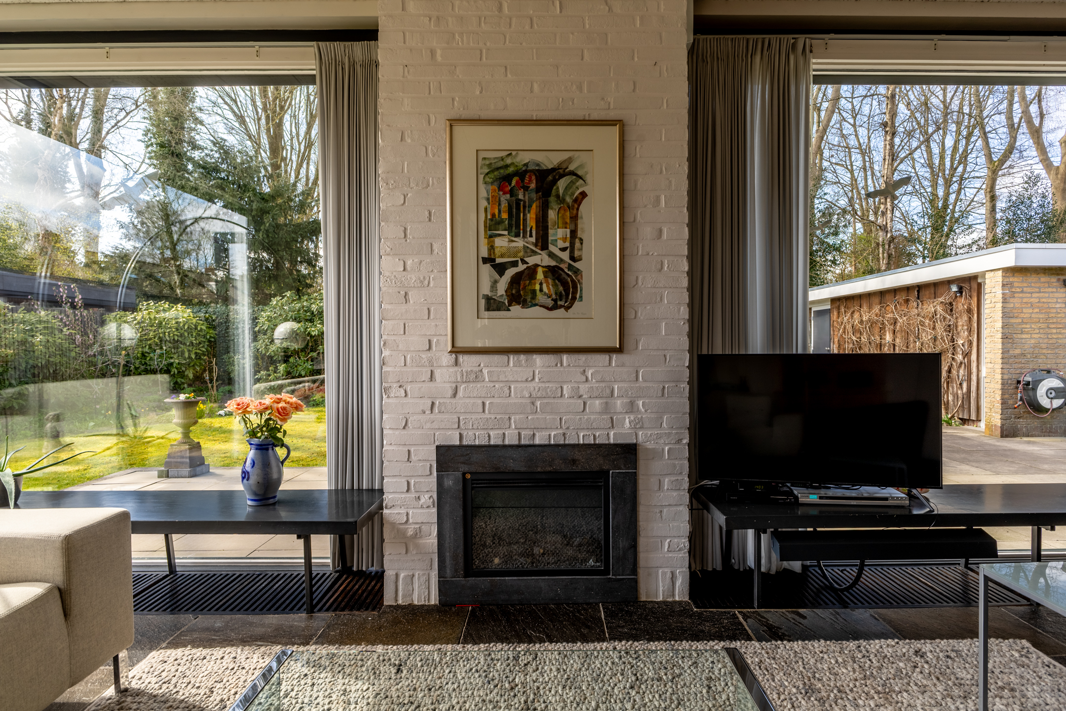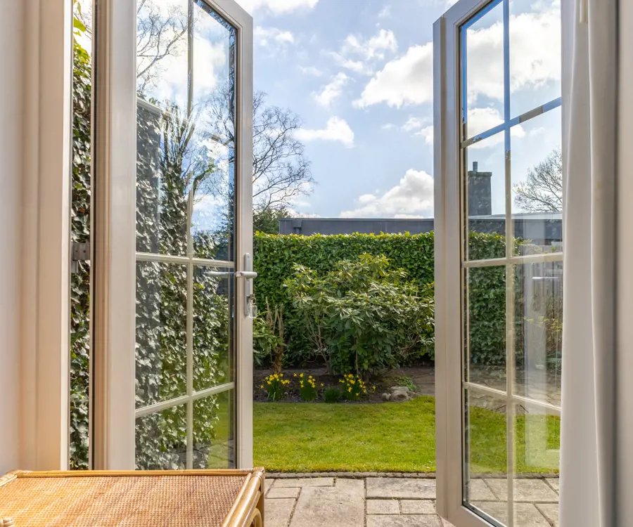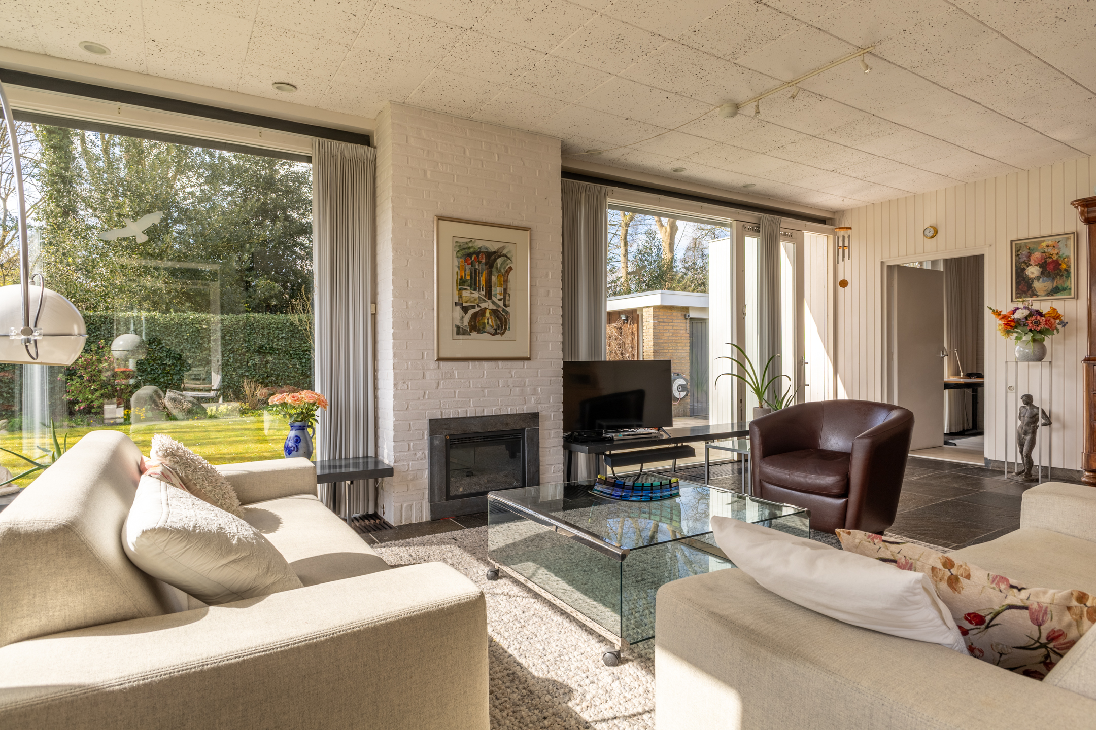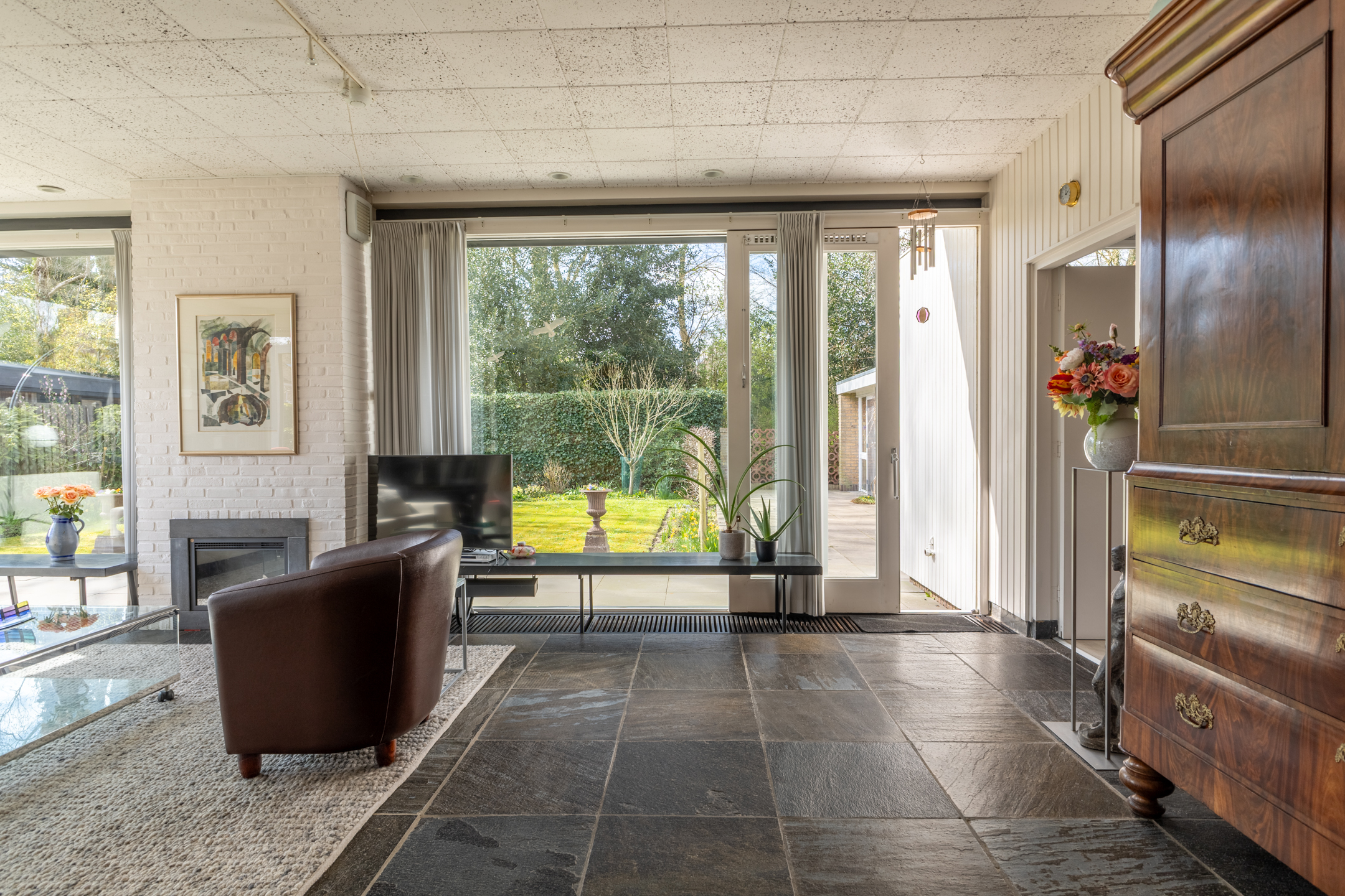 Rondom de woning ligt een prachtig aangelegde tuin die perfect past bij de stijl en architectuur van het huis. Aan de achterzijde bevindt zich een royaal terras dat direct grenst aan de woonkamer – dé plek om op zonnige dagen heerlijk buiten te zitten, omringd door groen en rust. De ligging van het perceel zorgt voor veel privacy en een prettige bezonning gedurende de dag. Of je nu wilt genieten van een kop koffie in de ochtendzon, een goed boek in de schaduw of een diner met vrienden in de avondzon: deze tuin biedt het allemaal. Op het perceel bevindt zich een vrijstaande, royale garage (ca. 5.14 x 6.76 m), met overheaddeur en aparte loopdeur. Ruimte voor een auto, fietsen, opslag en eventueel een werkbank.