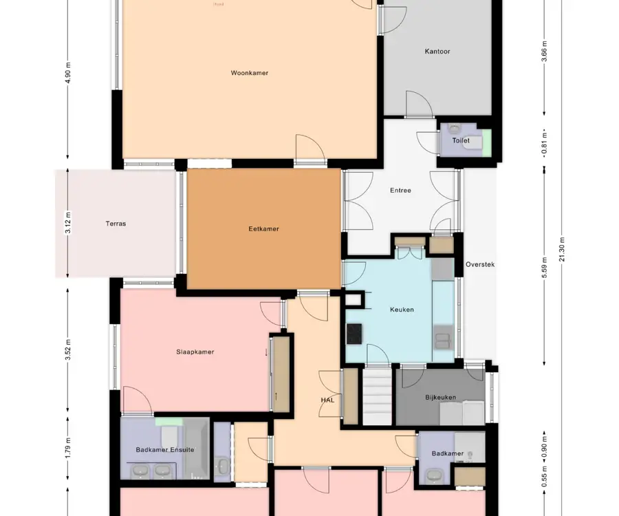 Begane grond: aan de achterzijde van de woning bevindt zich de royale woonkamer (ca. 4.90 x 7.58 m) met sfeervolle haard en een schuifpui naar het terras. De grote raampartijen zorgen voor een zee aan licht en prachtig zicht op de fraaie tuin. Grenzend aan de woonkamer ligt de ruime eetkamer, perfect gepositioneerd tussen de woonkamer en keuken. Hier geniet je met het hele gezin of met gasten van gezellige diners. De keuken is functioneel en biedt veel werk- en kastruimte. Aansluitend bevindt zich een ruime bijkeuken met extra opslagmogelijkheden en toegang tot de tuin. In de hal is een separaat toilet aanwezig. De woning beschikt over vijf ruime slaapkamers waarvan één slaapkamer momenteel in gebruik is als werkkamer. De master bedroom heeft directe toegang tot een badkamer ensuite met dubbele wastafel, bad met douche en toilet. Drie andere slaapkamers liggen aan de voorzijde van de woning en delen een tweede badkamer, voorzien van douche, toilet en wastafel. In totaal beschikt de woning over twee badkamers, waardoor het geschikt is voor een groot gezin of logés.