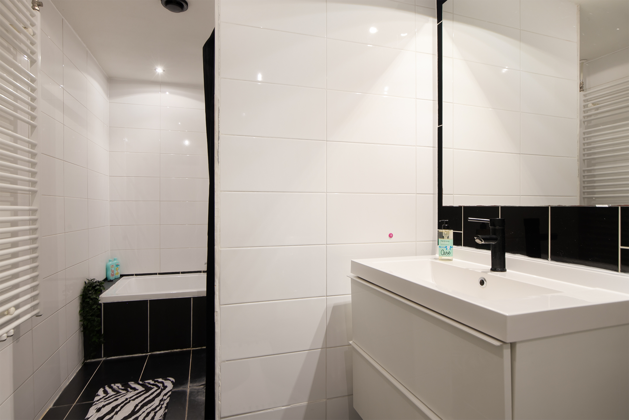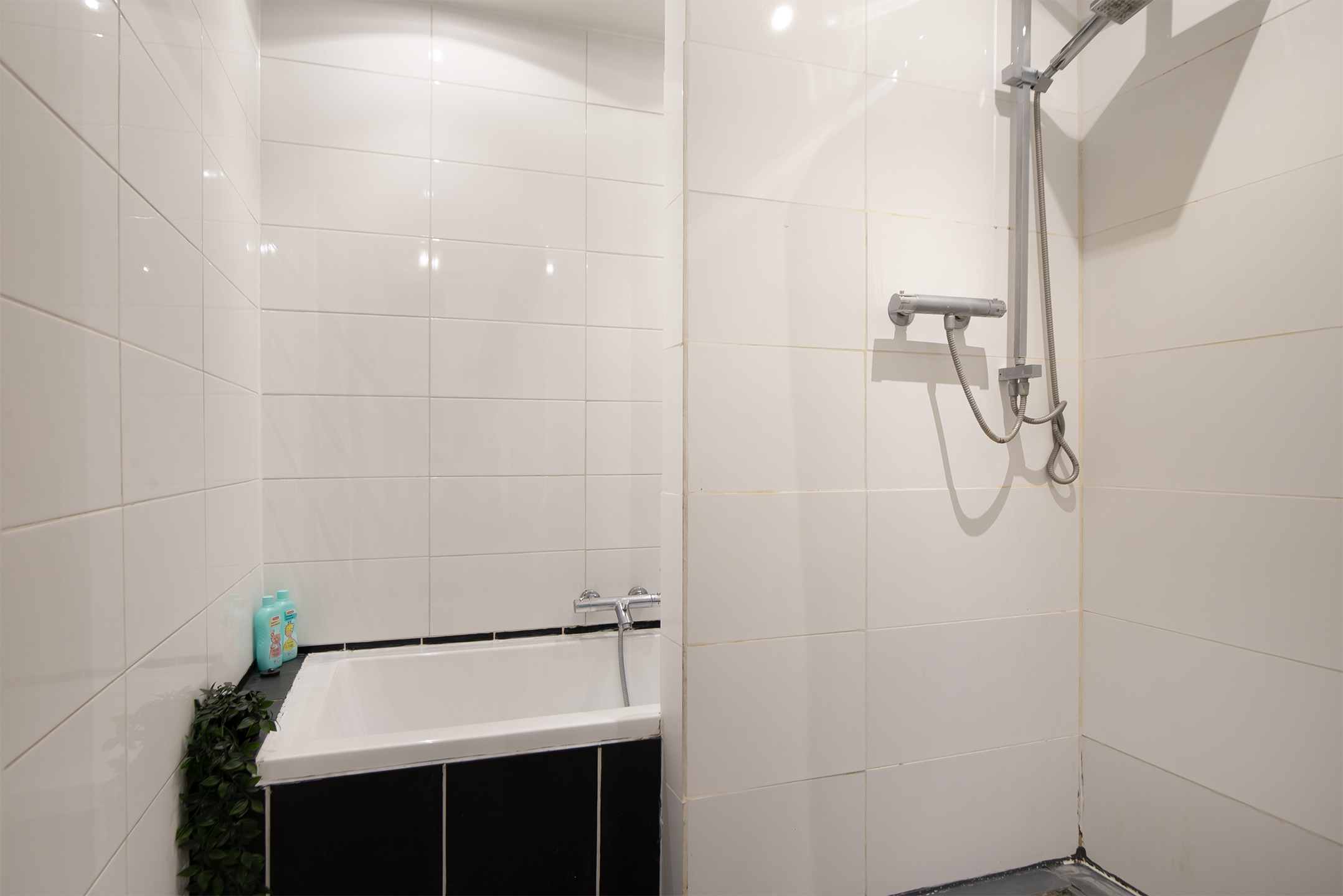 Eerste verdieping: overloop, drie slaapkamers, badkamer voorzien van een toilet, wastafel met bijbehorend meubel, douche en ligbad.