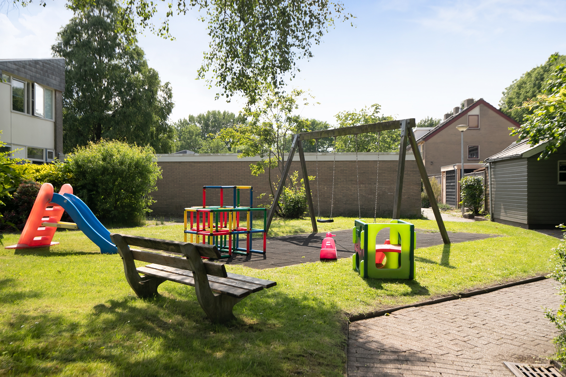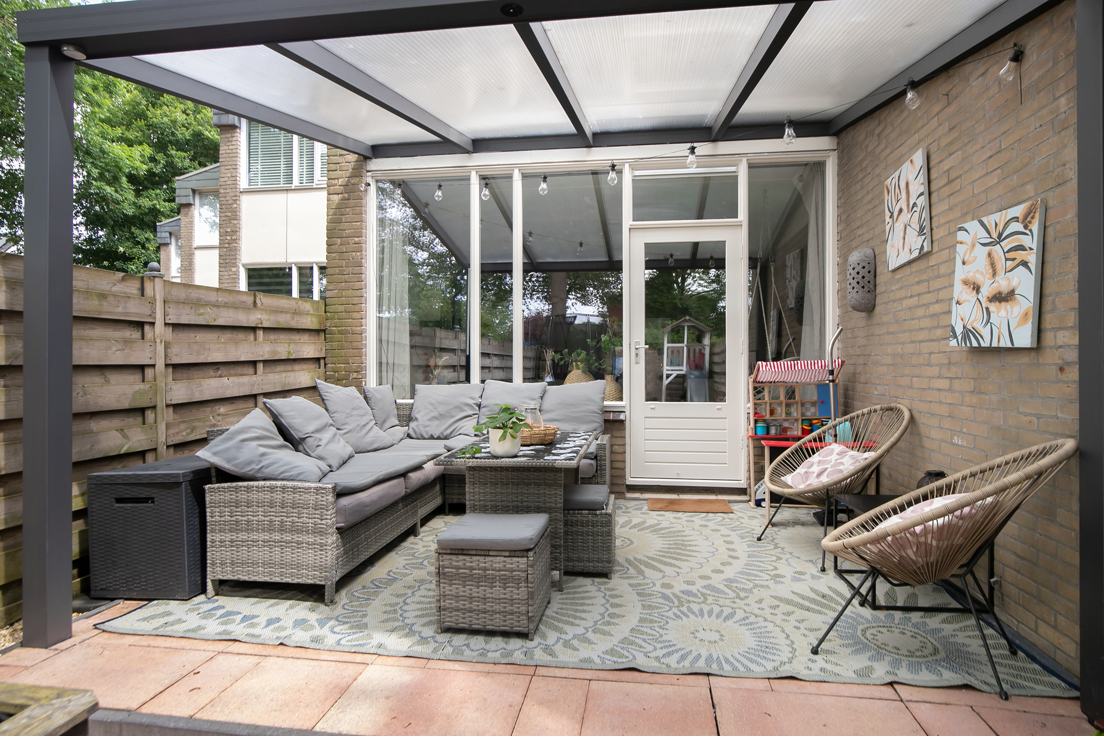 Buiten: onderhoudsarme tuin voorzien van een riante aangebouwde overkapping.