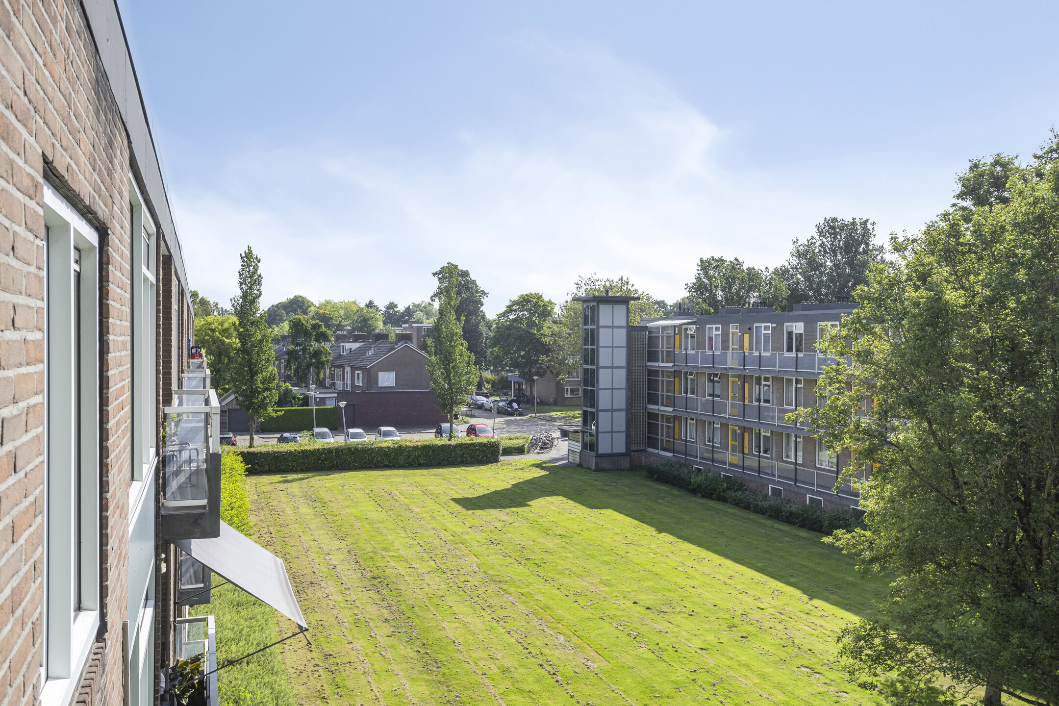 Entree/hal, meterkast en het toilet. Vanuit de hal bereik je de ruime woonkamer voorzien van veel lichtinval door de grote raampartijen op het zuiden. De woonkamer is zo groot dat er ook een eetgedeelte is welke toegang geeft tot het ruime balkon. Het balkon is gelegen op het zuiden, waardoor je heerlijk van de zon en het uitzicht op het vele groen kunt genieten. Mogelijkheden zijn aanwezig om van het eetgedeelte een extra slaapkamer te creëren. Het appartement beschikt over twee slaapkamers, beiden voorzien van inbouwkasten. De keuken betreft een gesloten keukenopstelling. De keuken beschikt over meerdere inbouwkasten waarvan één inbouwkast met de cv opstelling en de andere inbouwkast is voorzien van de witgoedopstelling. De badkamer is praktisch ingedeeld en voorzien van wastafel en douche.